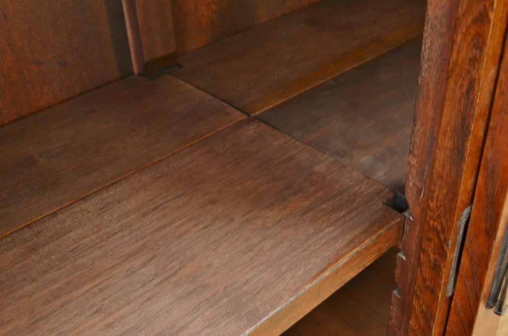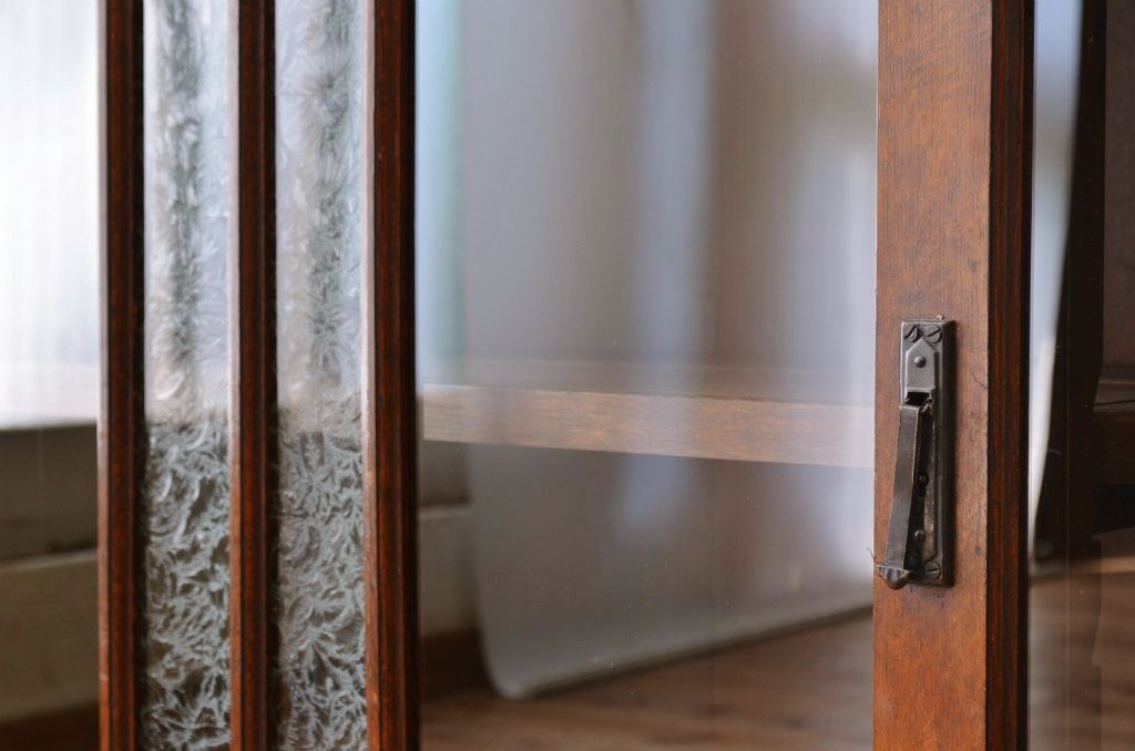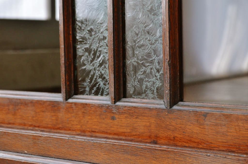 古いナラ材の上質な結霜ガラスアンティーク食器棚です。