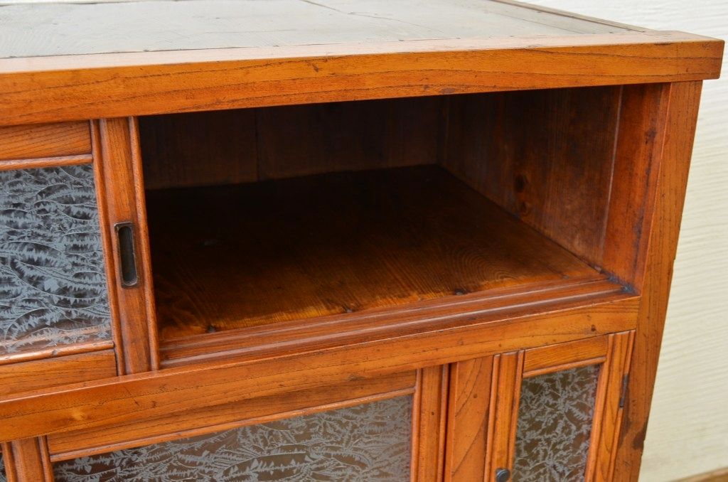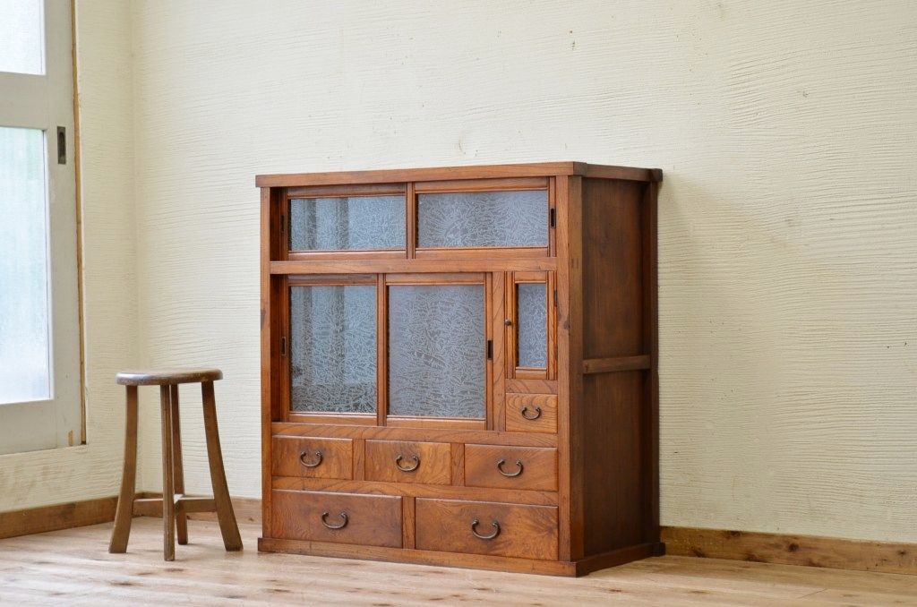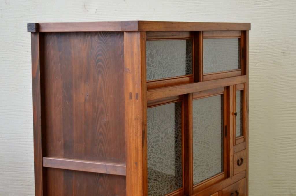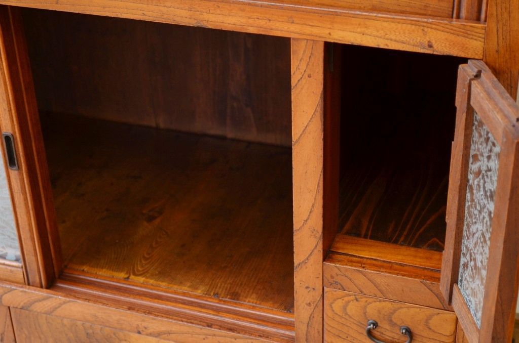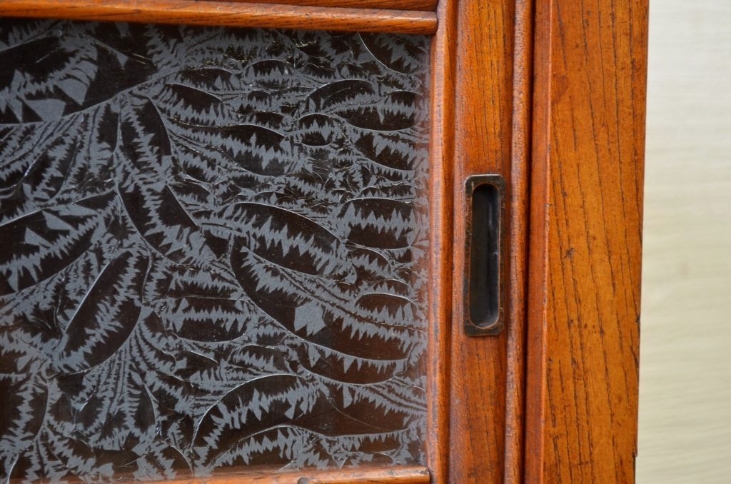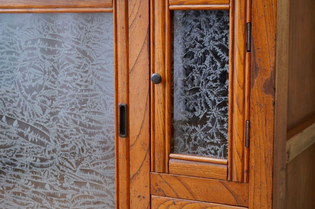 アンティーク家具 前面欅!上質な結霜ガラス収納棚(食器棚)