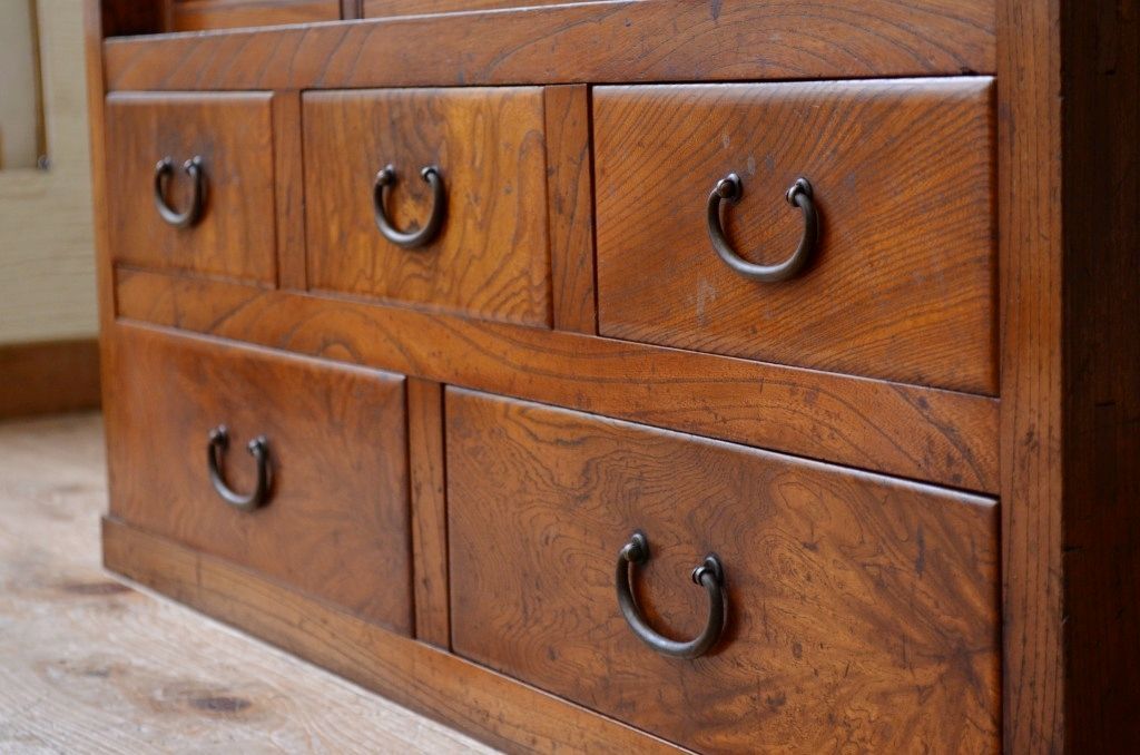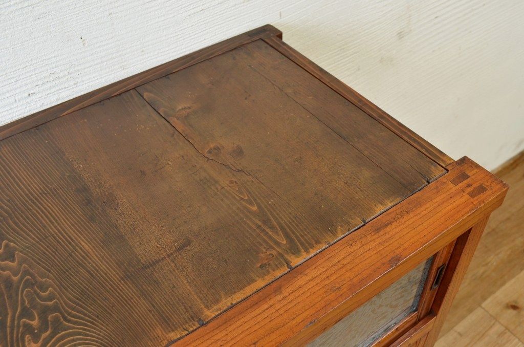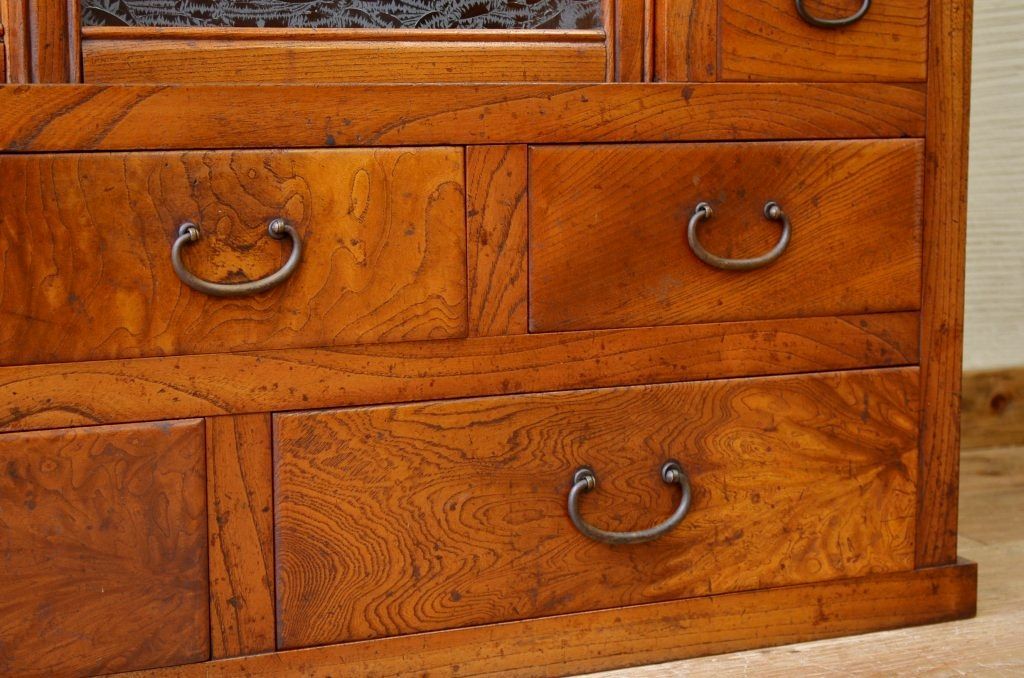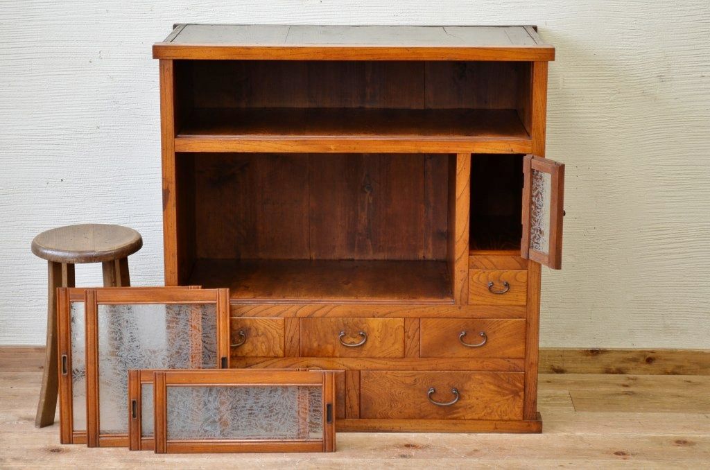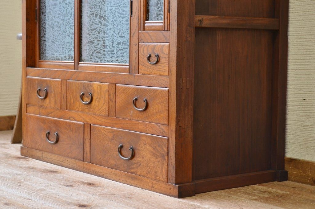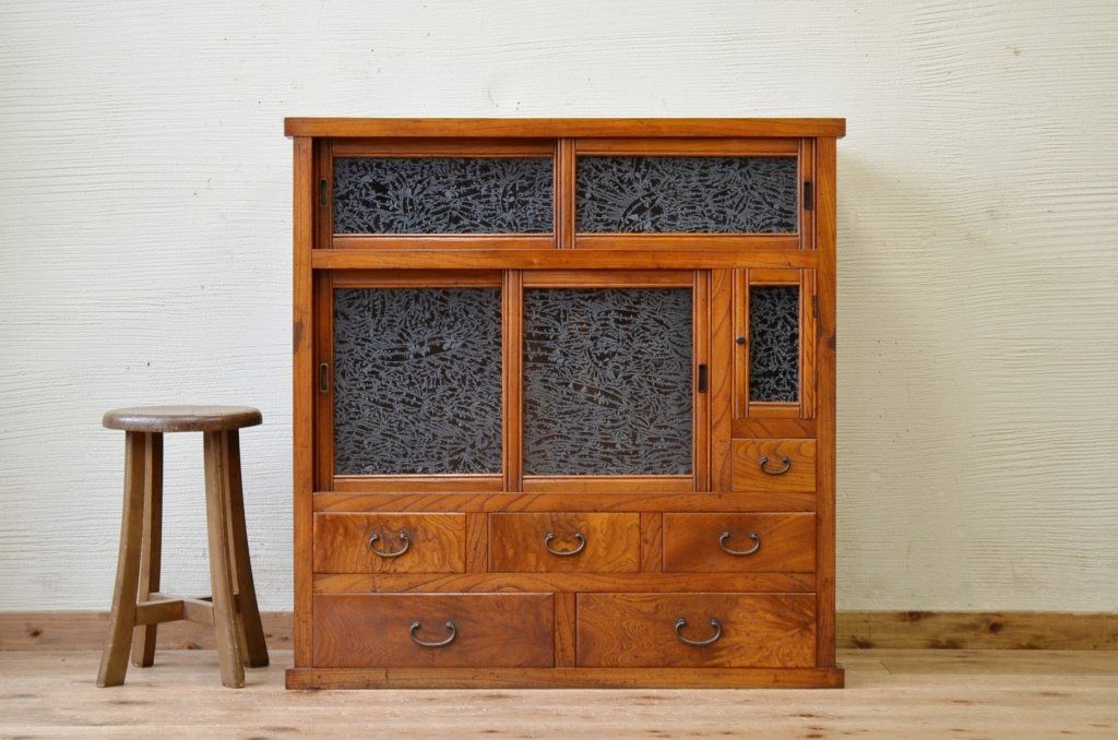 アンティーク家具 前面欅!上質な結霜ガラス収納棚(食器棚)