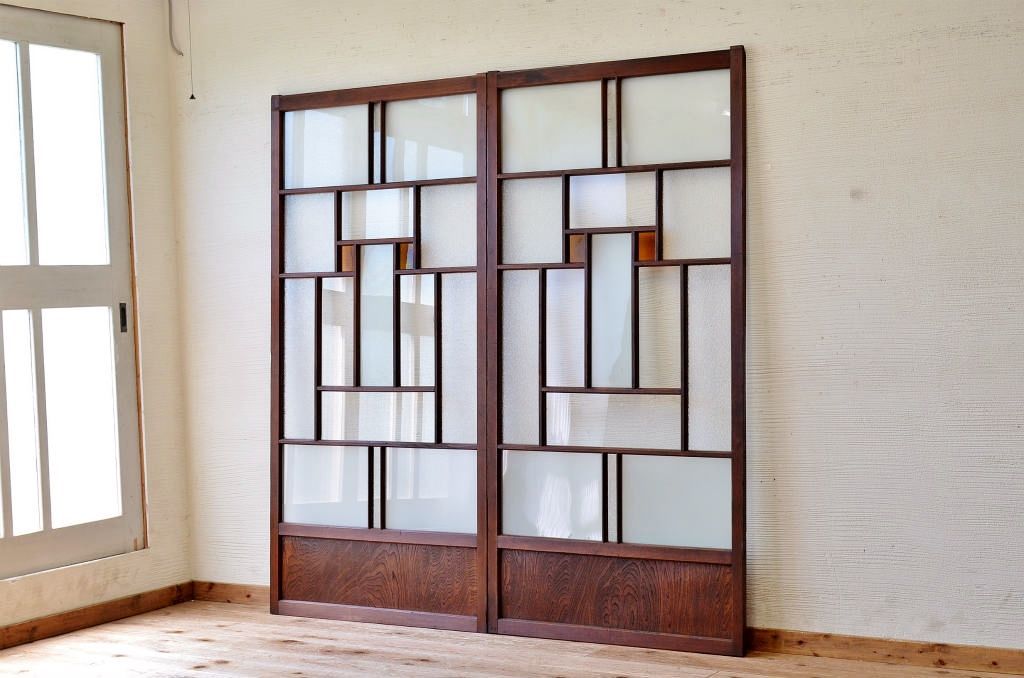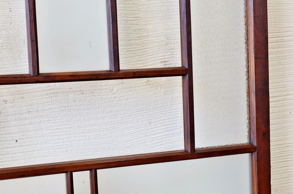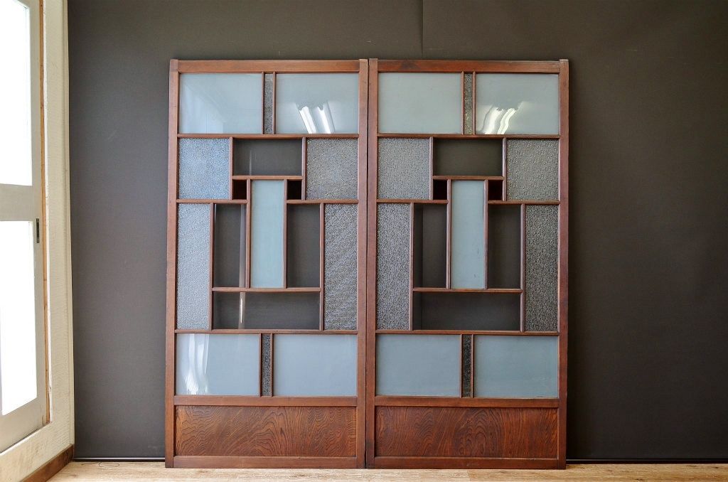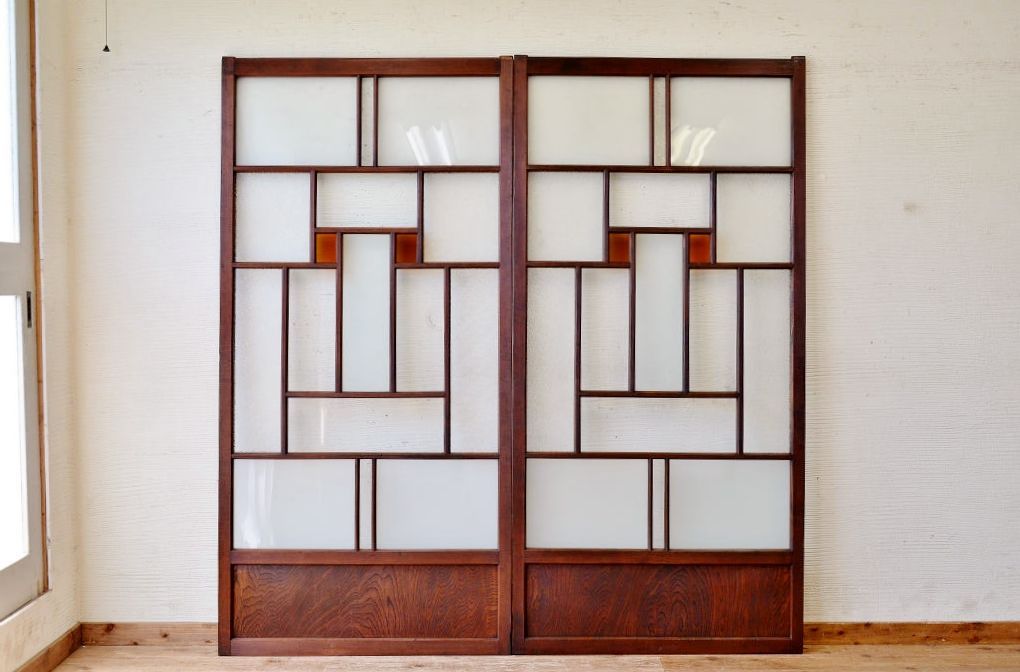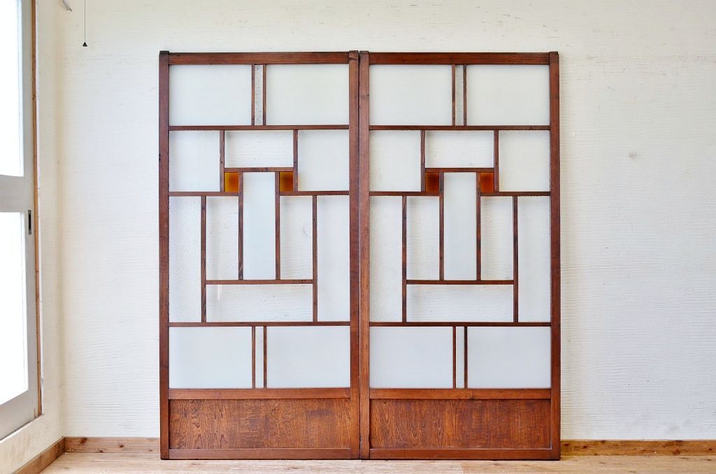 色ガラス入りのアンティーク引き戸(ガラス戸)2枚セット