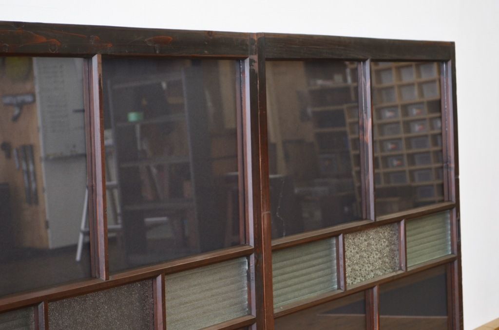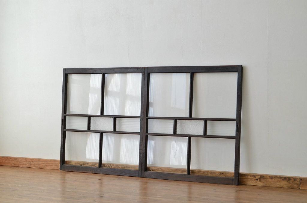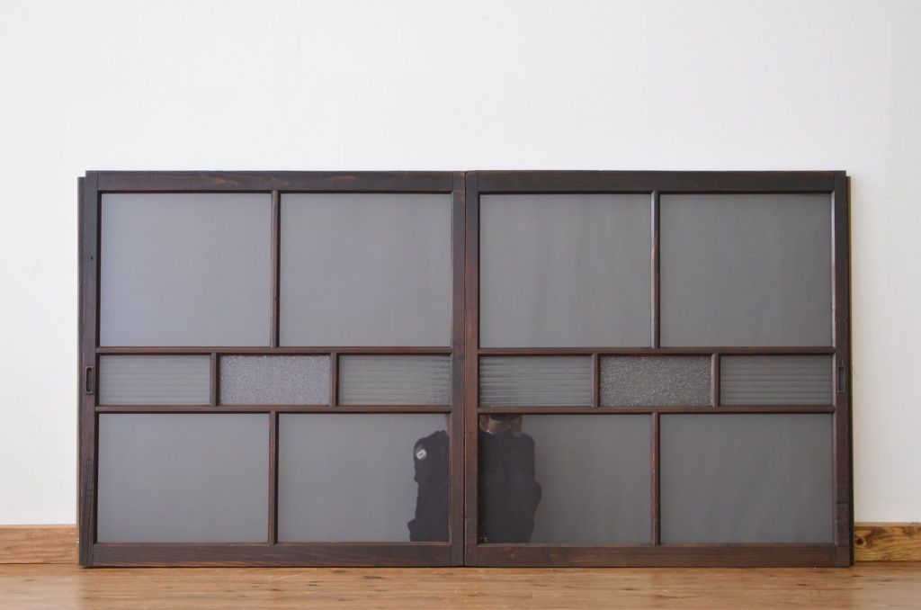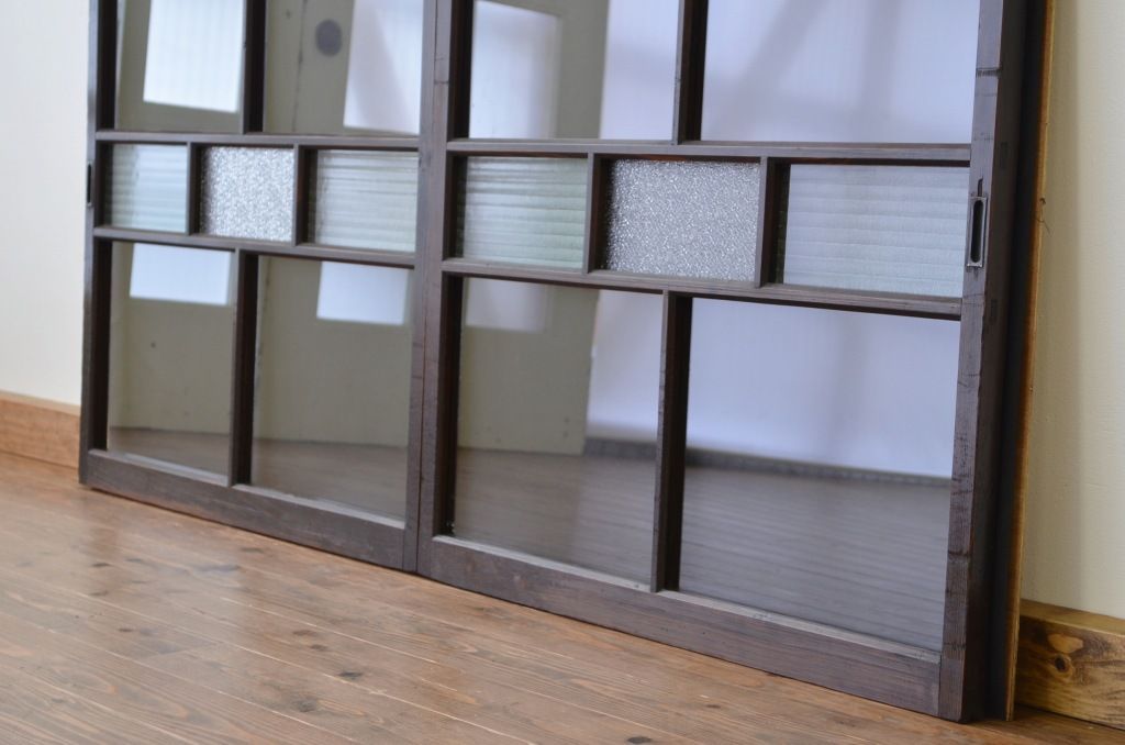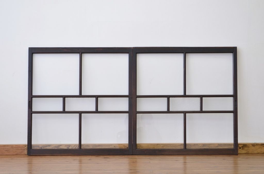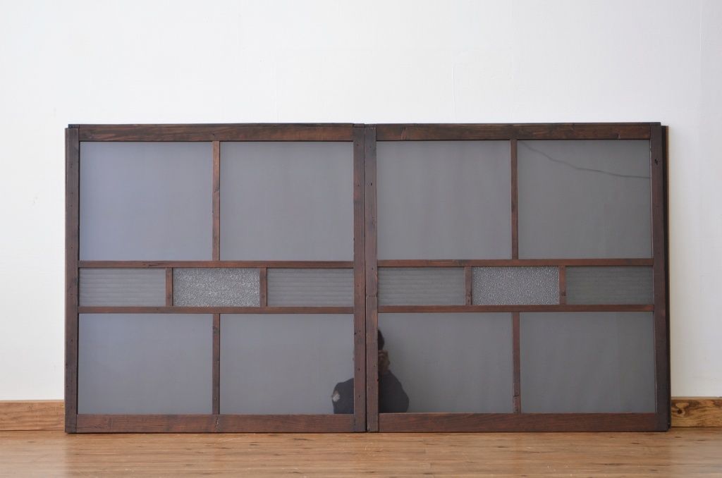 アンティーク 古い木のダイヤと銀モールガラスが入った窓2枚セット(引き戸、ガラス戸)