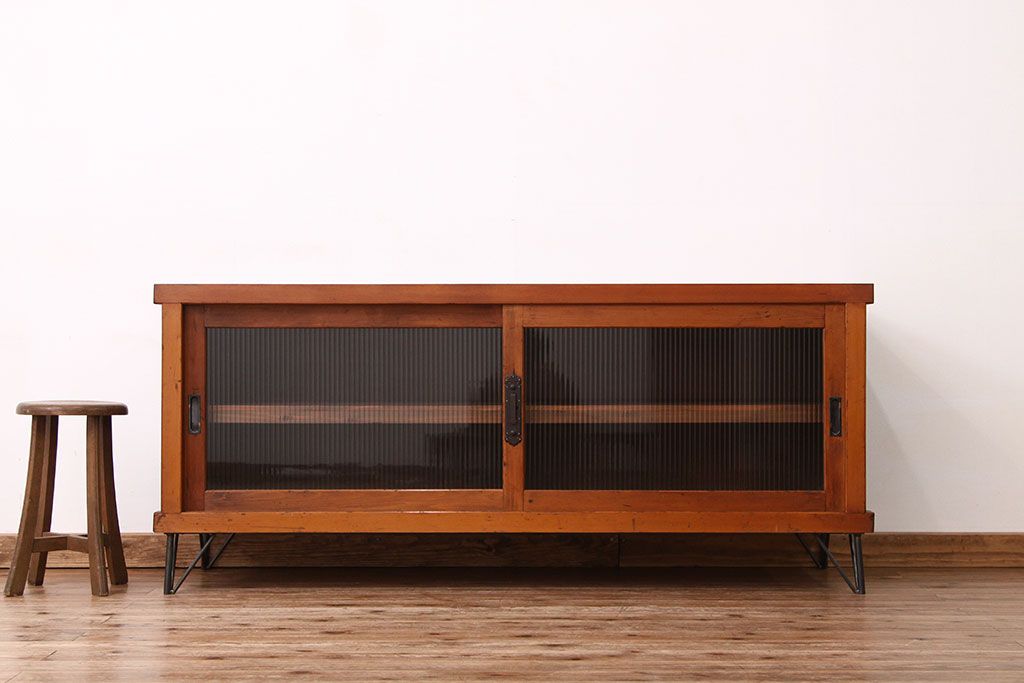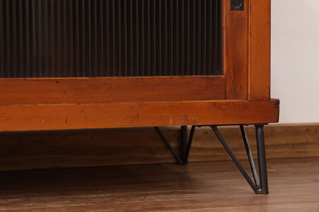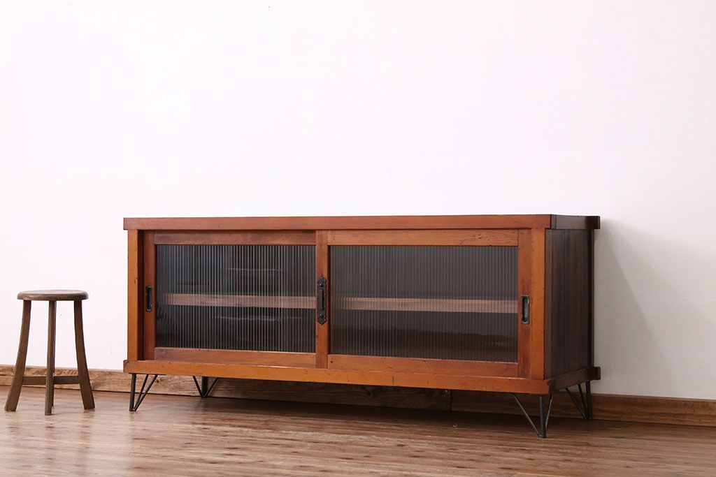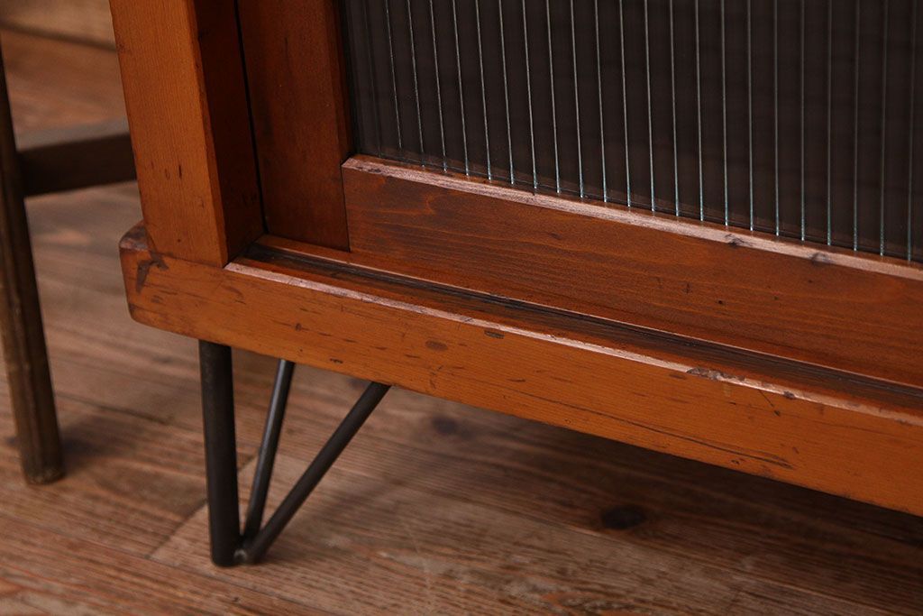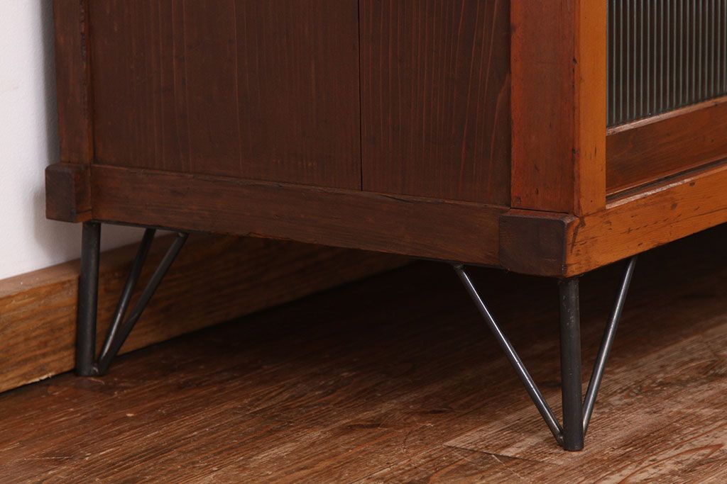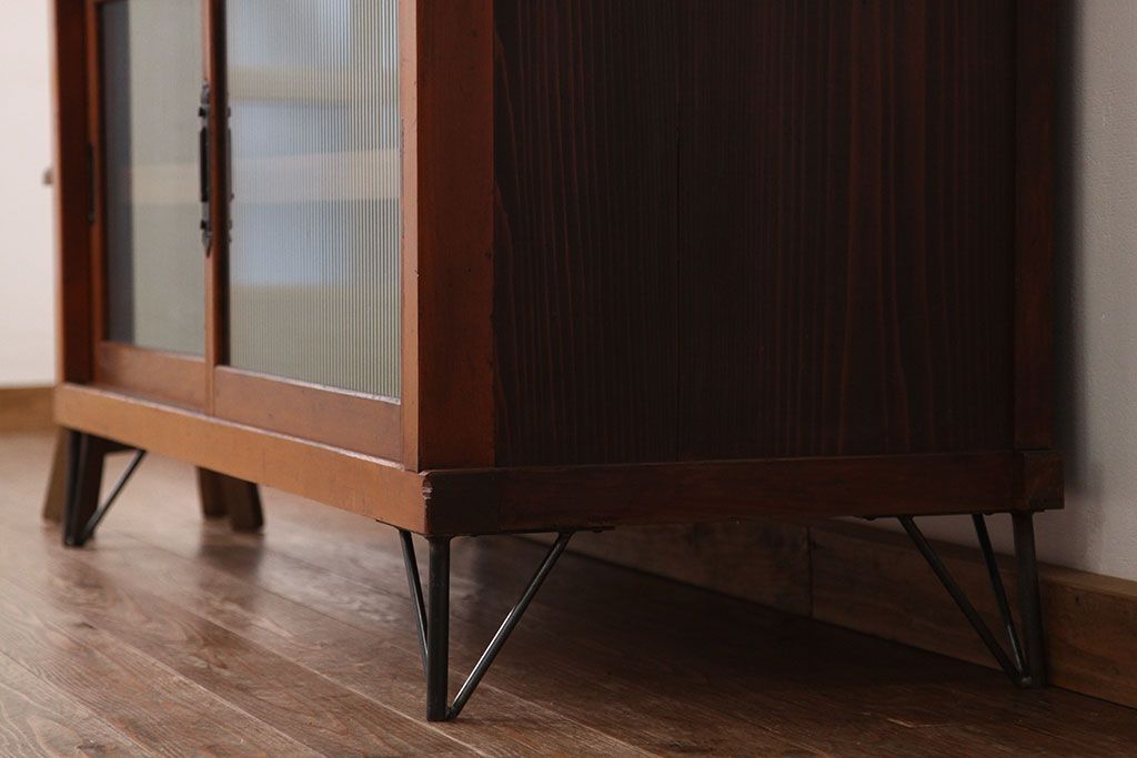 アンティーク家具 アンティーク 古い木のモールガラス入り鉄脚付き収納棚(ローボード)