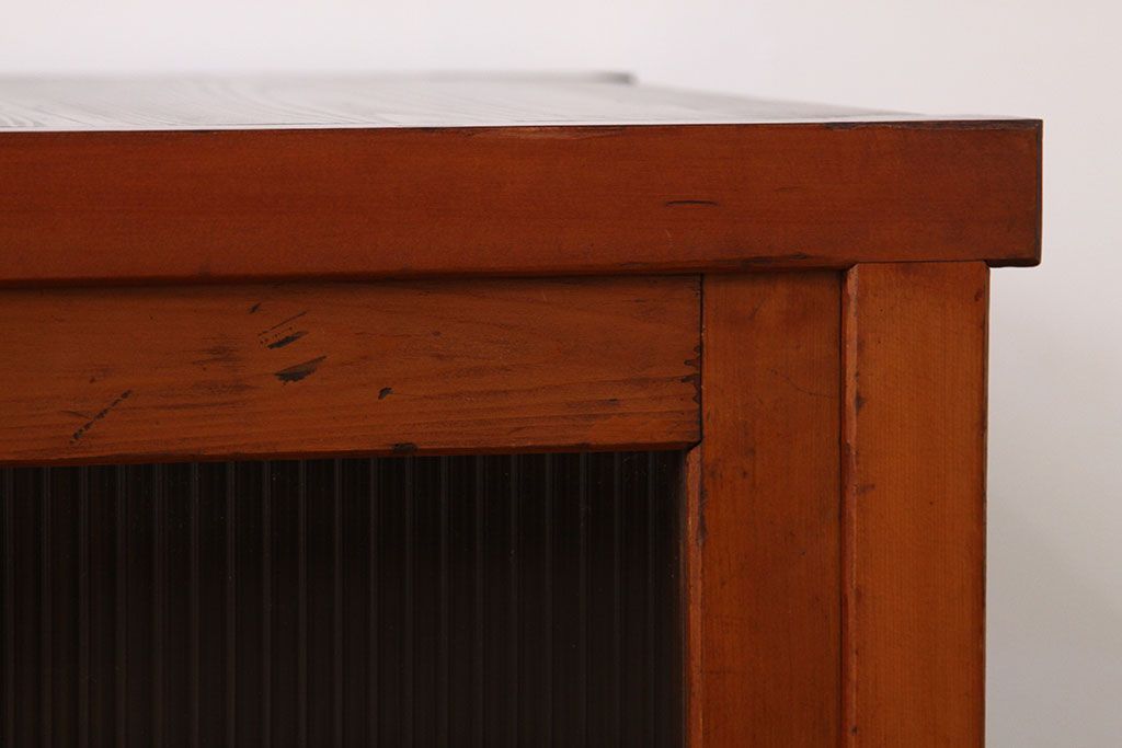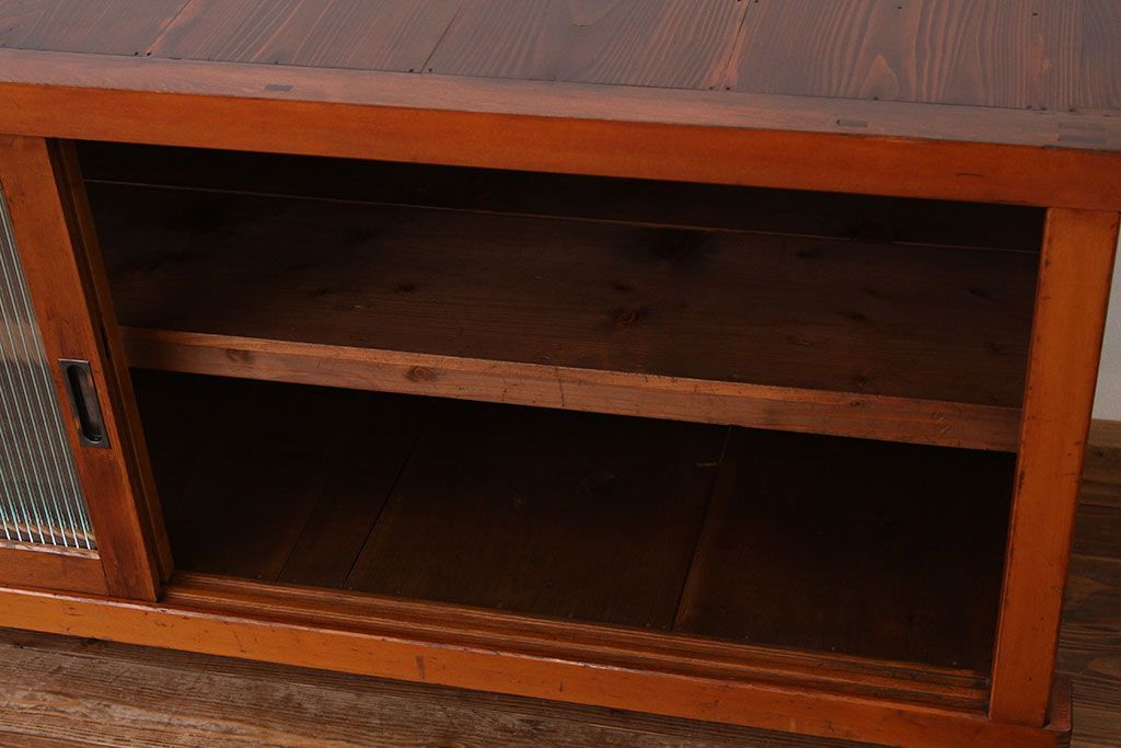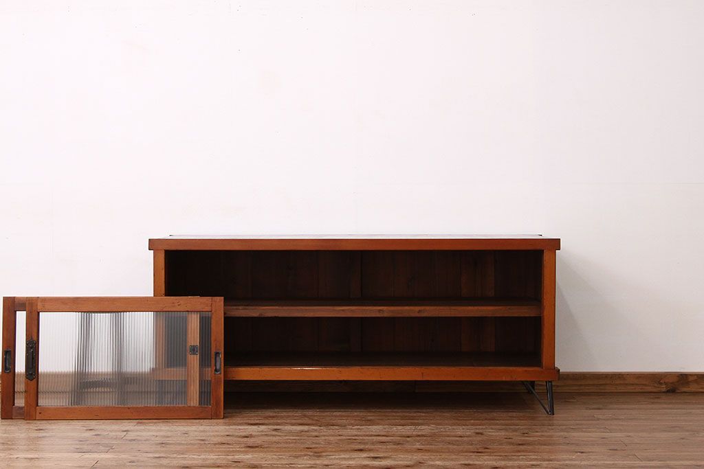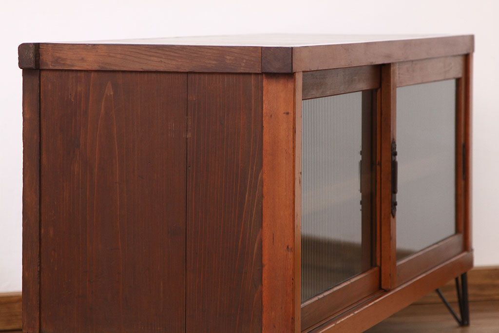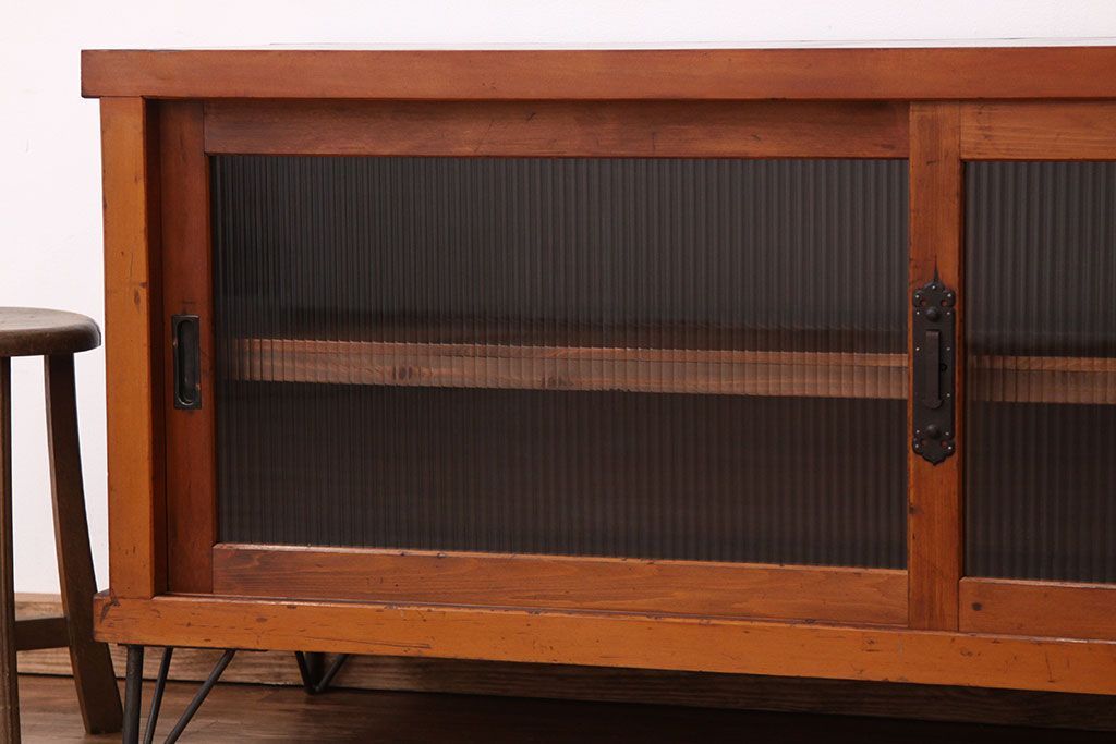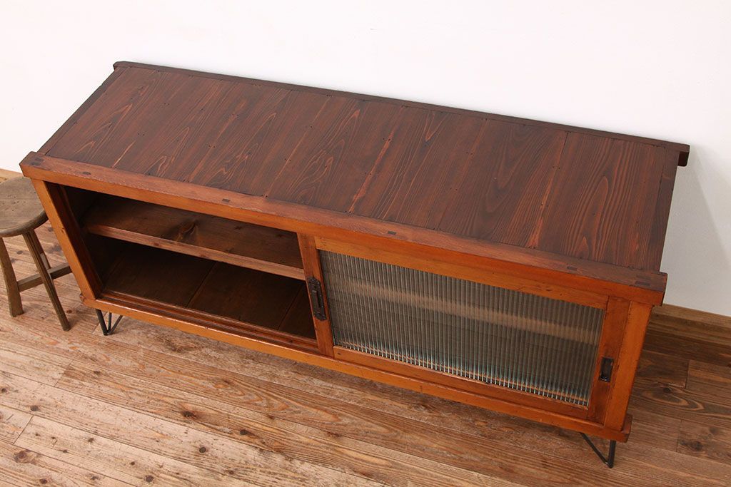 アンティーク 古い木のモールガラス入り鉄脚付き収納棚(ローボード)です。