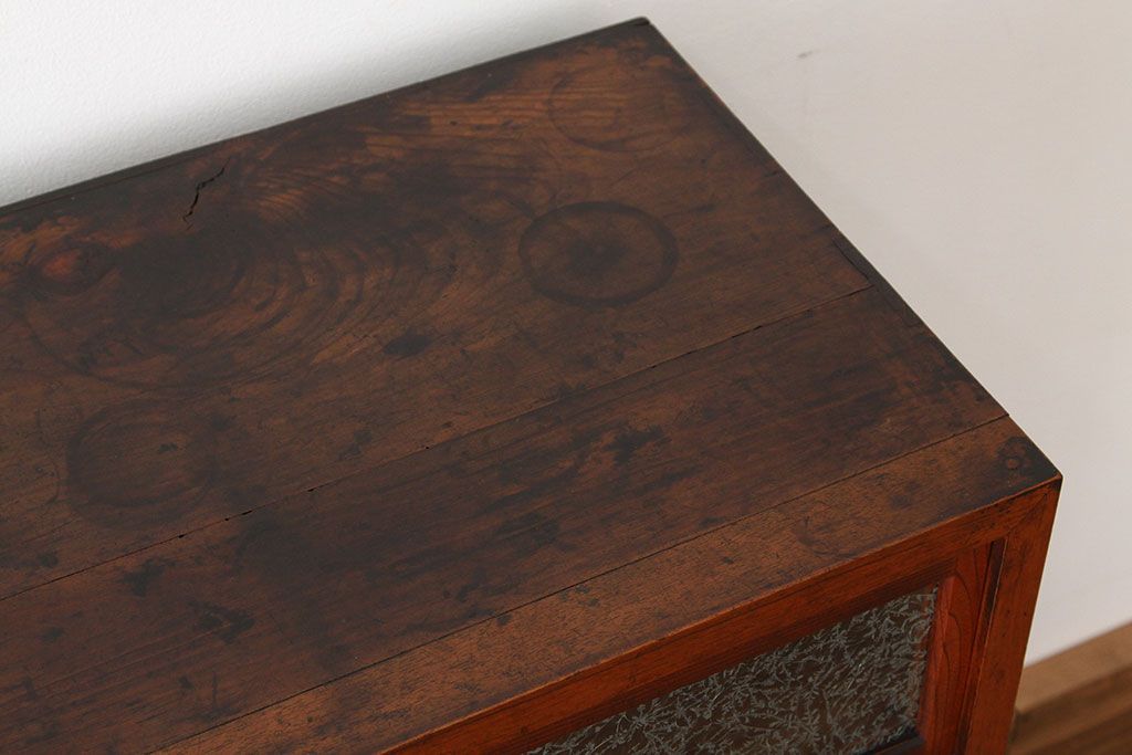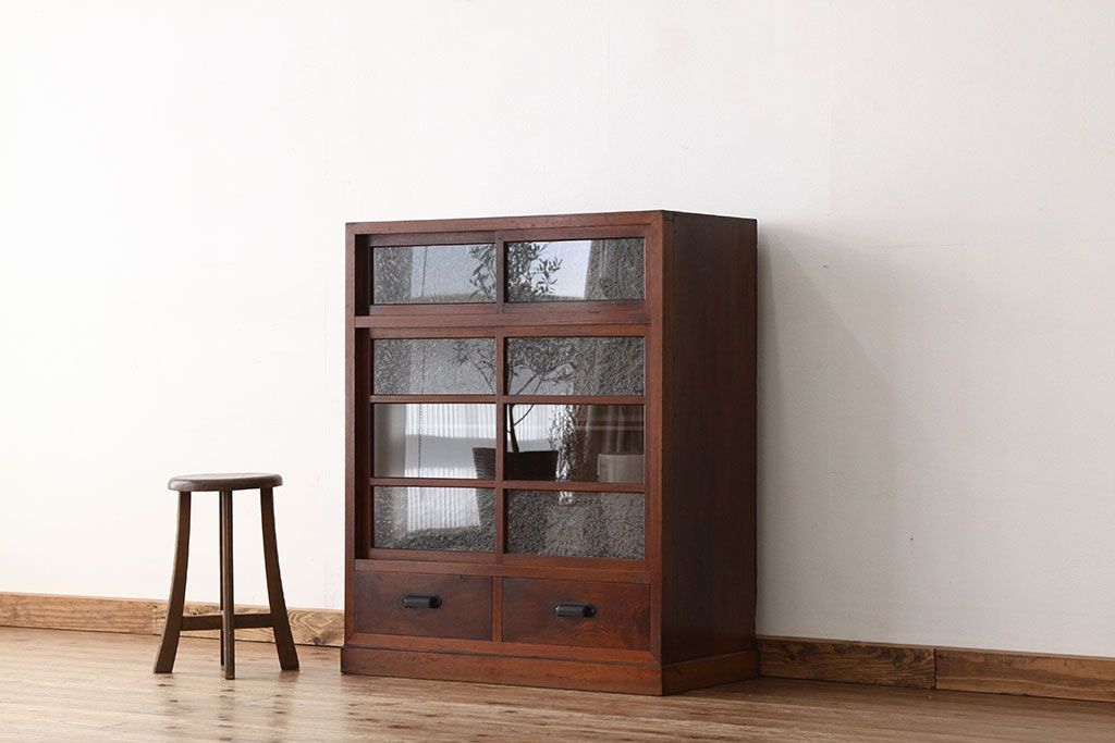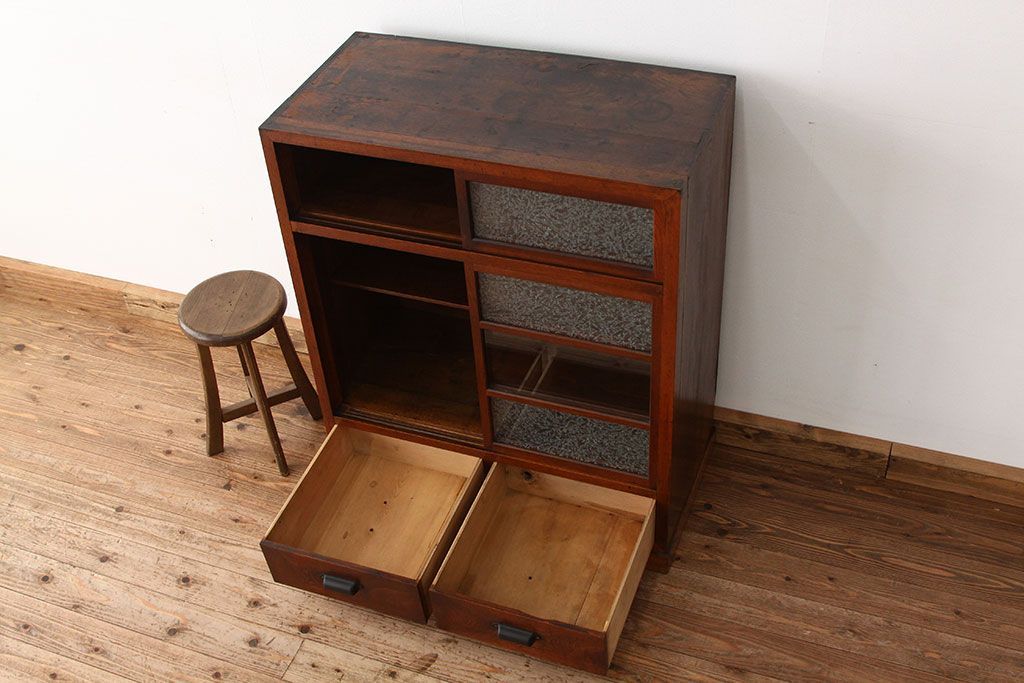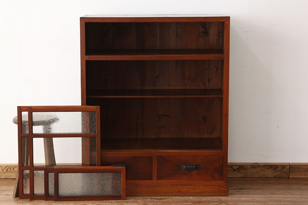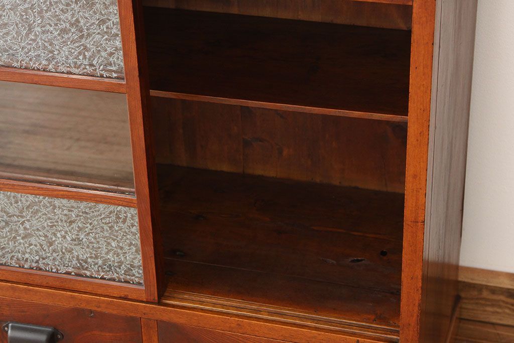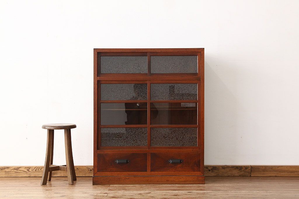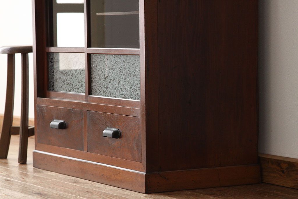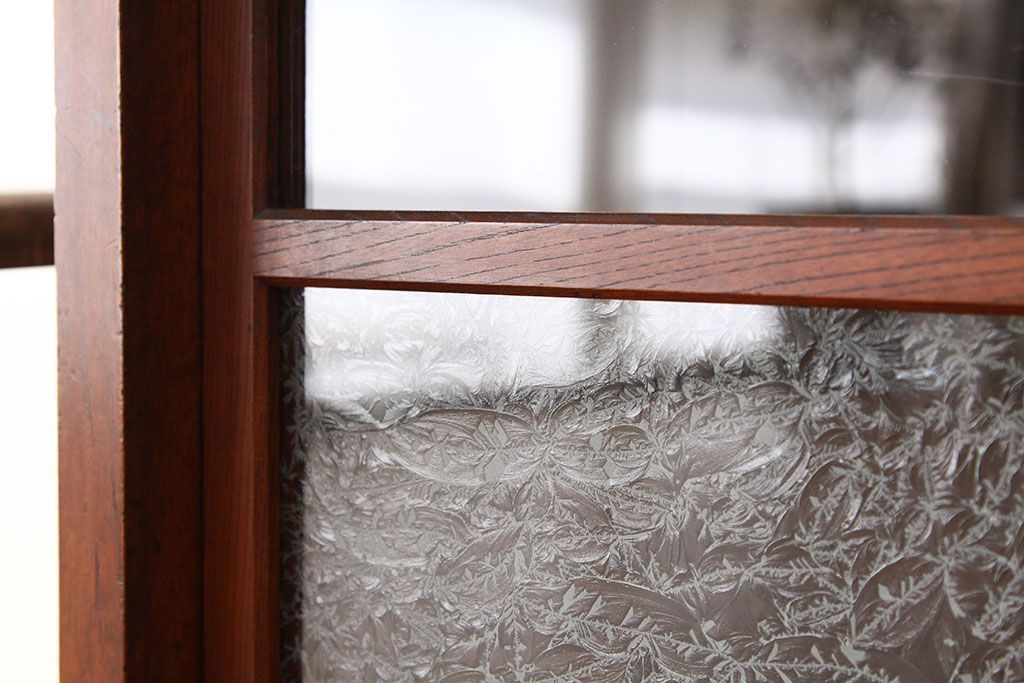 アンティーク家具 アンティーク 古い木の結霜ガラス入り収納棚