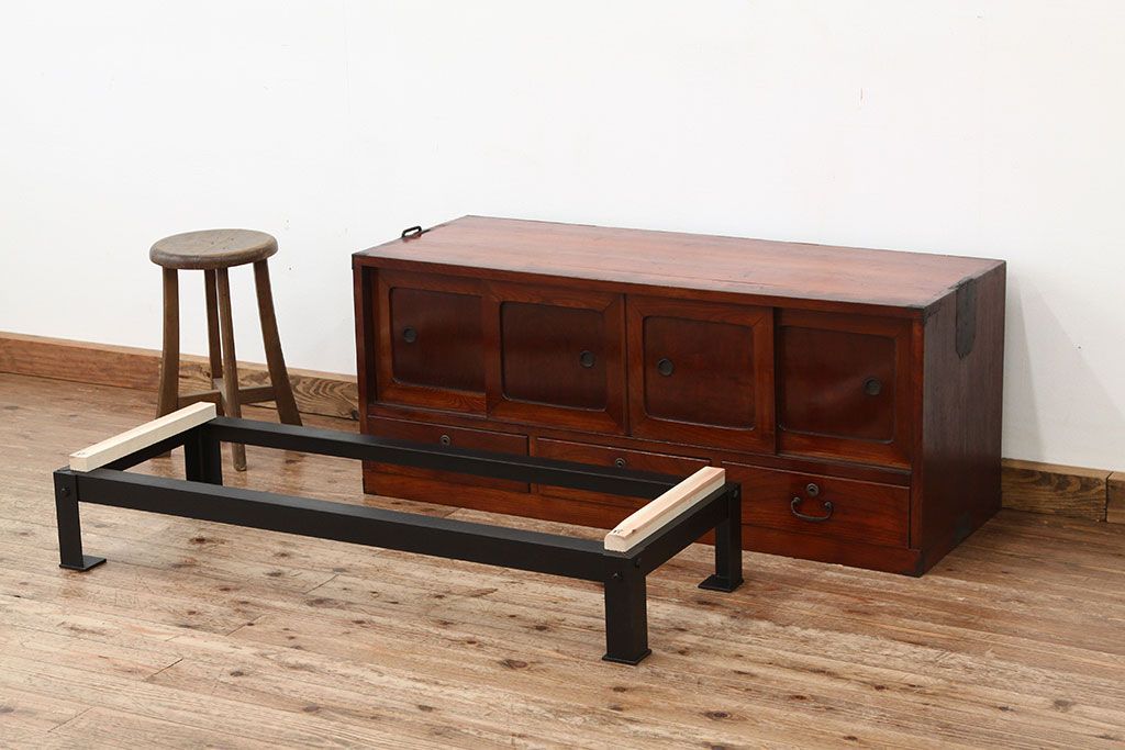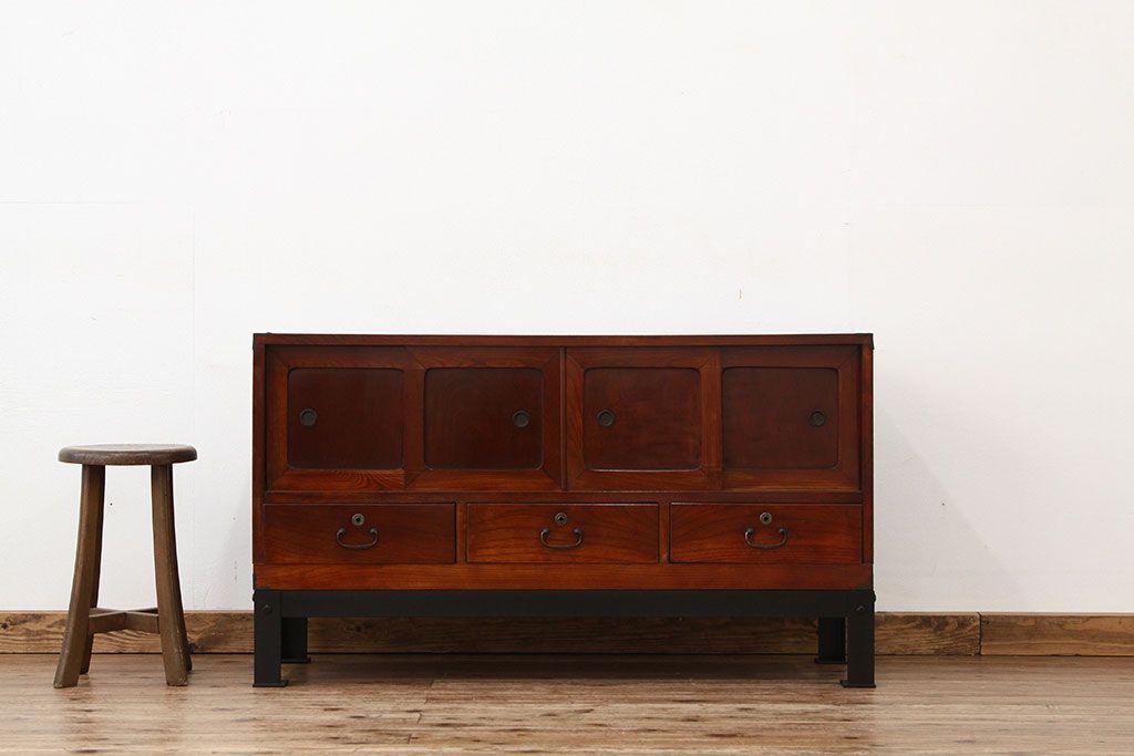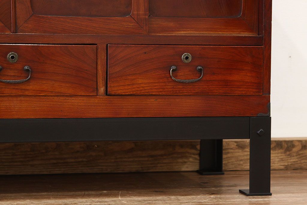 アンティーク 前欅アイアンスタンド付きローボード(鉄脚・箪笥・リビングボード)です。