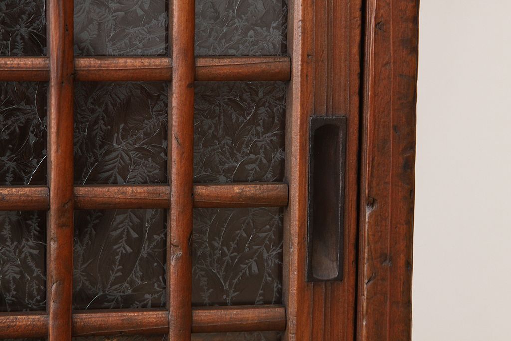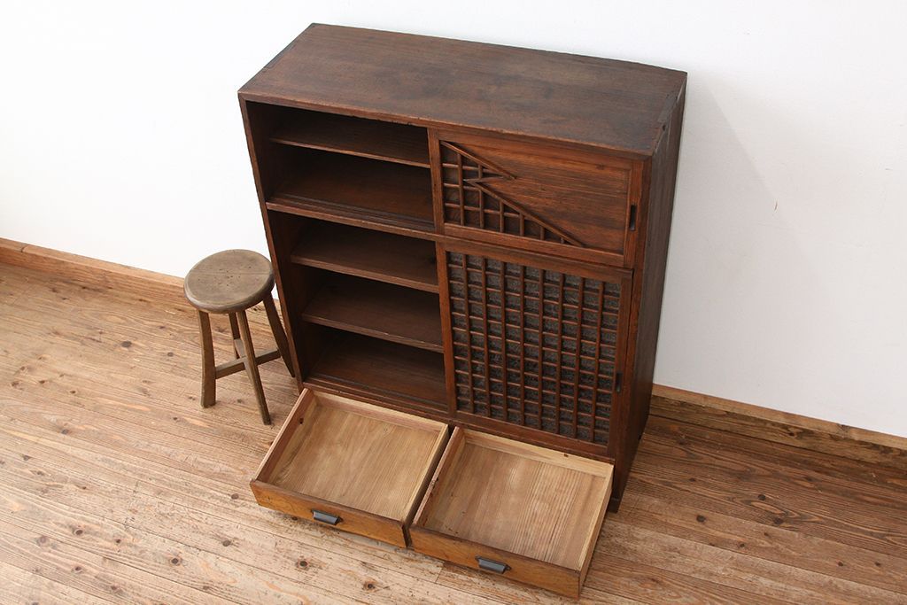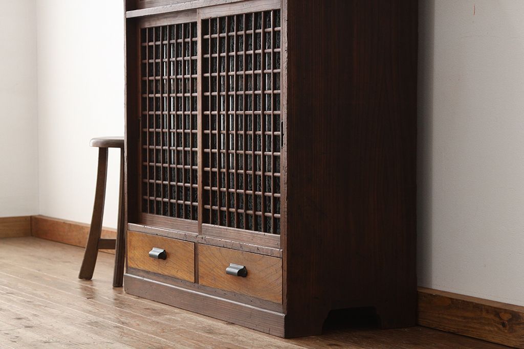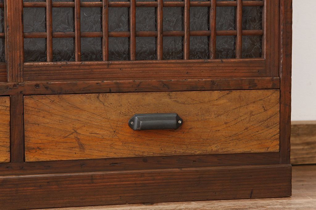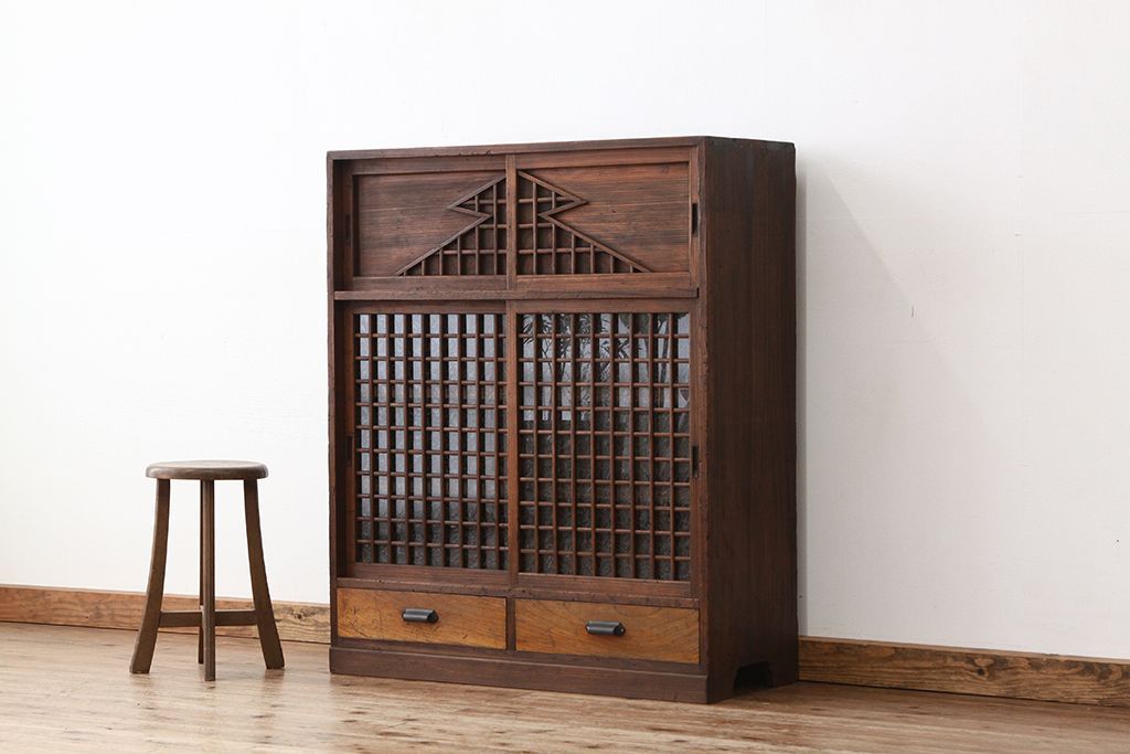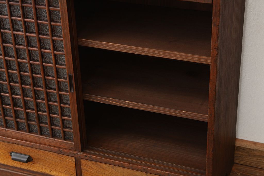 アンティーク家具 アンティーク 素敵なデザイン!格子引き戸の結霜ガラス下駄箱(収納棚)