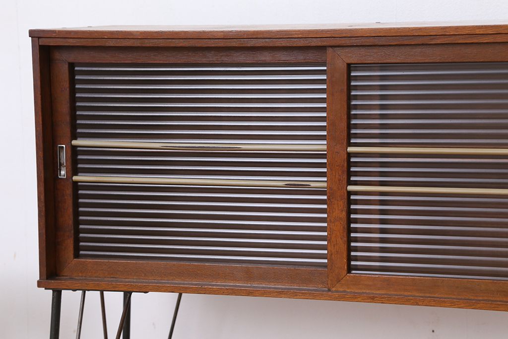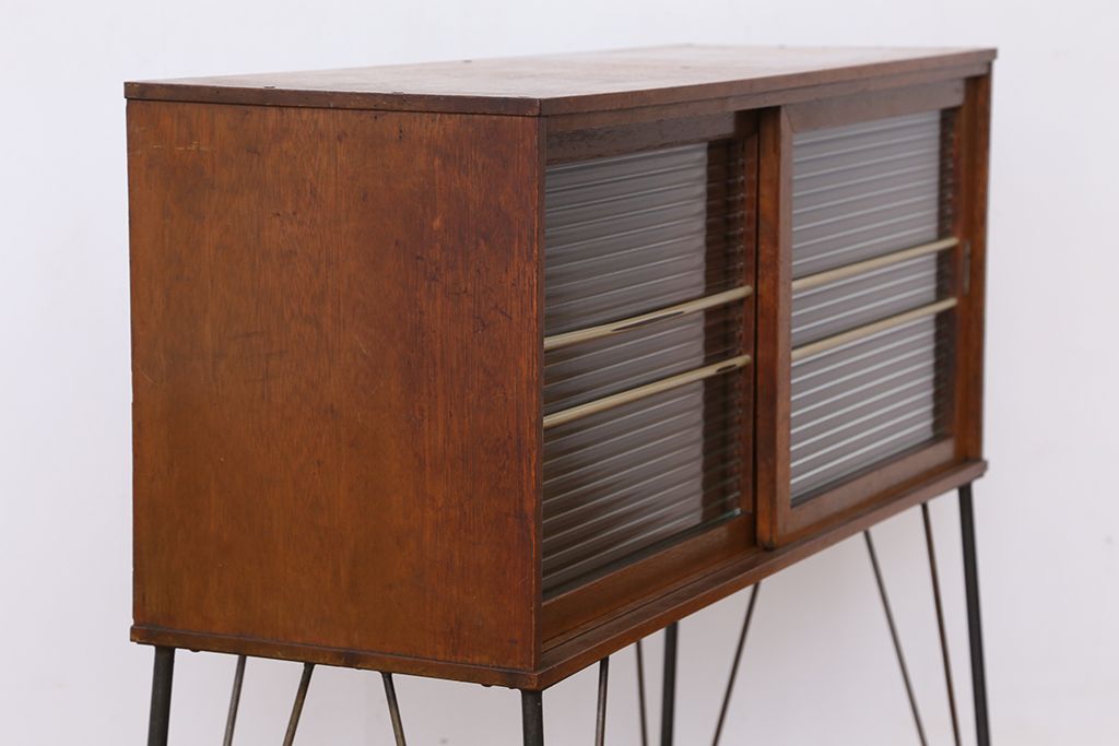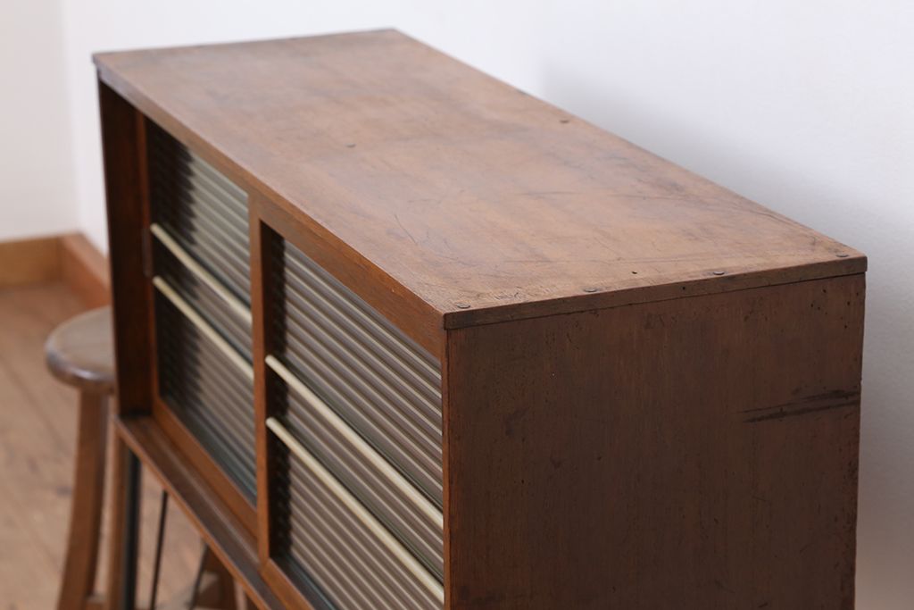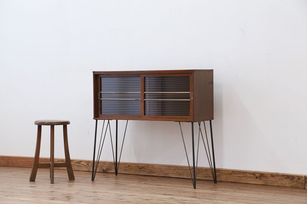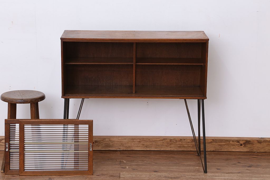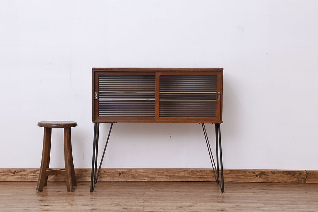 アンティーク 素敵なデザイン!モールガラス鉄脚の収納棚です(A18673)。