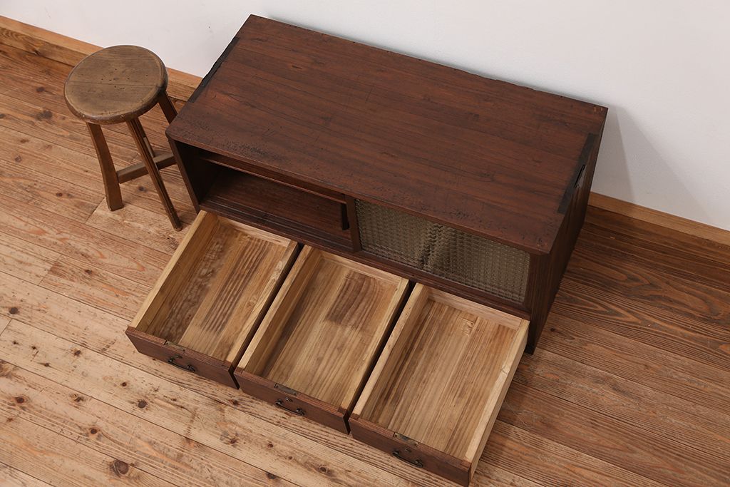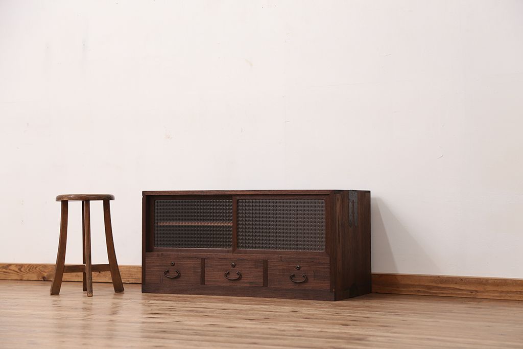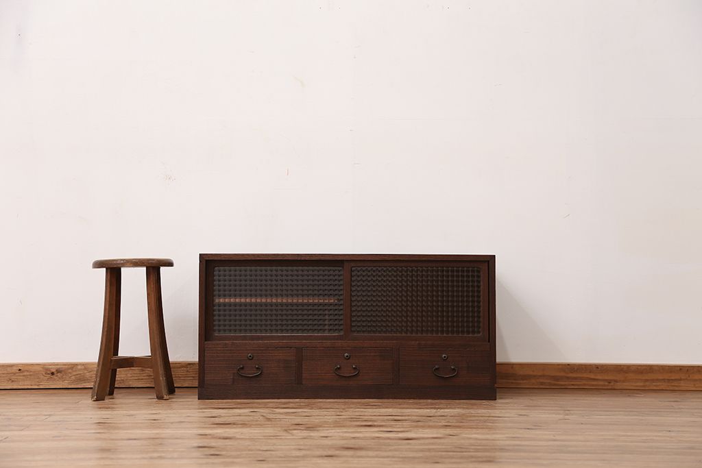 アンティーク 可愛いデザイン!古い木のチェッカーガラスローボード(収納棚)です。