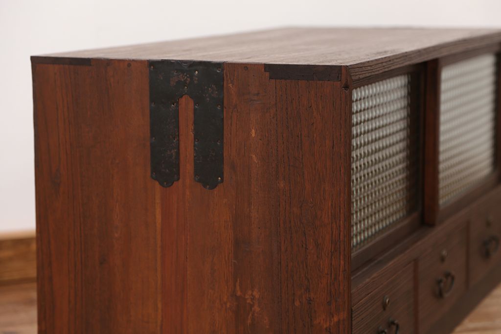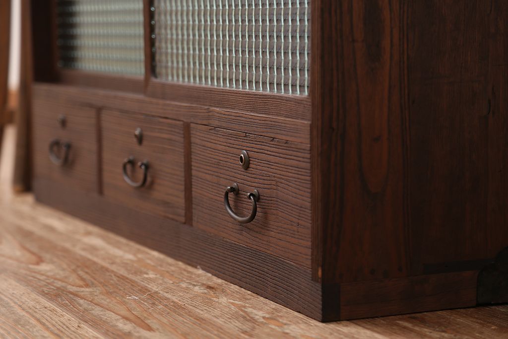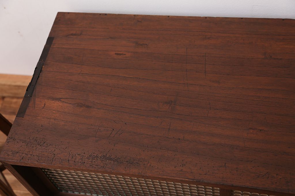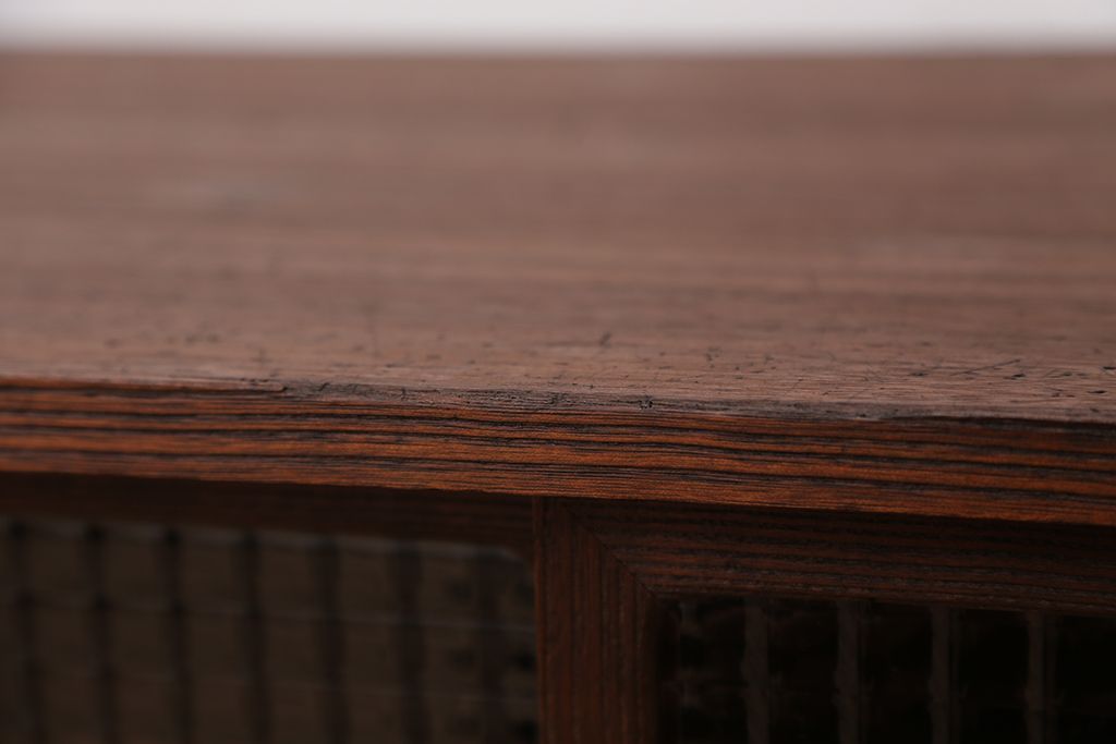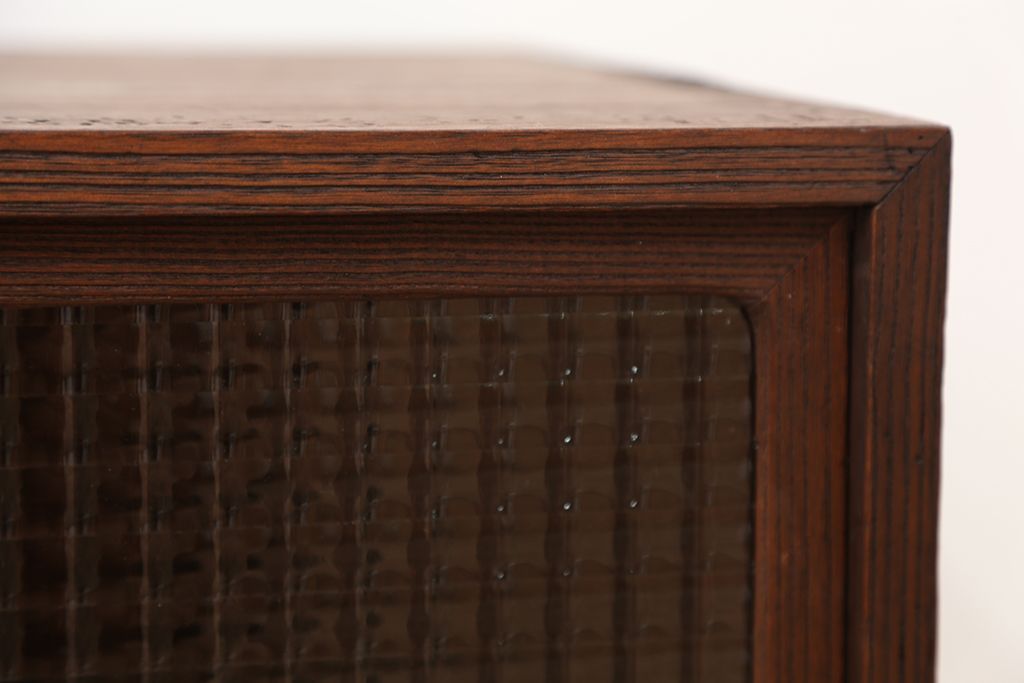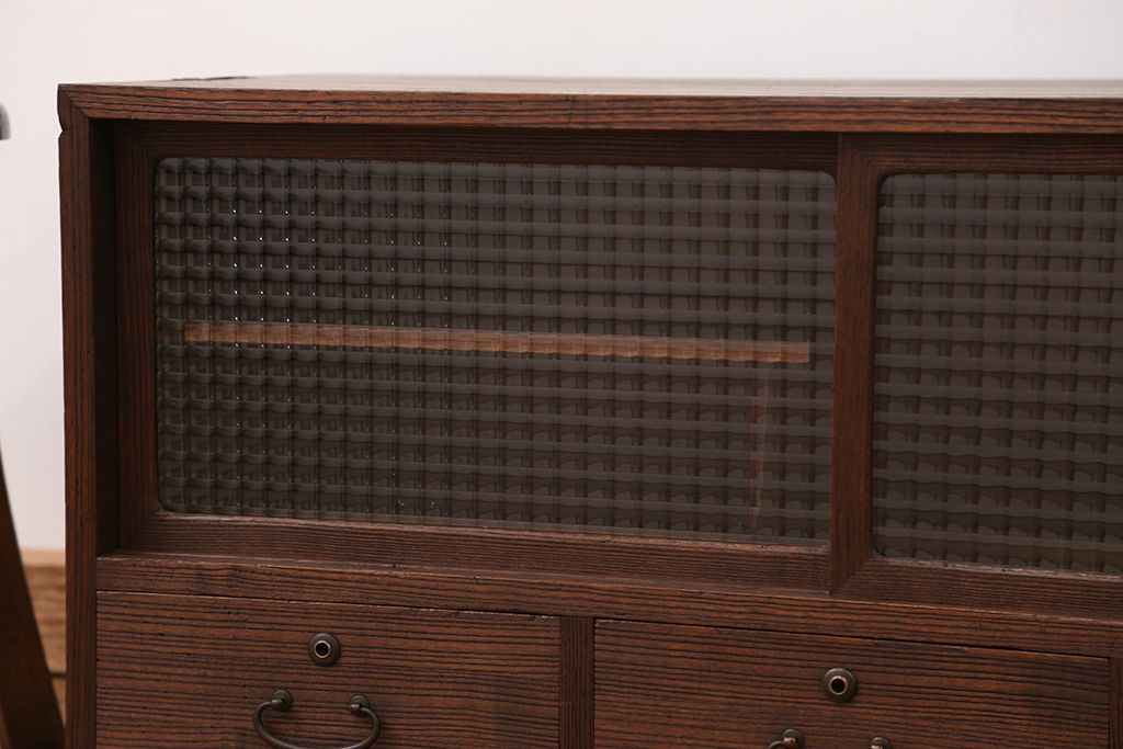 アンティーク家具 アンティーク 可愛いデザイン!古い木のチェッカーガラスローボード(収納棚)