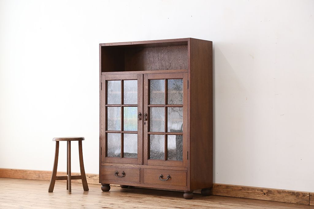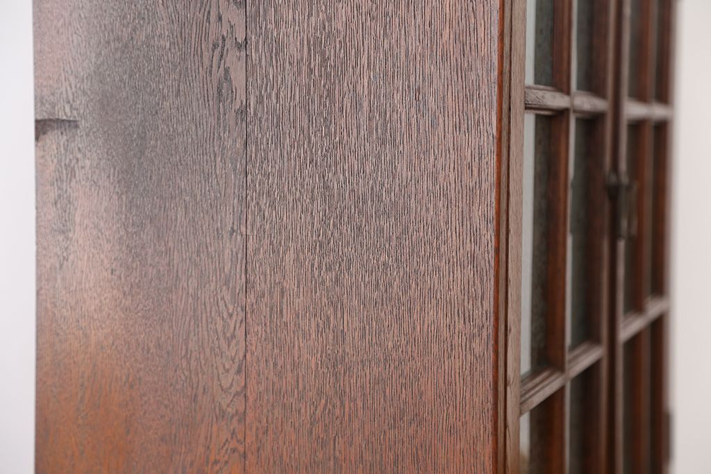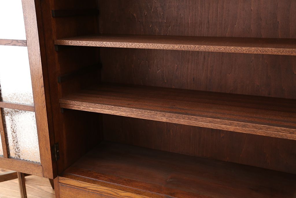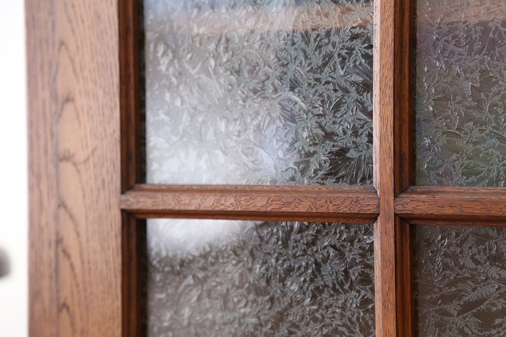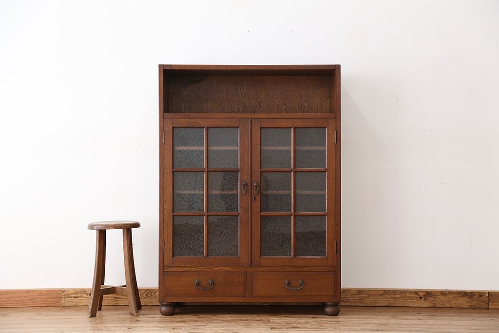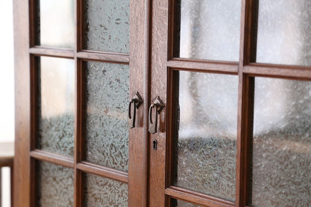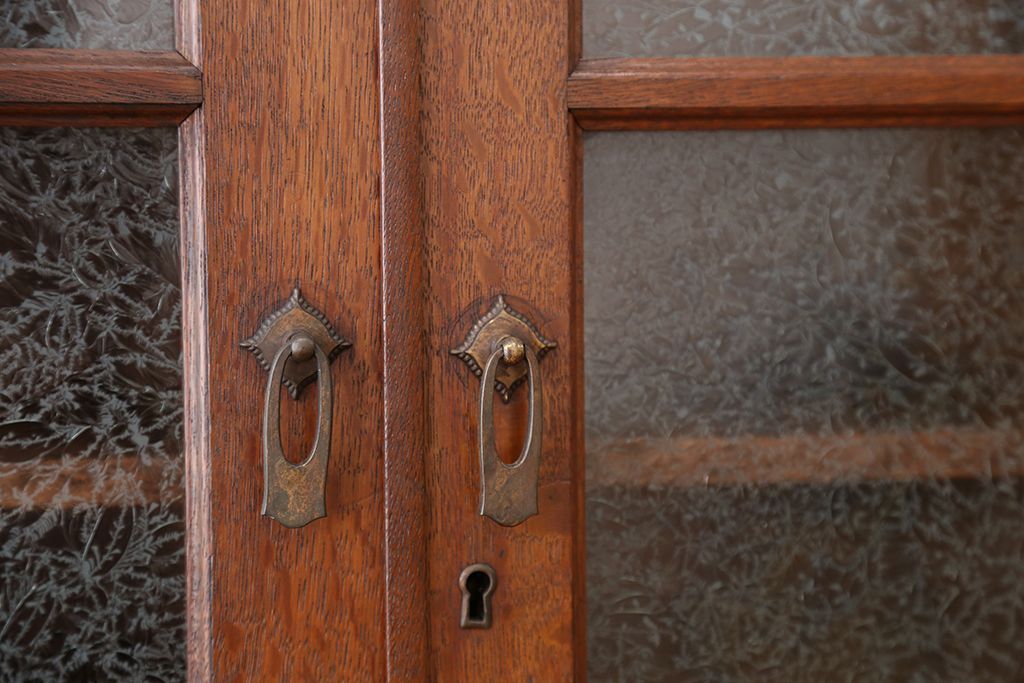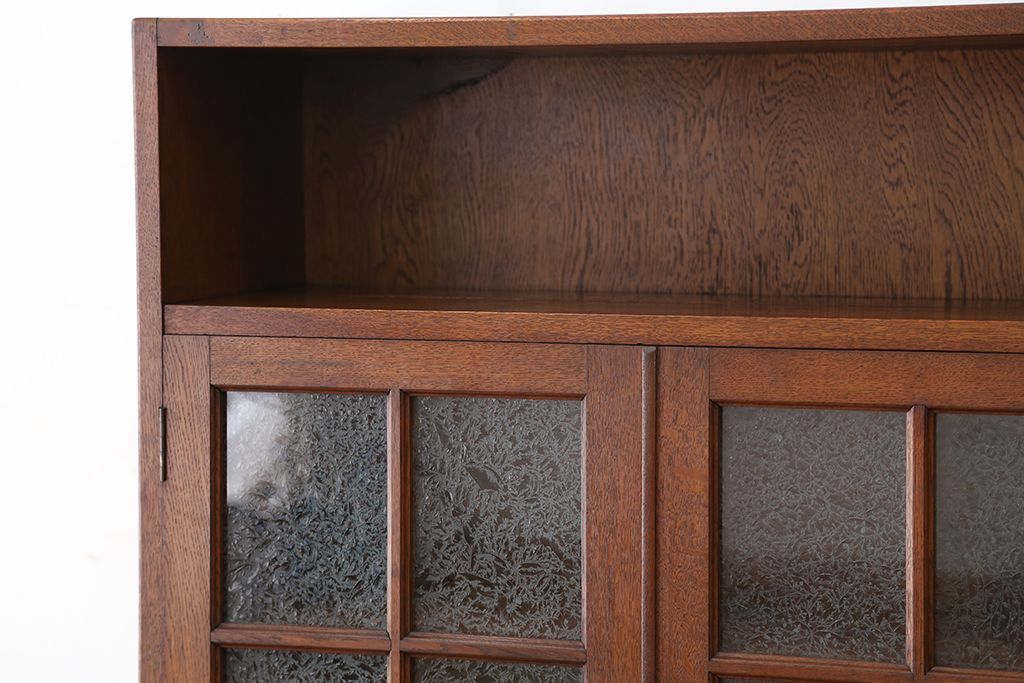 アンティーク家具 素敵なデザイン!古い洋館の結霜ガラス・ナラ材ブックケース(本箱、本棚)