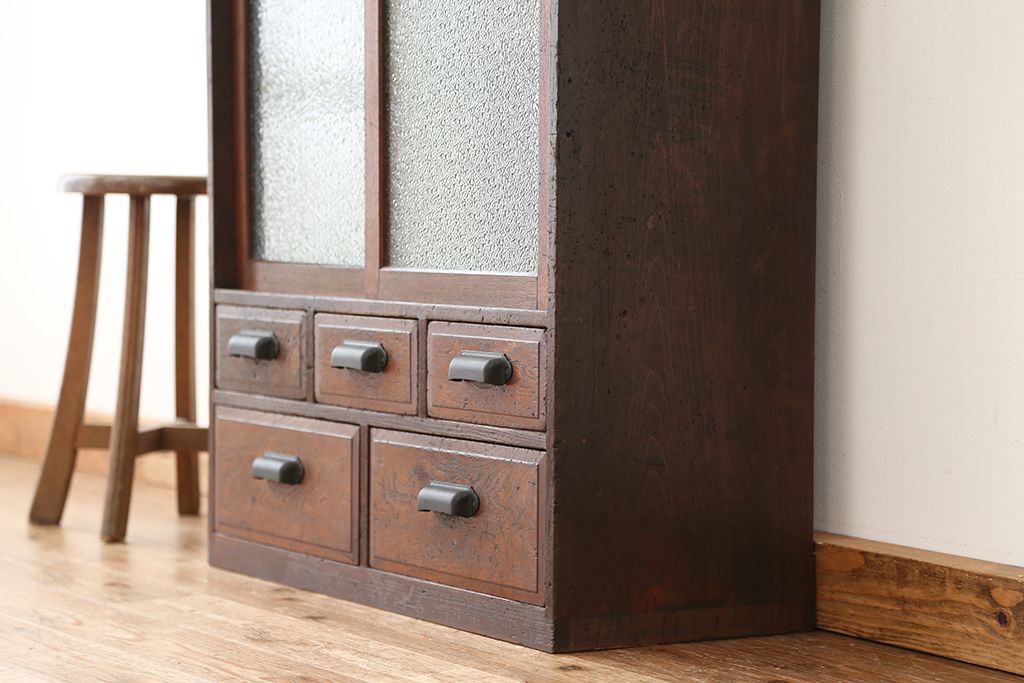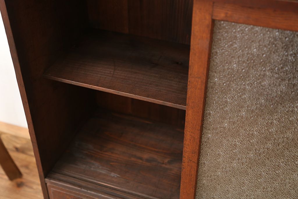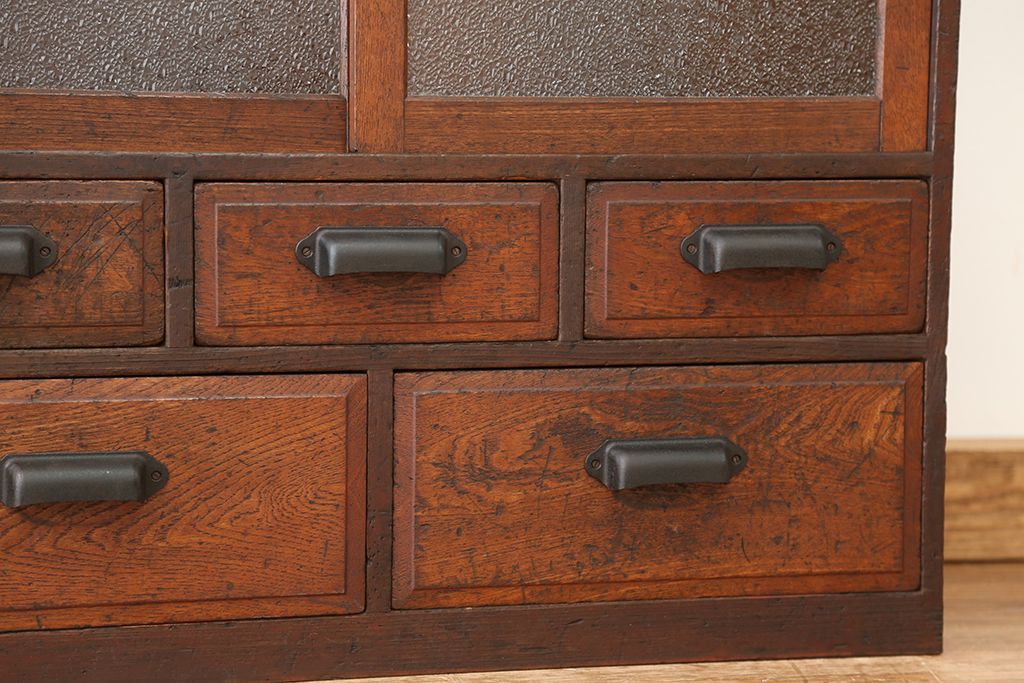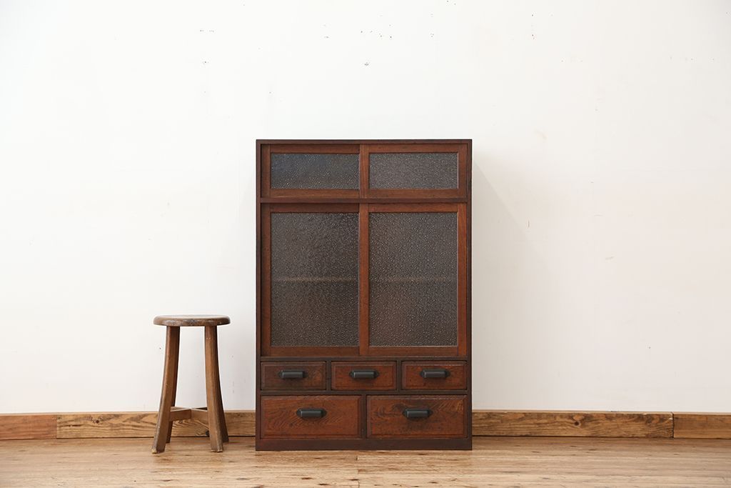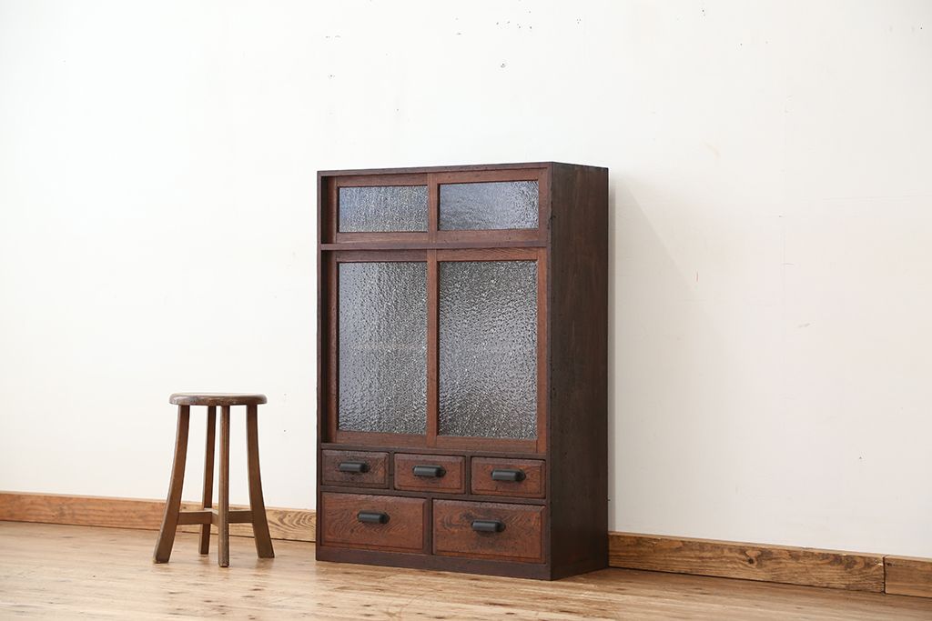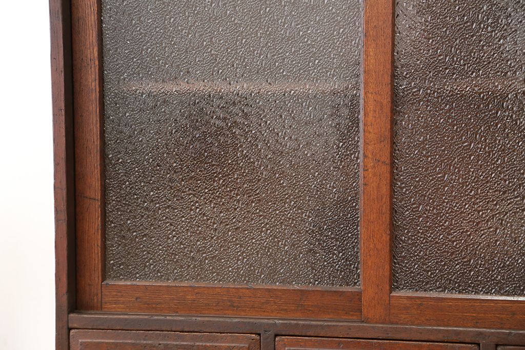 アンティーク家具 アンティーク 古い木の使い込まれたダイヤガラス収納棚(飾り棚・食器棚)
