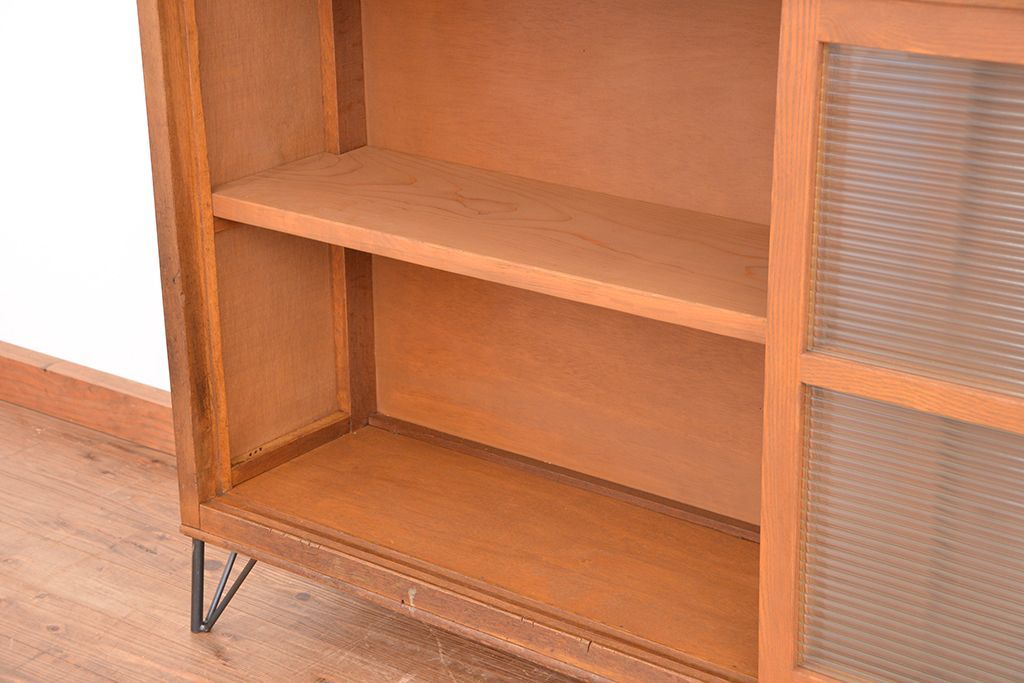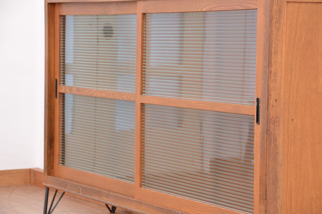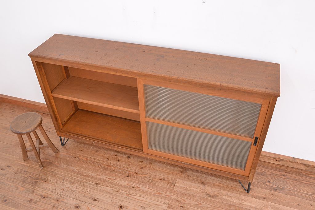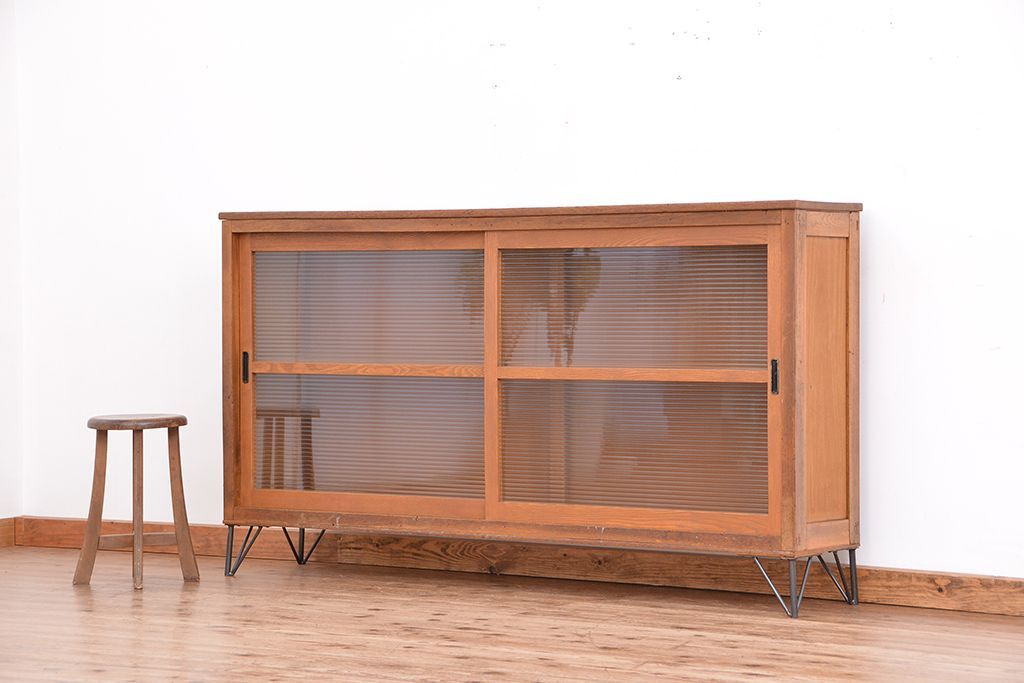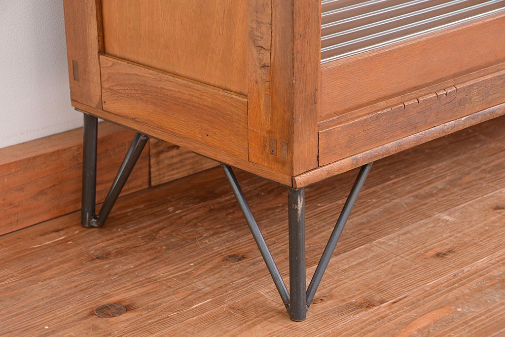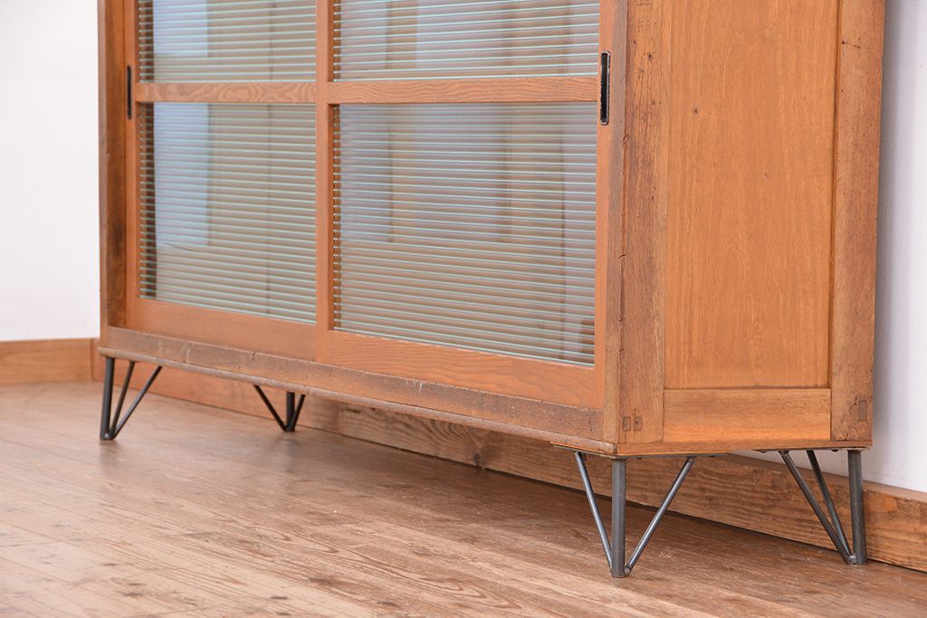 1970年代 古い学校の鉄脚薄型モールガラス収納棚(食器棚・本棚)です。