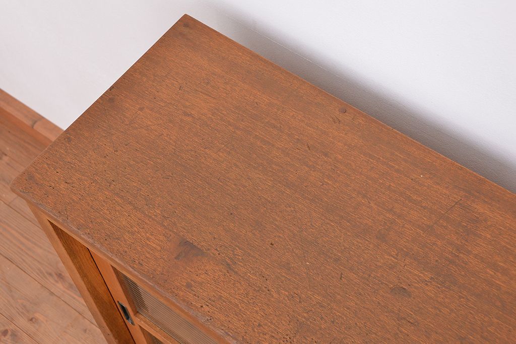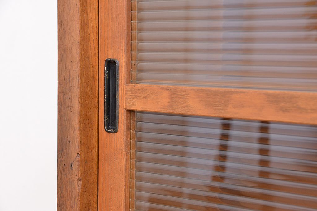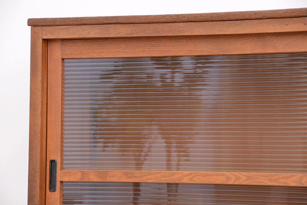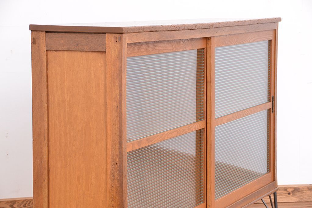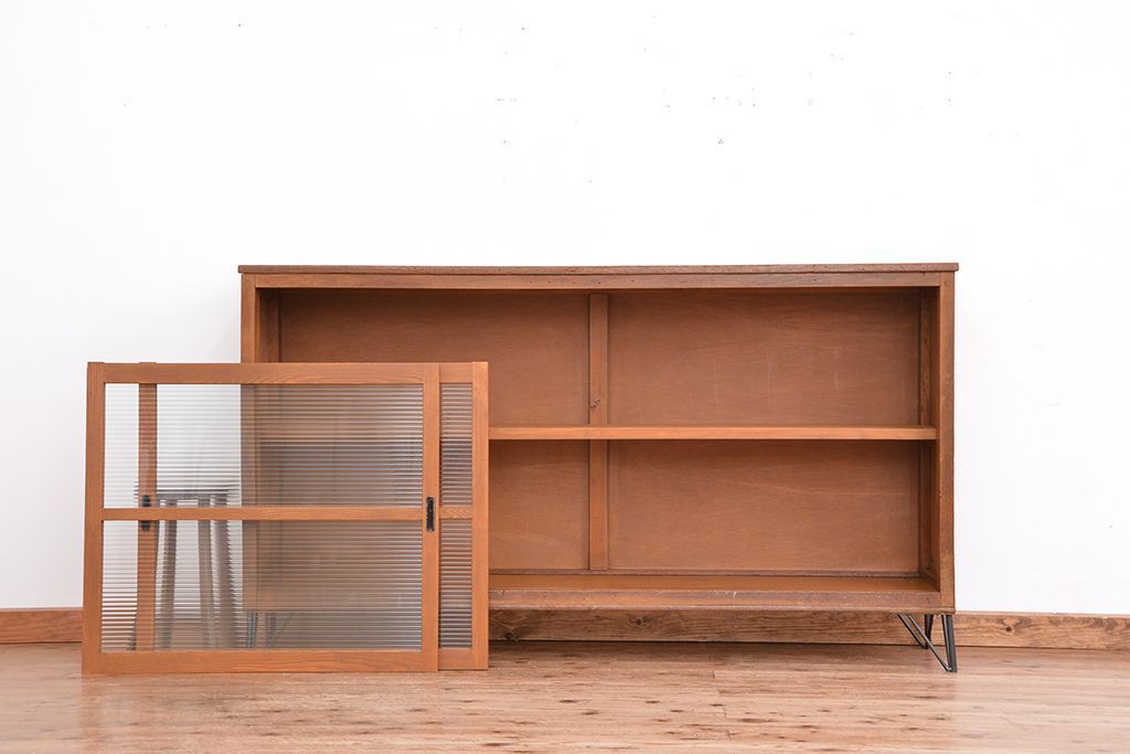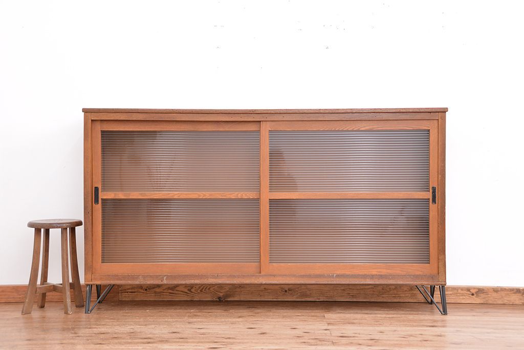 1970年代 古い学校の鉄脚薄型モールガラス収納棚(食器棚・本棚)です。
