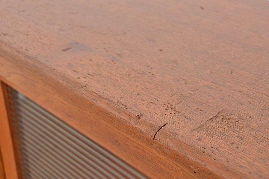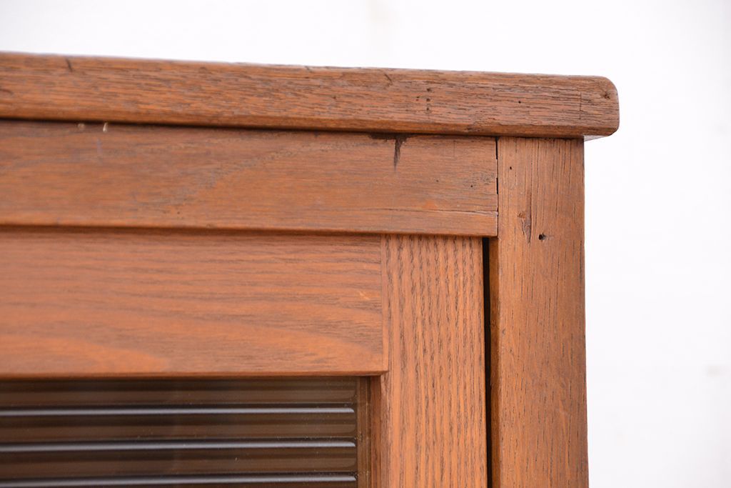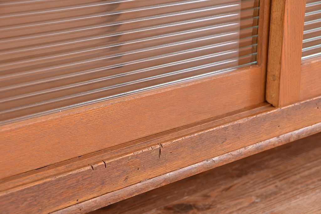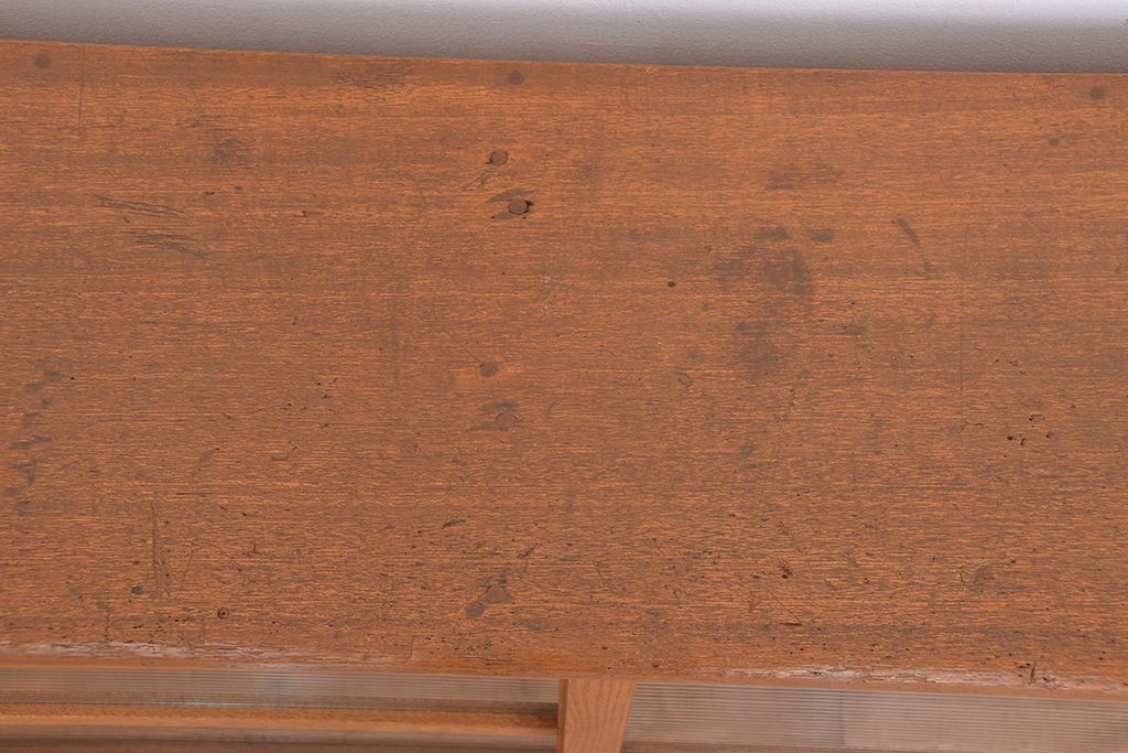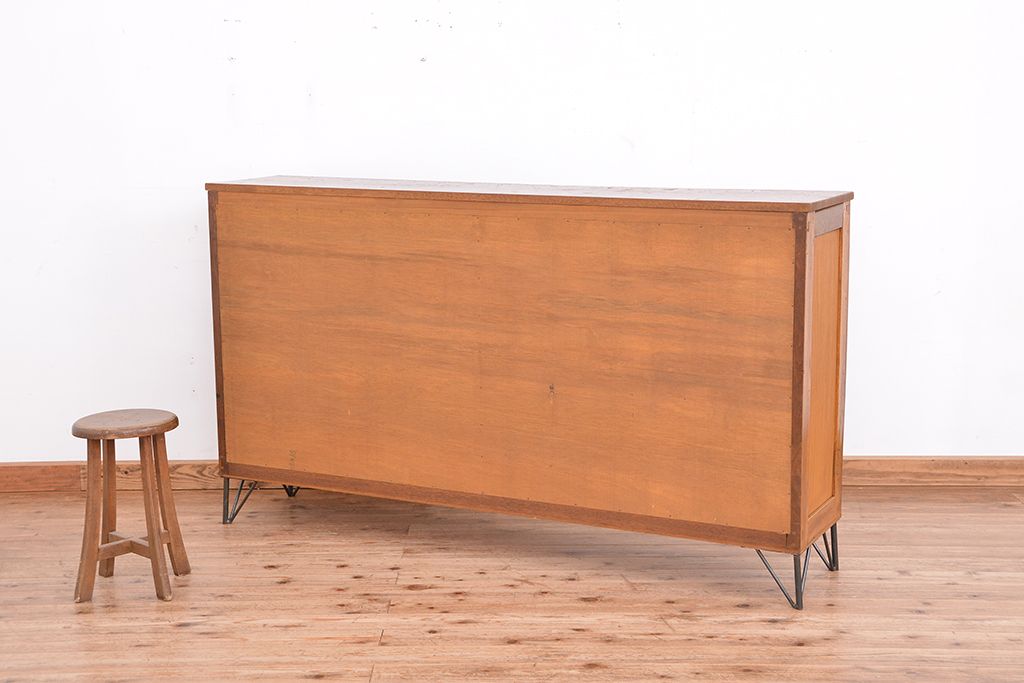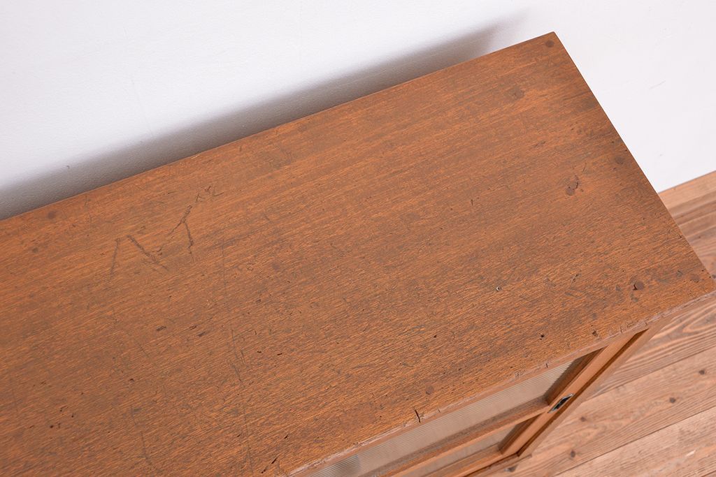 1970年代 古い学校の鉄脚薄型モールガラス収納棚(食器棚・本棚)です。