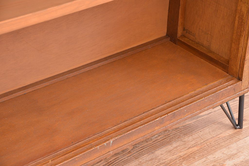 アンティーク家具 1970年代 古い学校の鉄脚薄型モールガラス収納棚(食器棚・本棚)