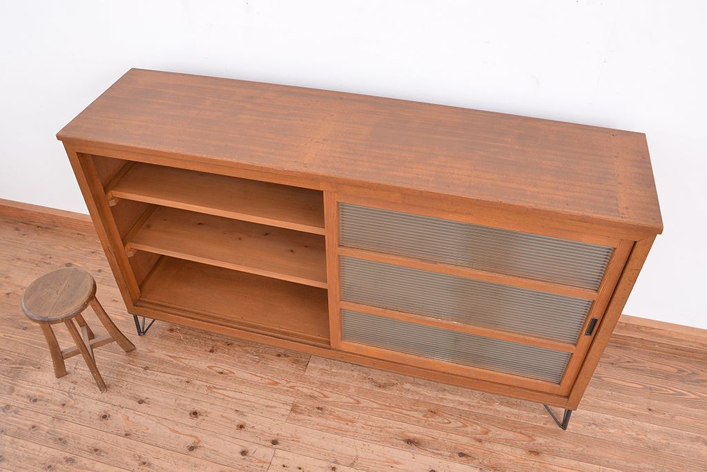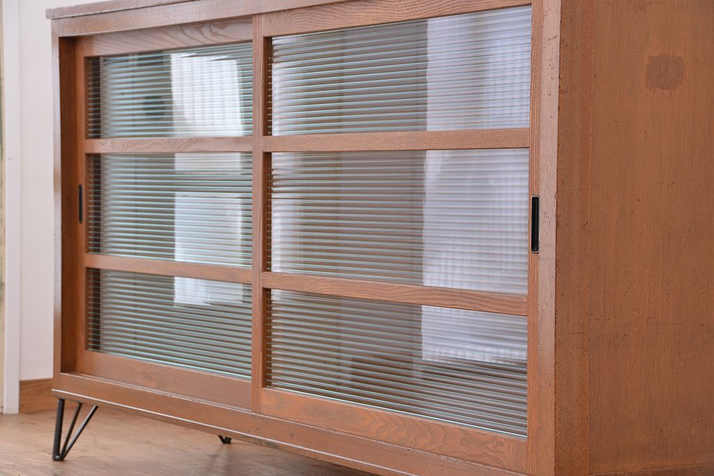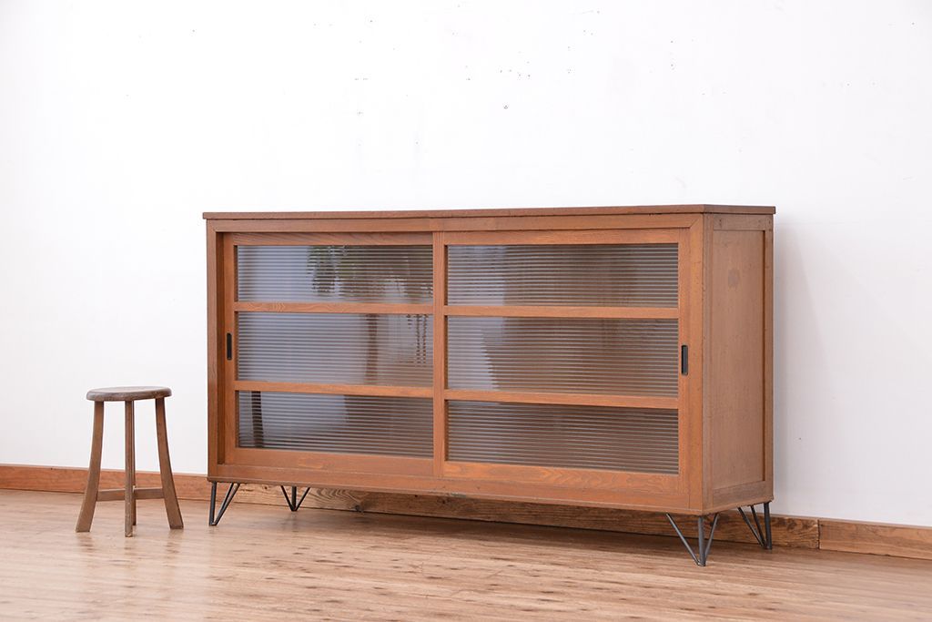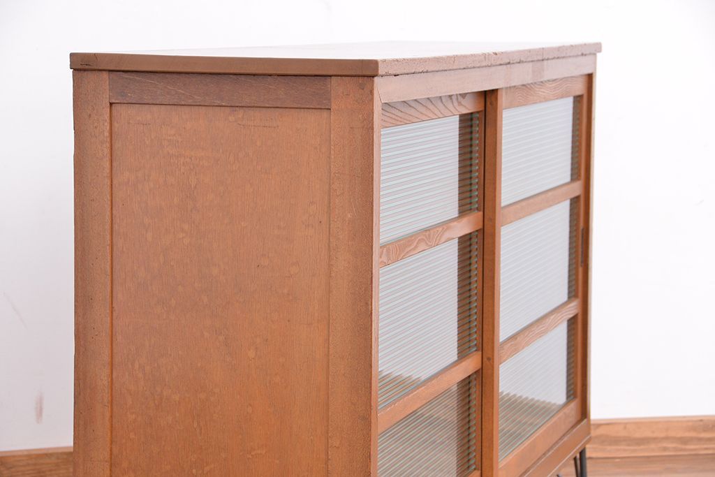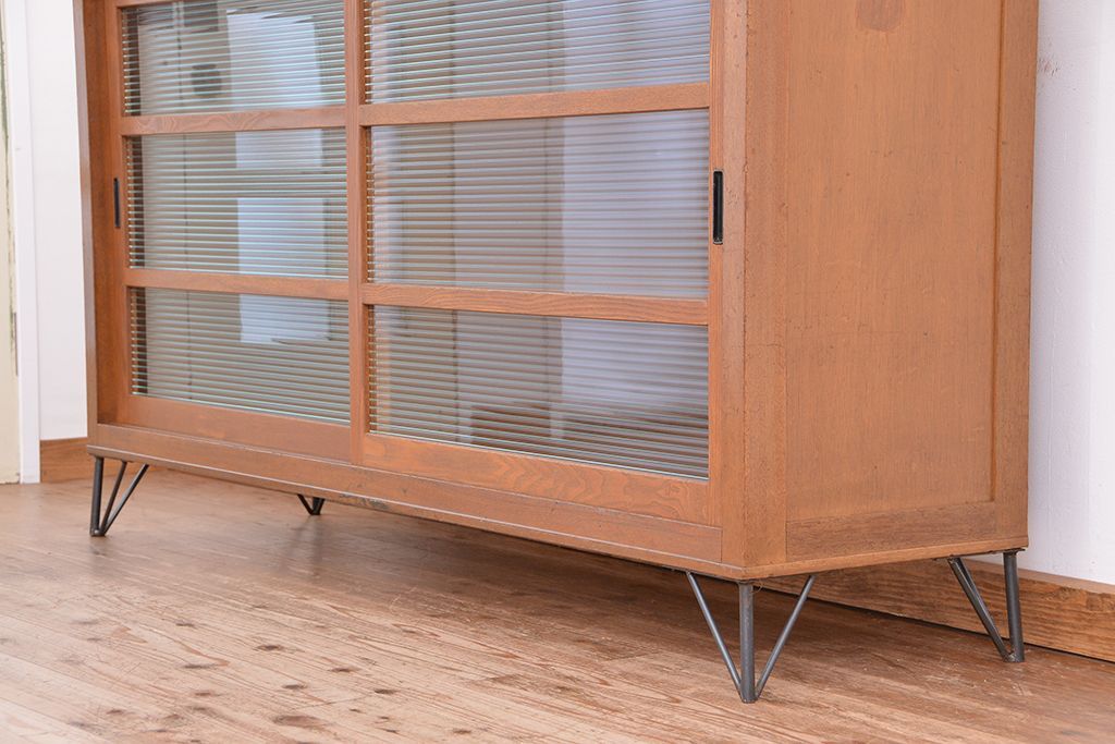 1970年代 古い学校の鉄脚モールガラス収納棚?(食器棚・本棚)です。