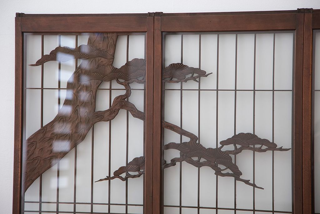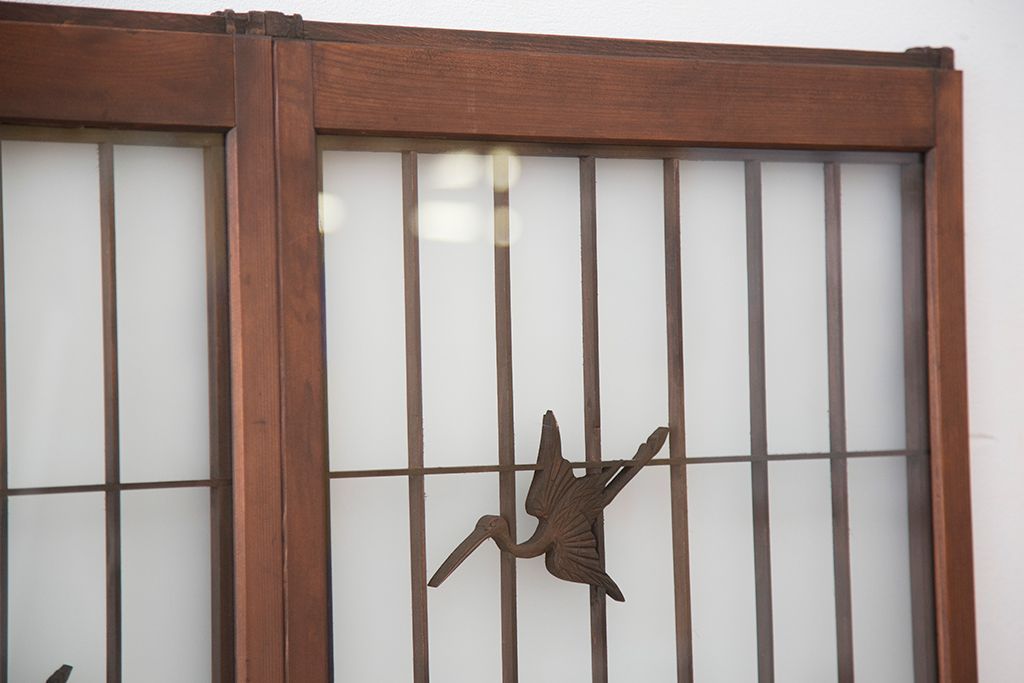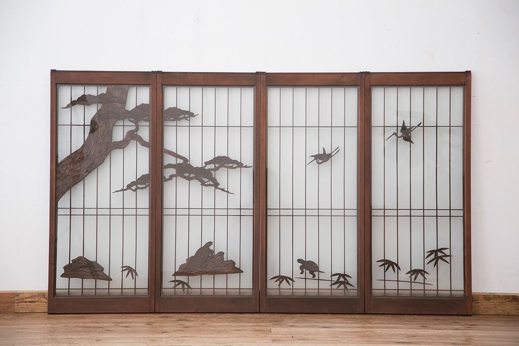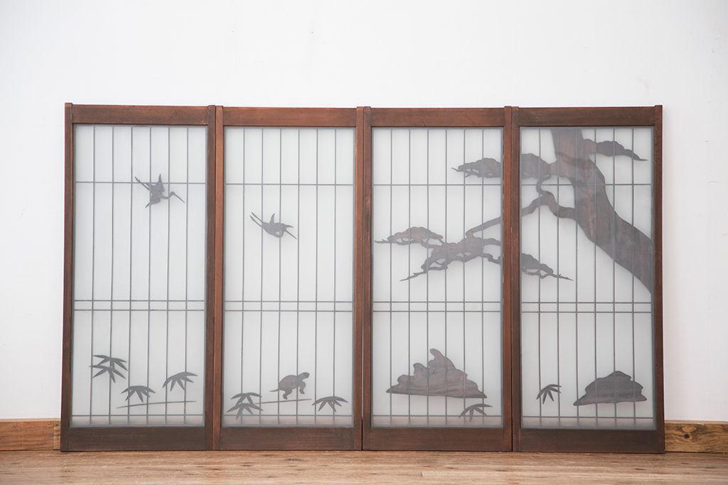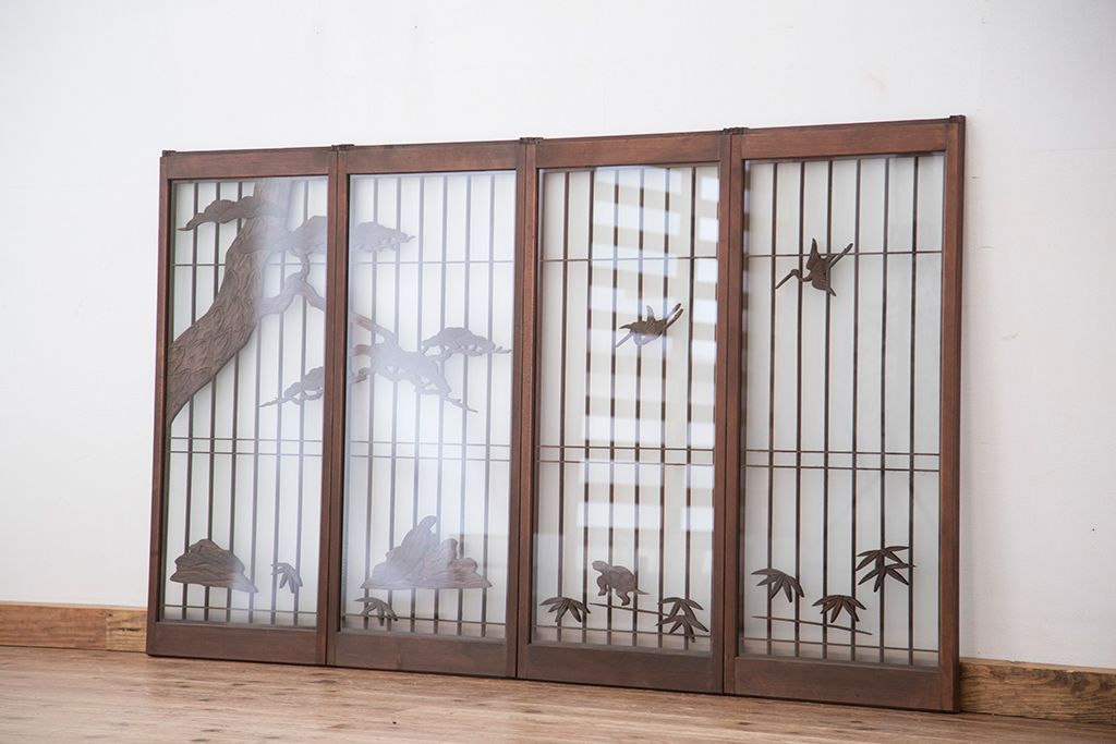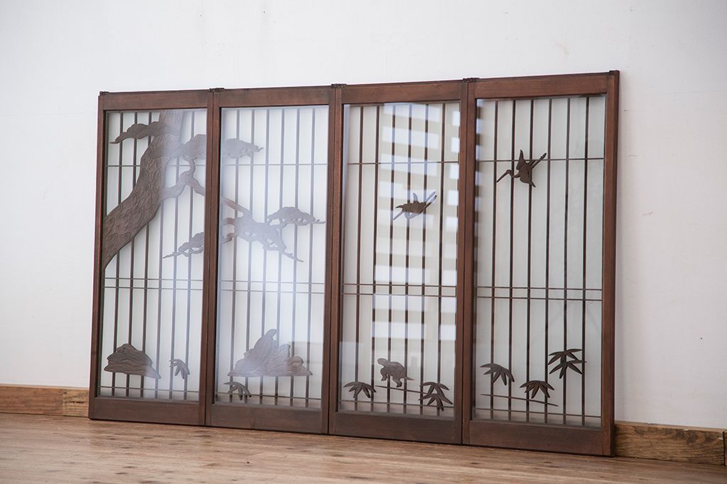 ラフジュ工房> ドア・建具> 4枚〜セット > 中古 縁起も良い!松竹梅と亀鶴コラボ 書院戸4枚セット?(明り取り)(ガラス戸)