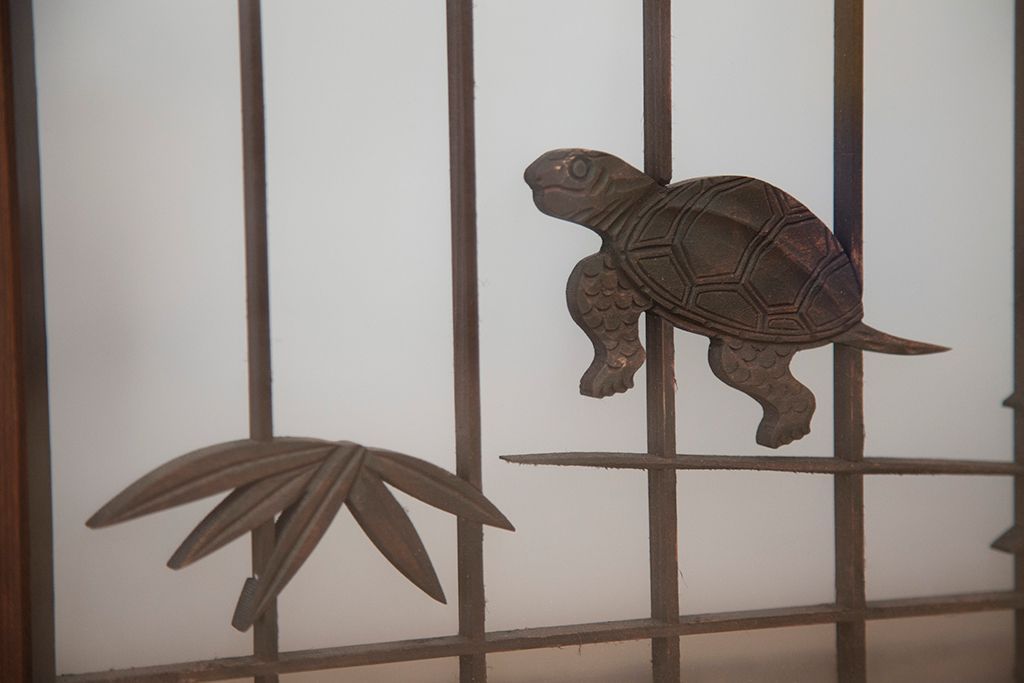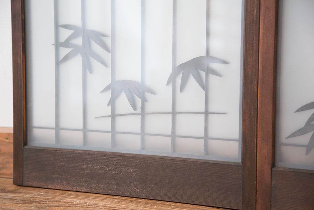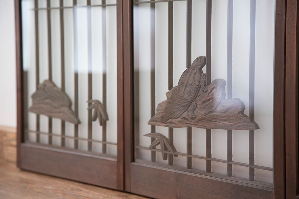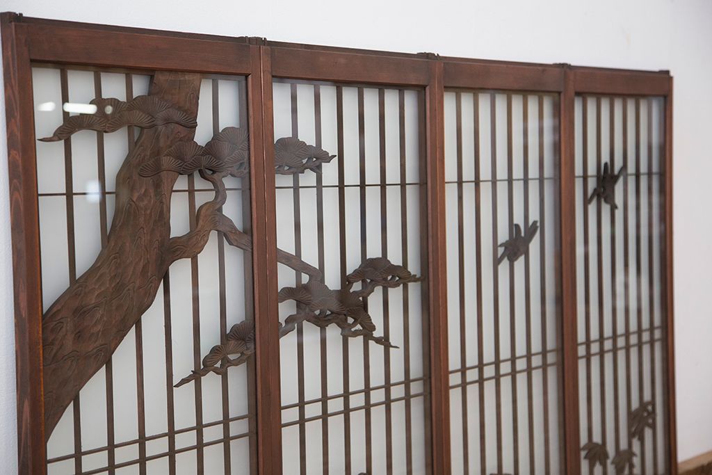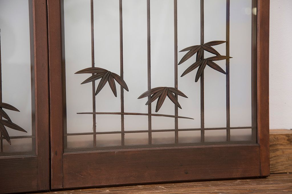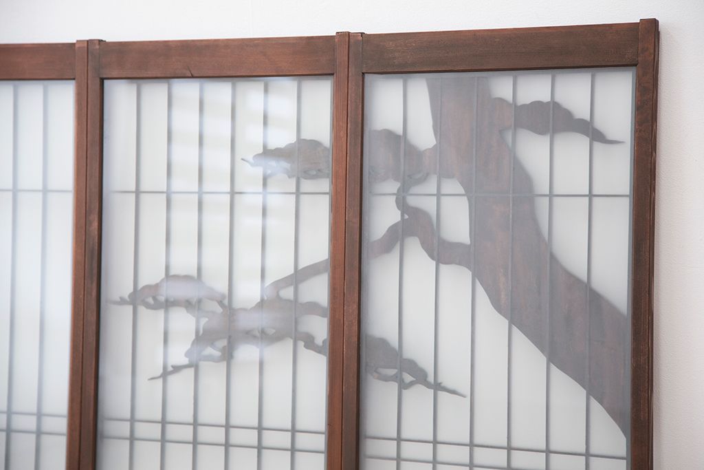 ラフジュ工房> ドア・建具> 4枚〜セット > 中古 縁起も良い!松竹梅と亀鶴コラボ 書院戸4枚セット?(明り取り)(ガラス戸)