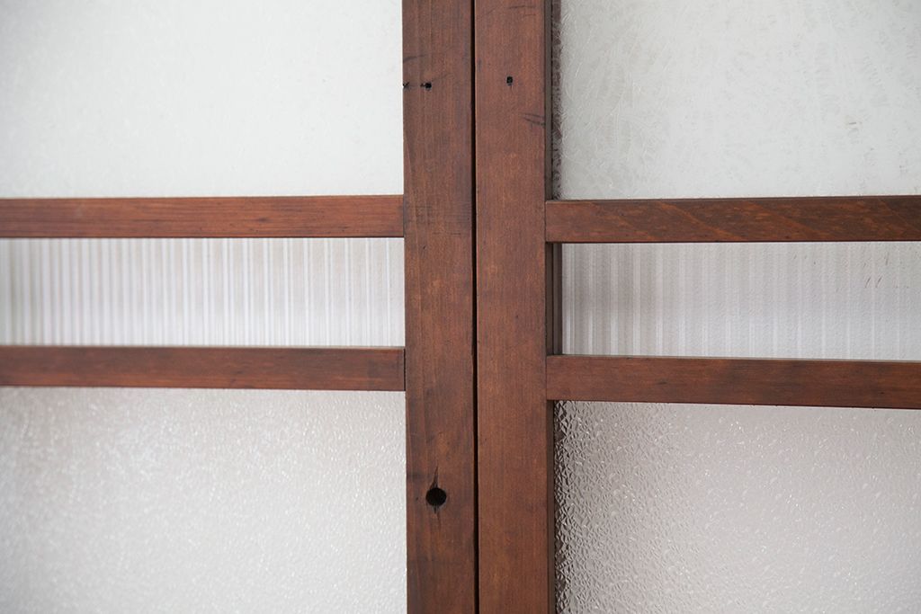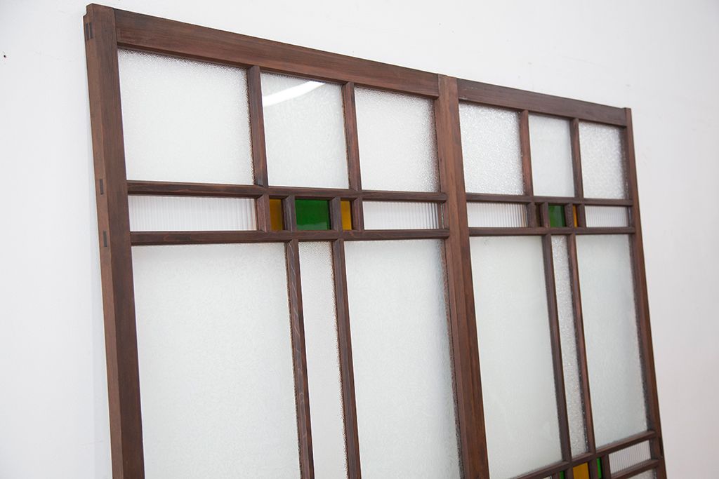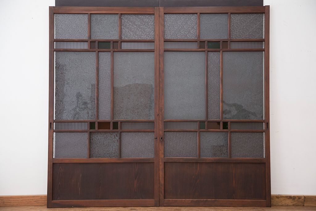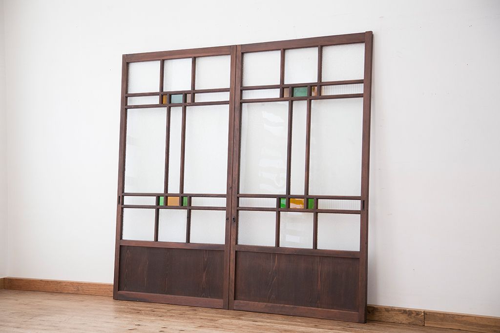 大正ロマン 古い木の色ガラス引き戸ガラス戸2枚セット(建具/ダイヤガラス/モールガラス/結霜ガラス)です。