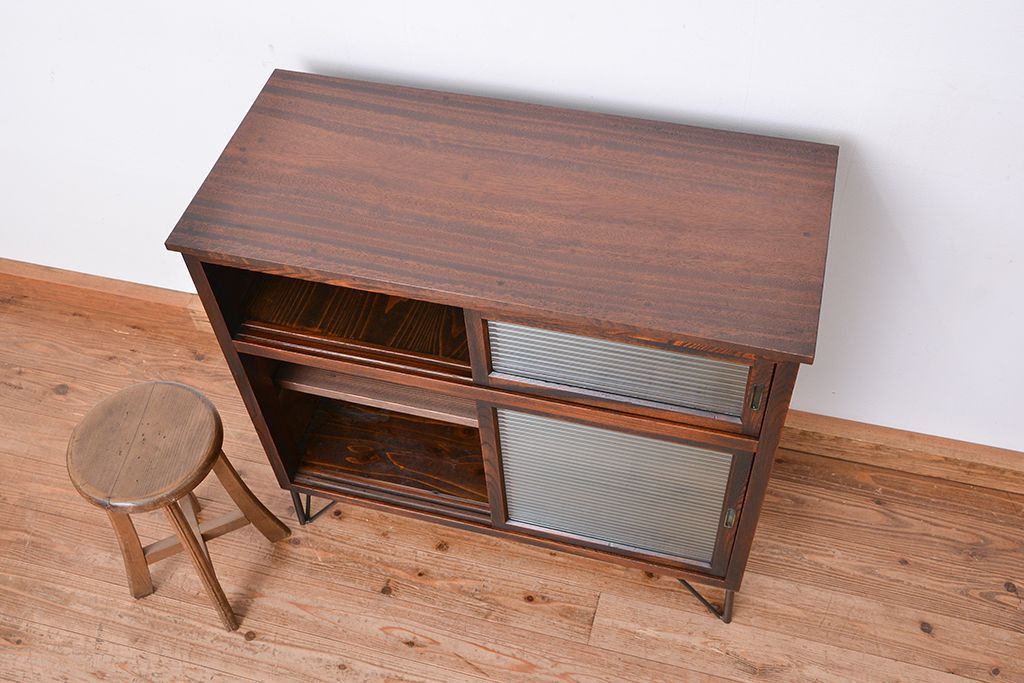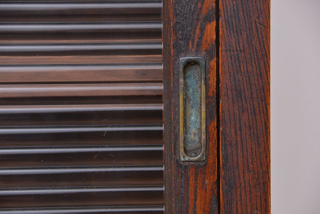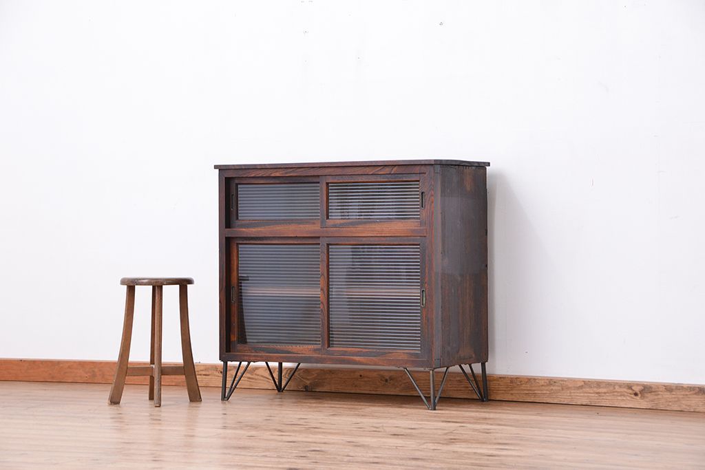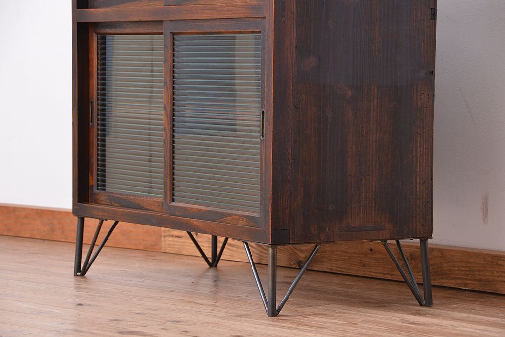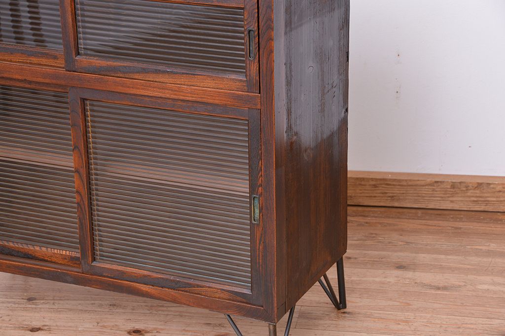 アンティーク家具 アンティーク 前面欅材の鉄脚付きモールガラス収納棚(食器棚)