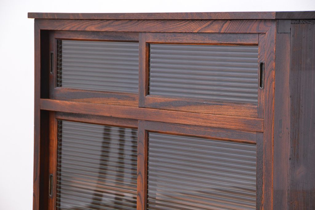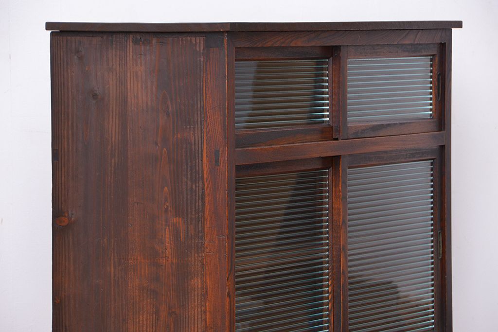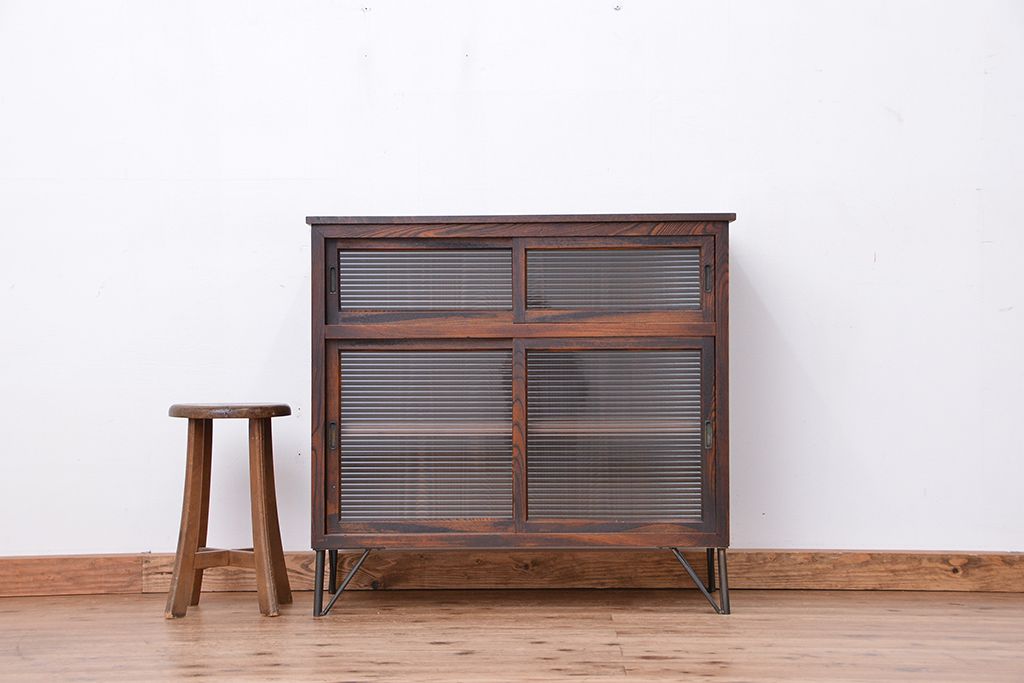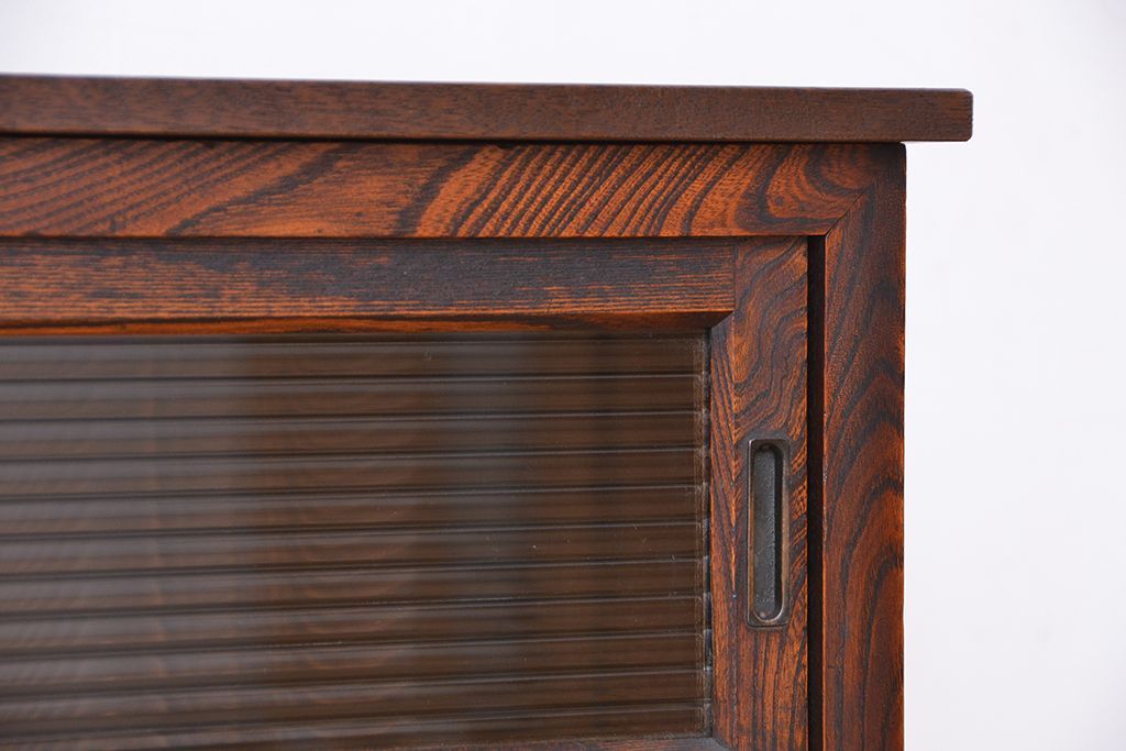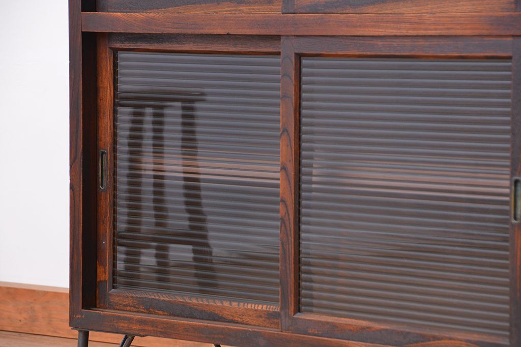 アンティーク 前面欅材の鉄脚付きモールガラス収納棚(食器棚)です。