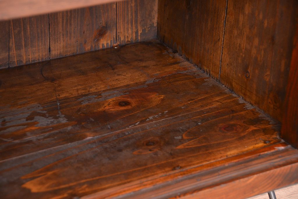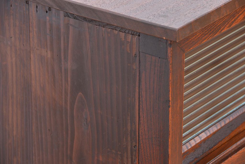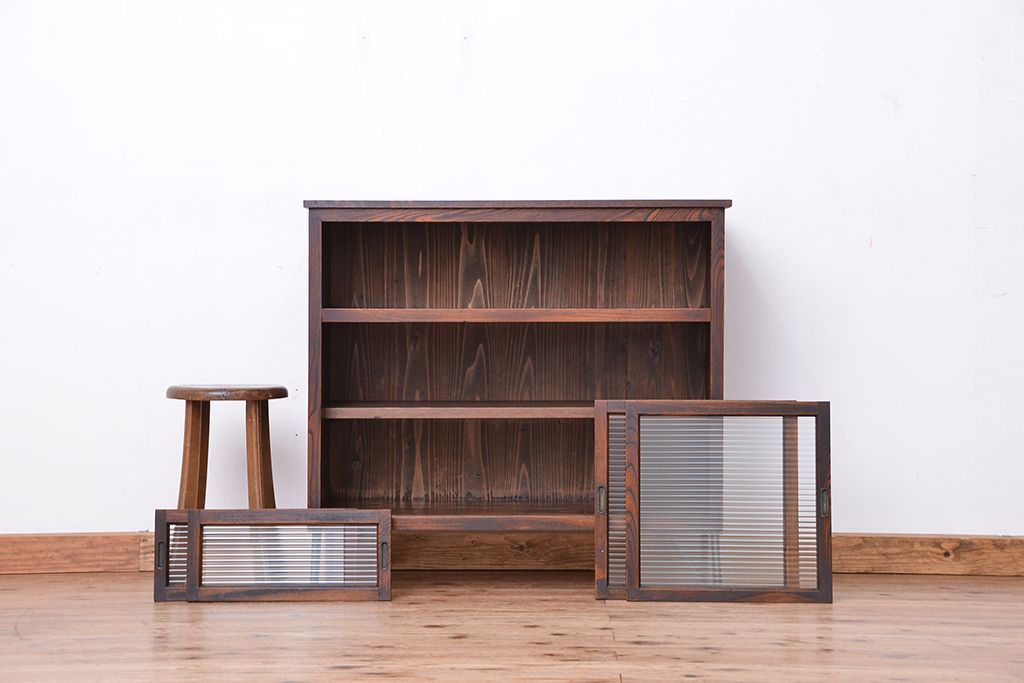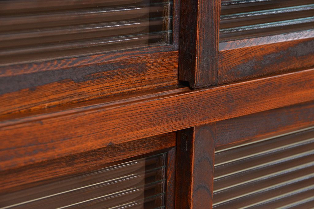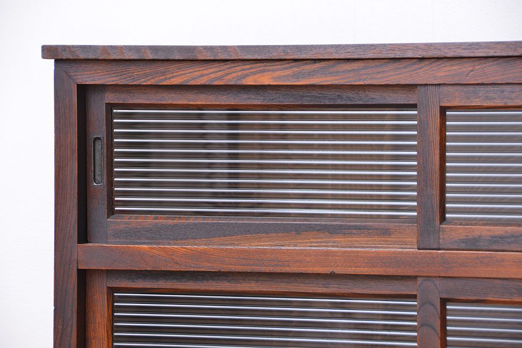 アンティーク 前面欅材の鉄脚付きモールガラス収納棚(食器棚)です。
