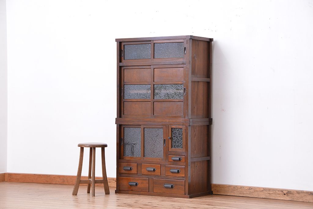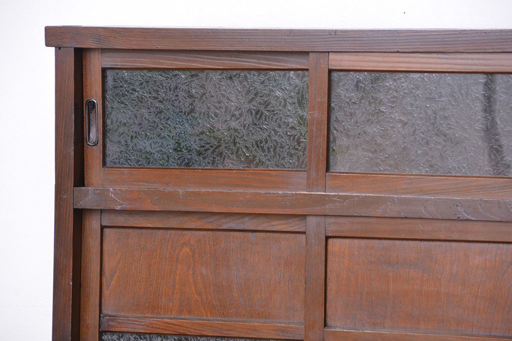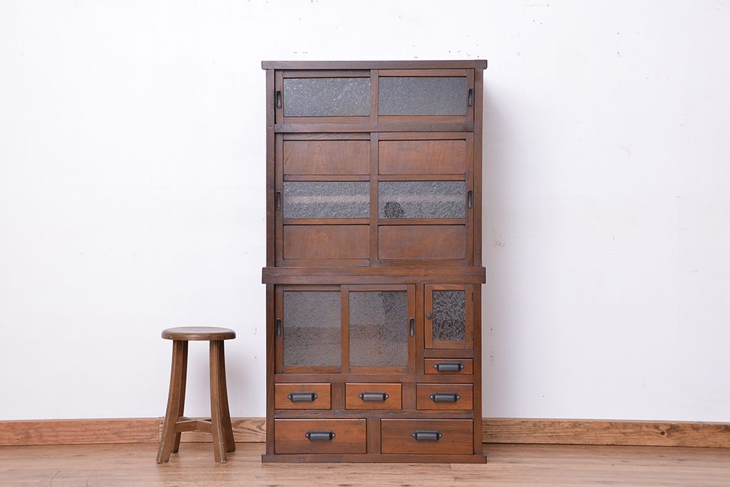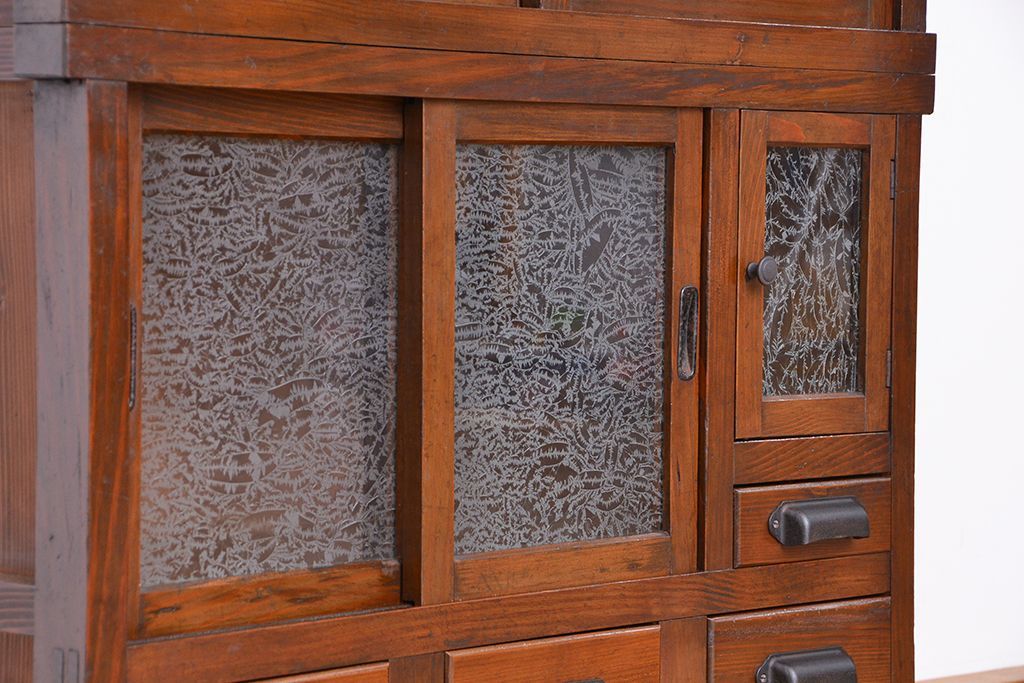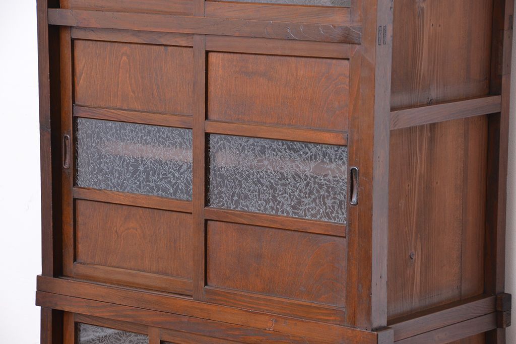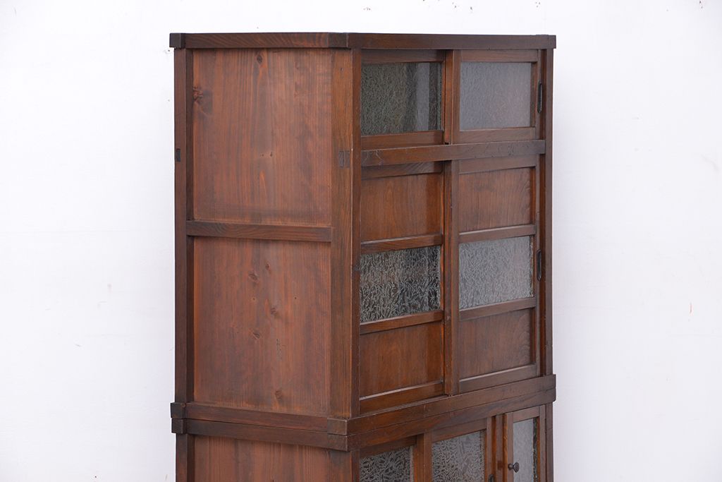 ☆アンティーク 古い木の二段重ね結霜ガラス食器棚(収納棚)です。