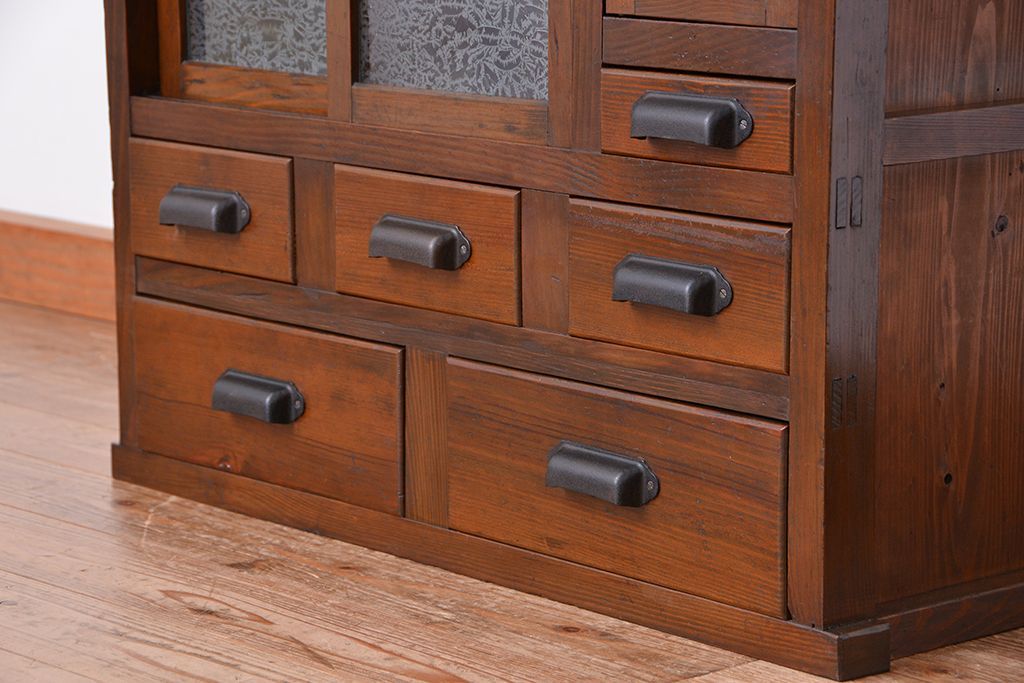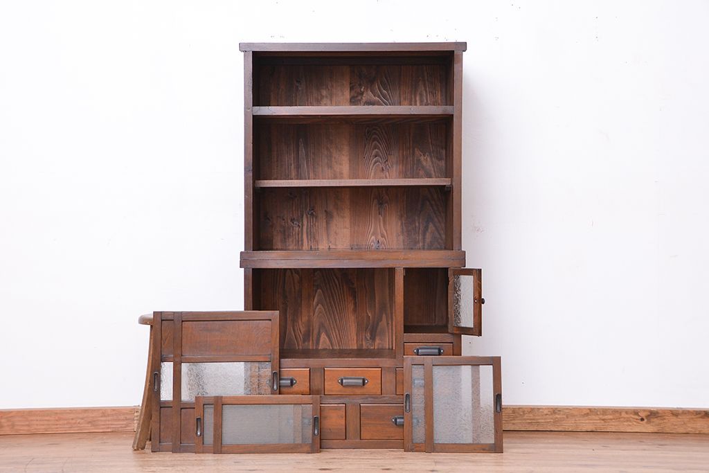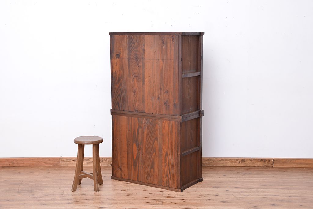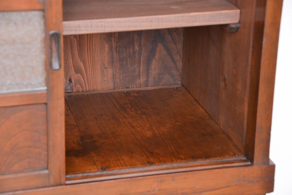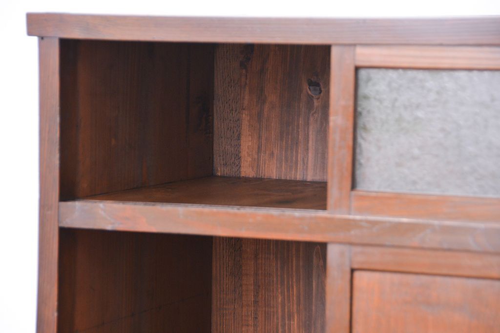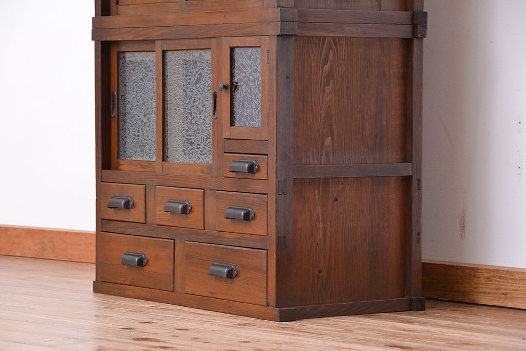 ☆アンティーク 古い木の二段重ね結霜ガラス食器棚(収納棚)です。