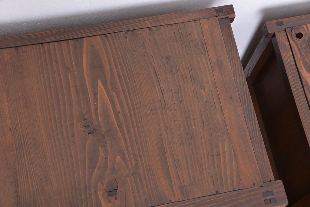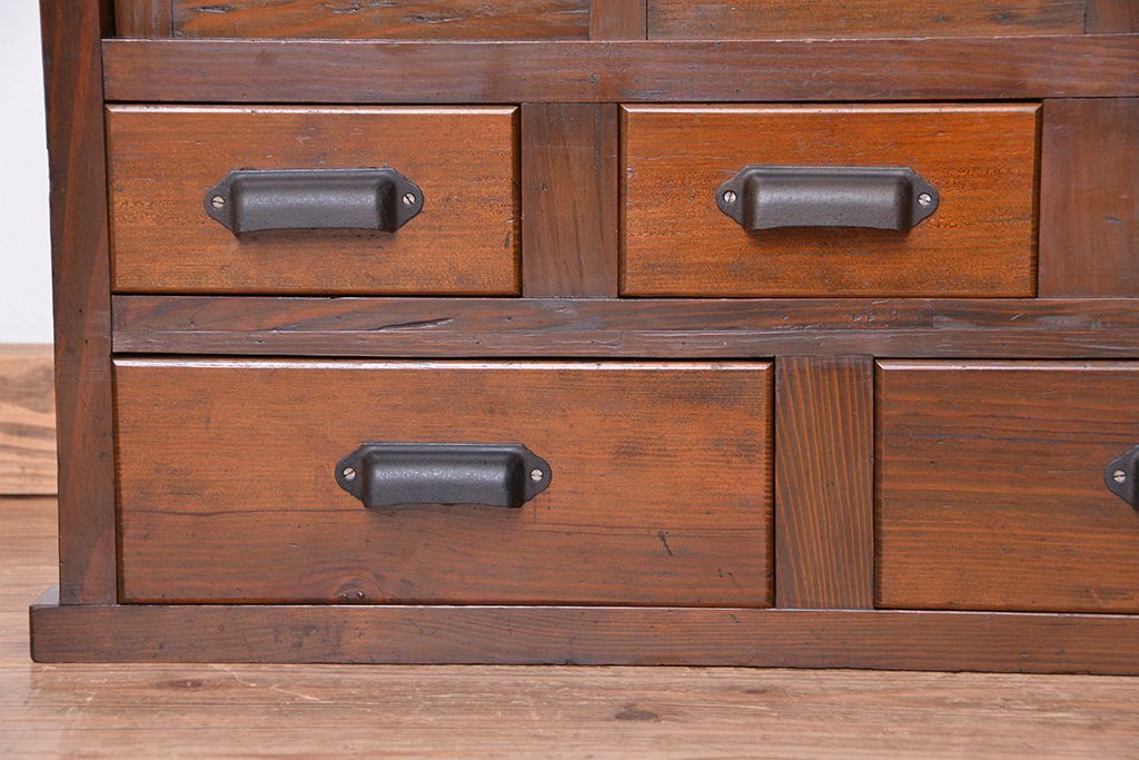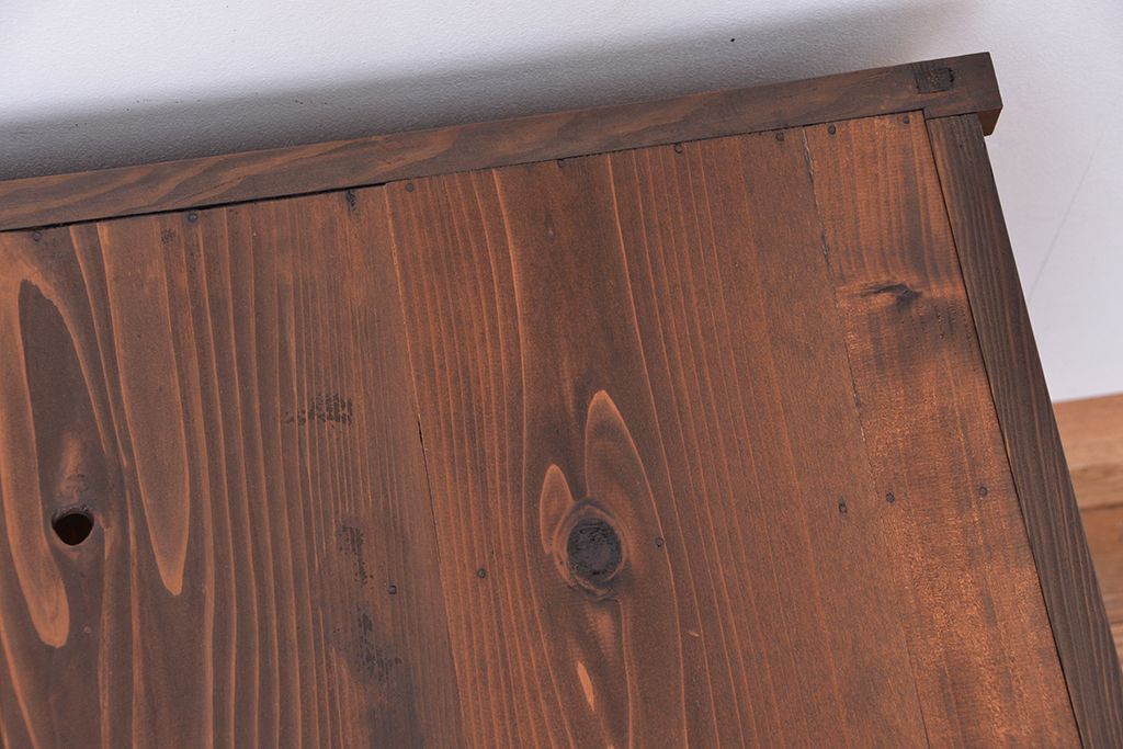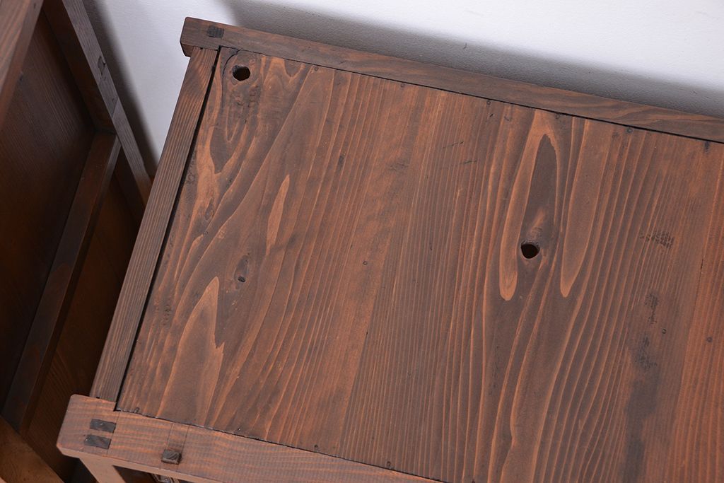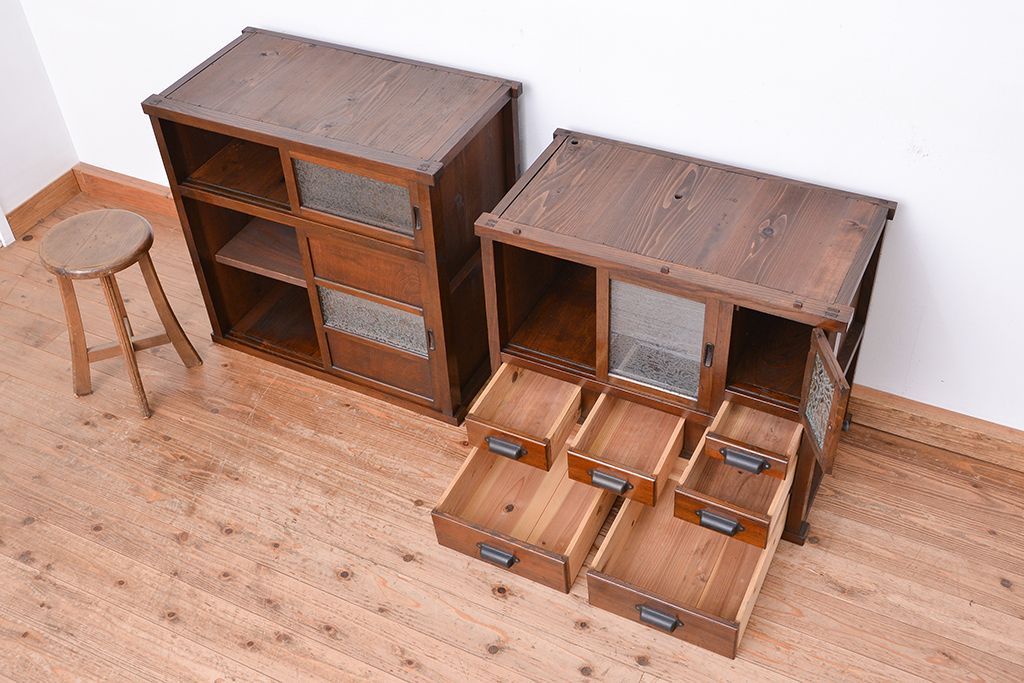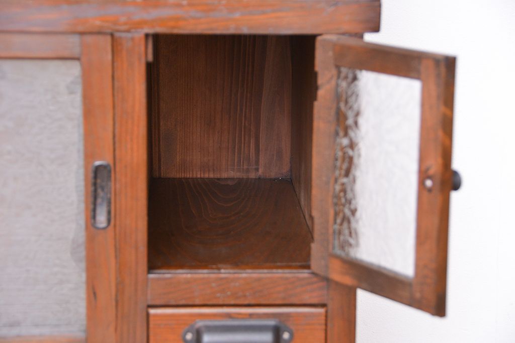 ☆アンティーク 古い木の二段重ね結霜ガラス食器棚(収納棚)です。