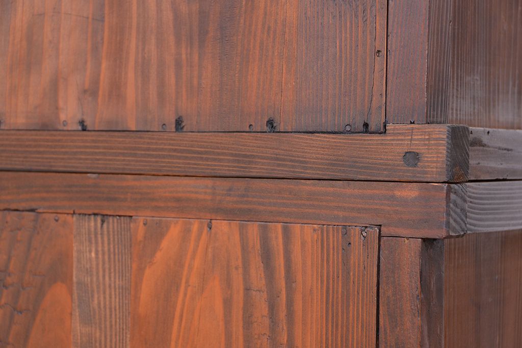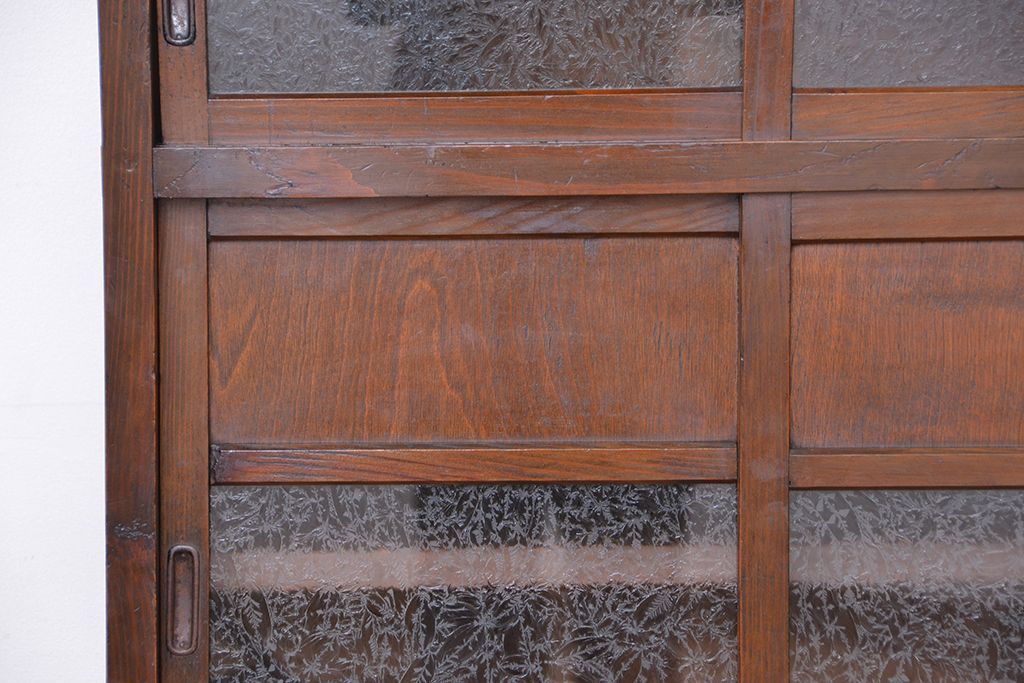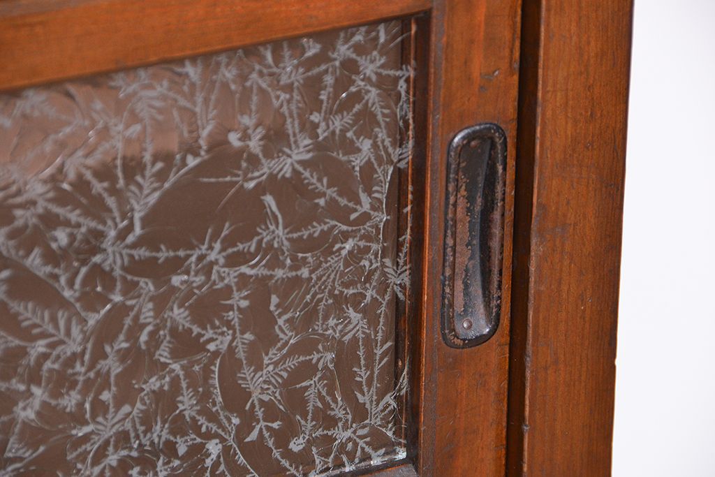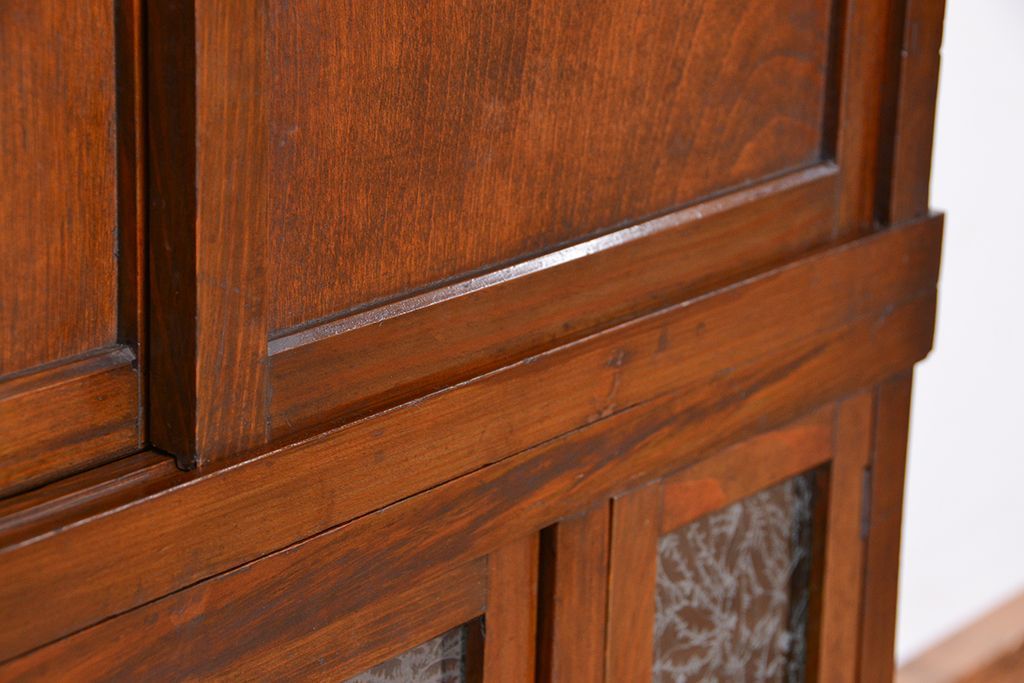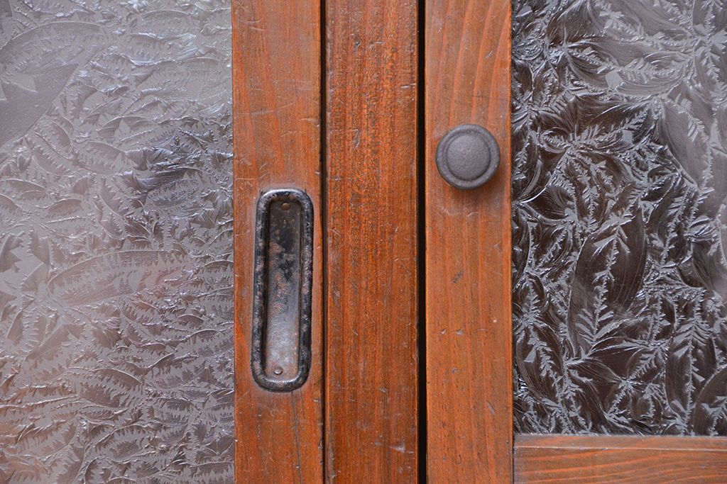 アンティーク家具 ☆アンティーク 古い木の二段重ね結霜ガラス食器棚(収納棚)