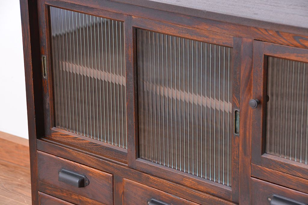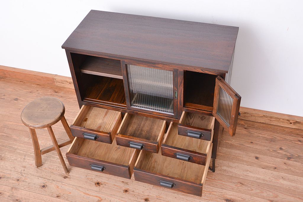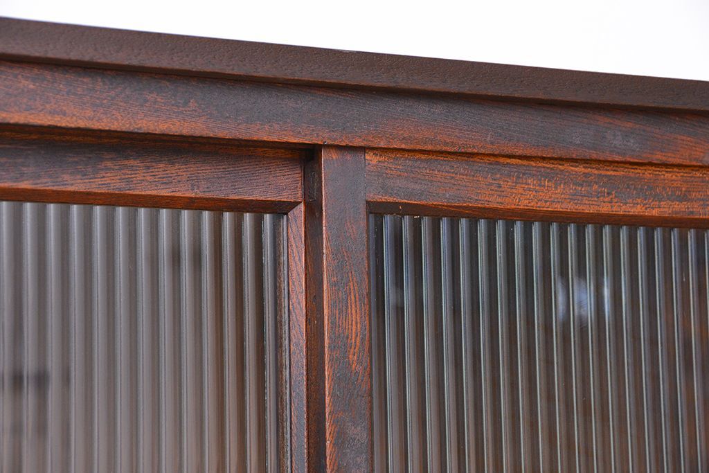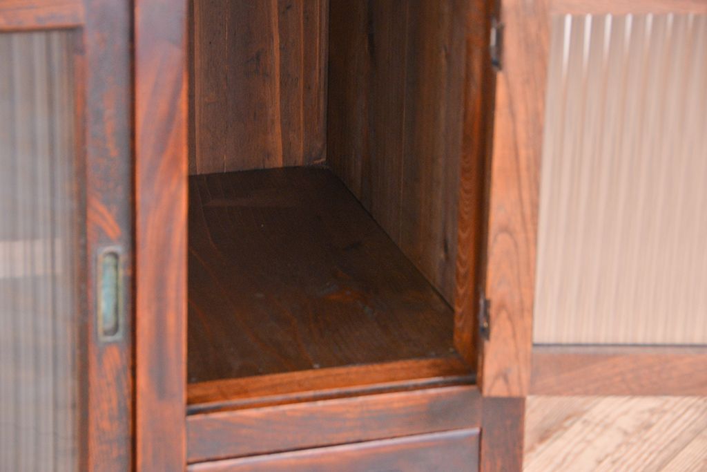 アンティーク 前面欅材のモールガラス鉄脚収納棚です。