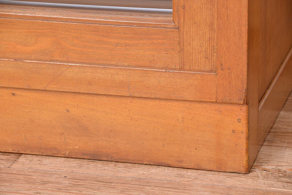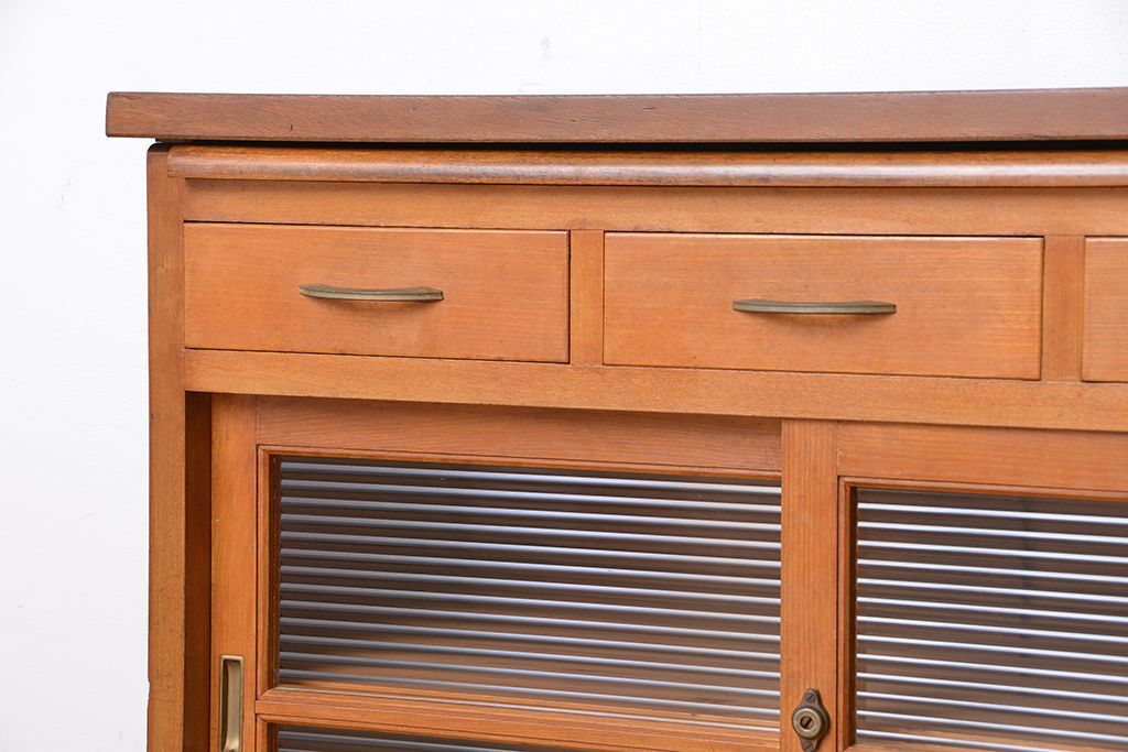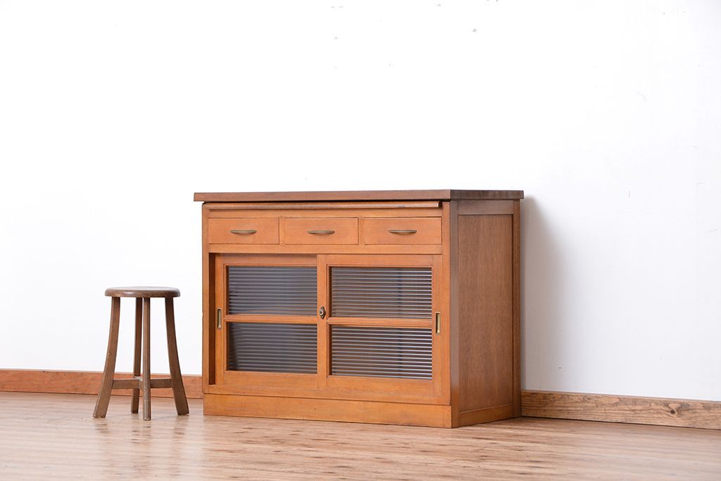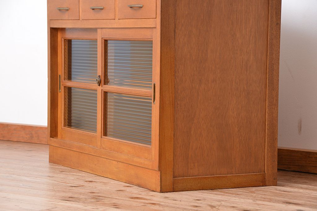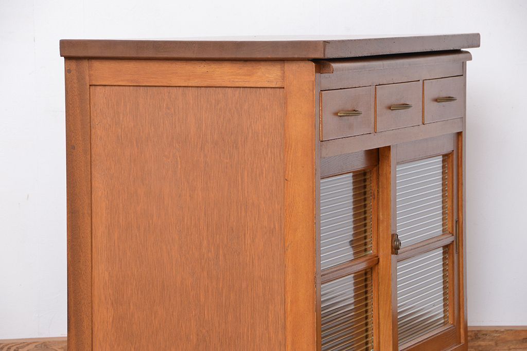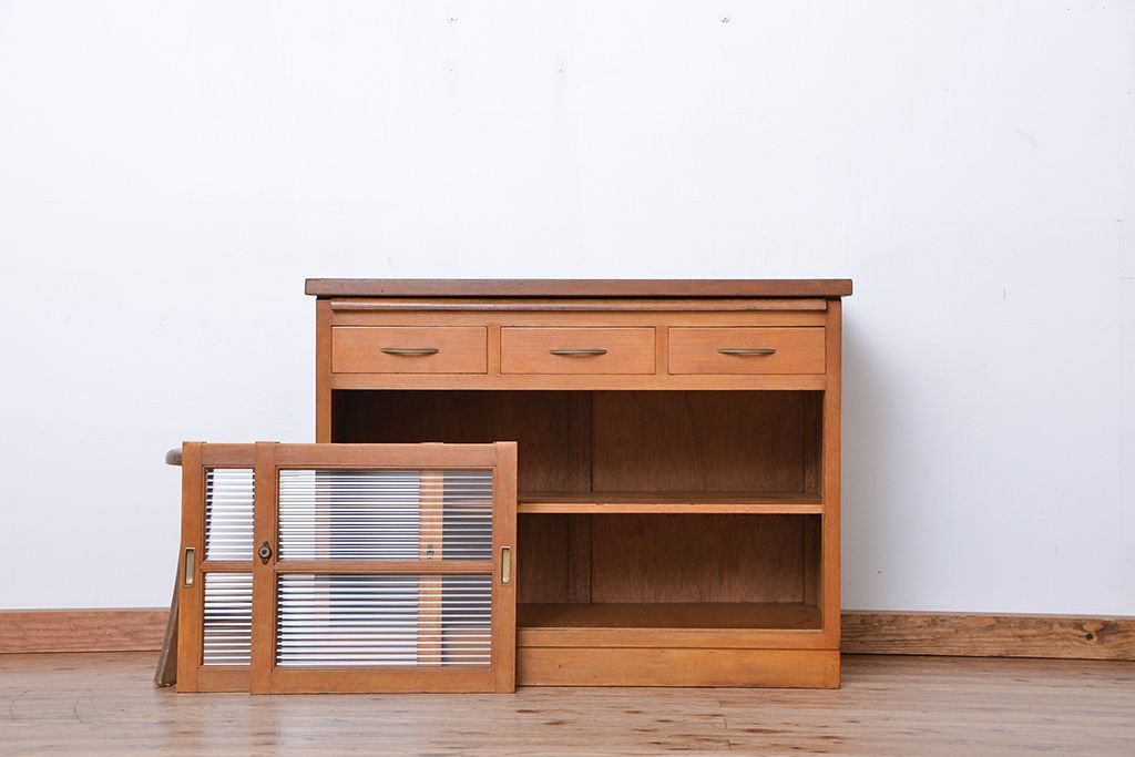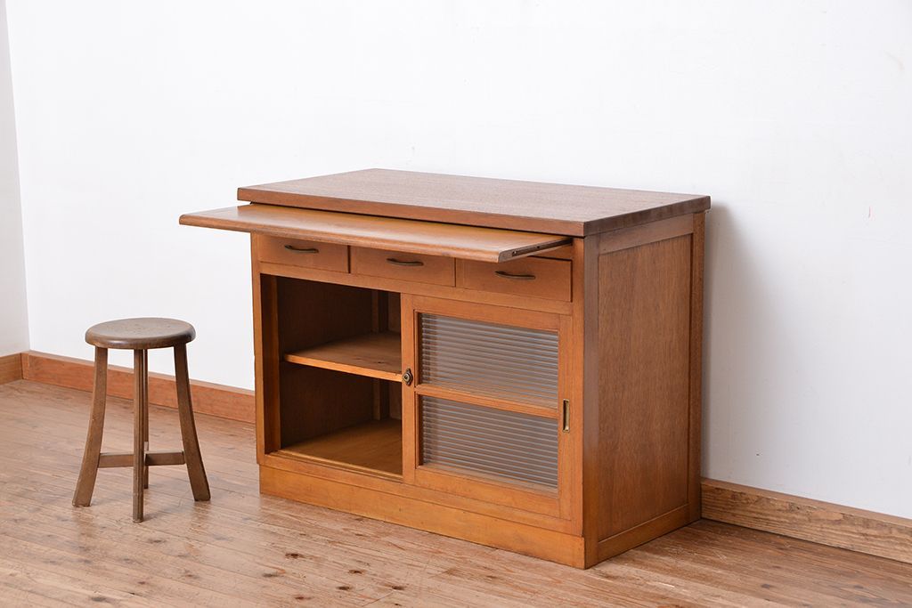 レトロ家具 アンティーク レトロな閉まえる作業台付きモールガラス収納棚(カウンターテーブル)