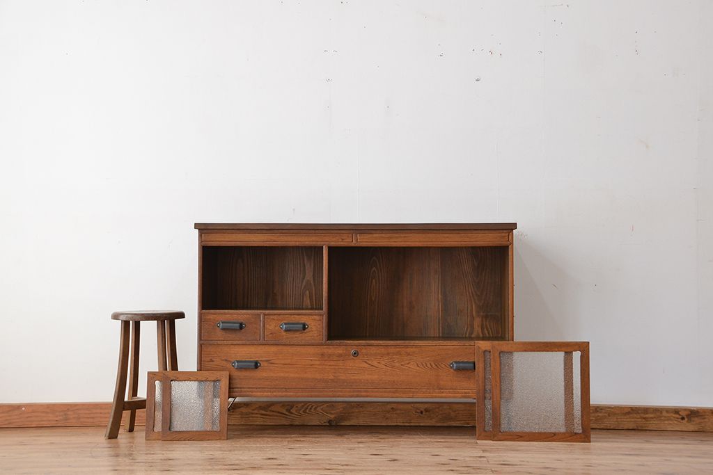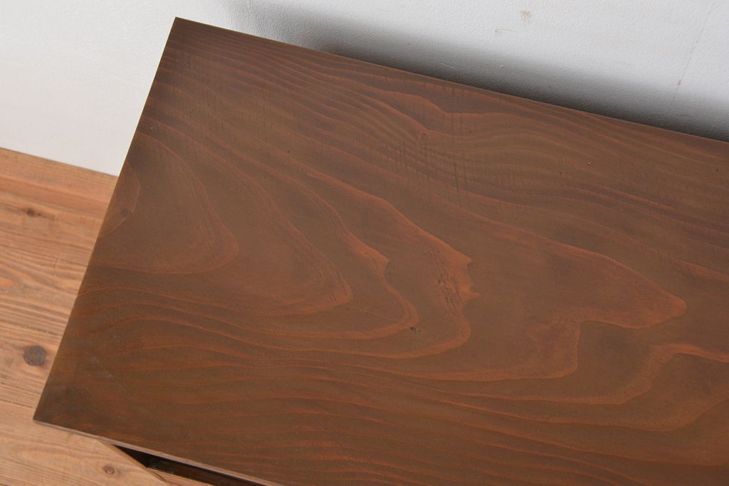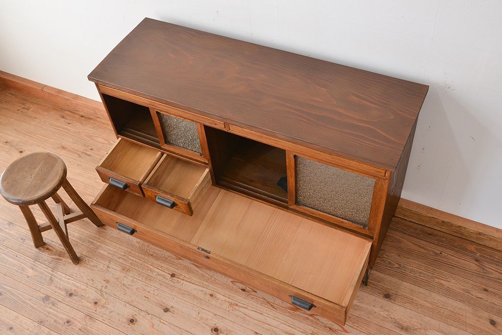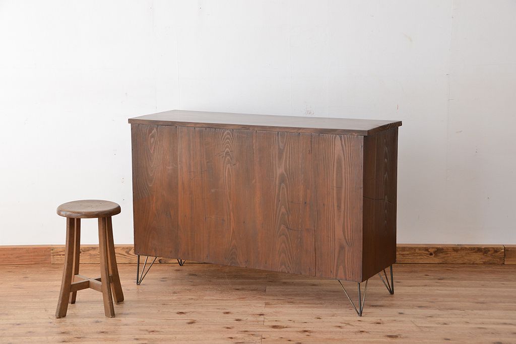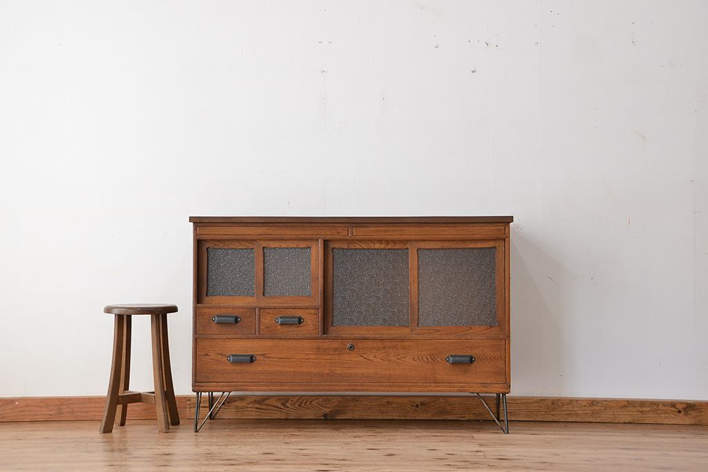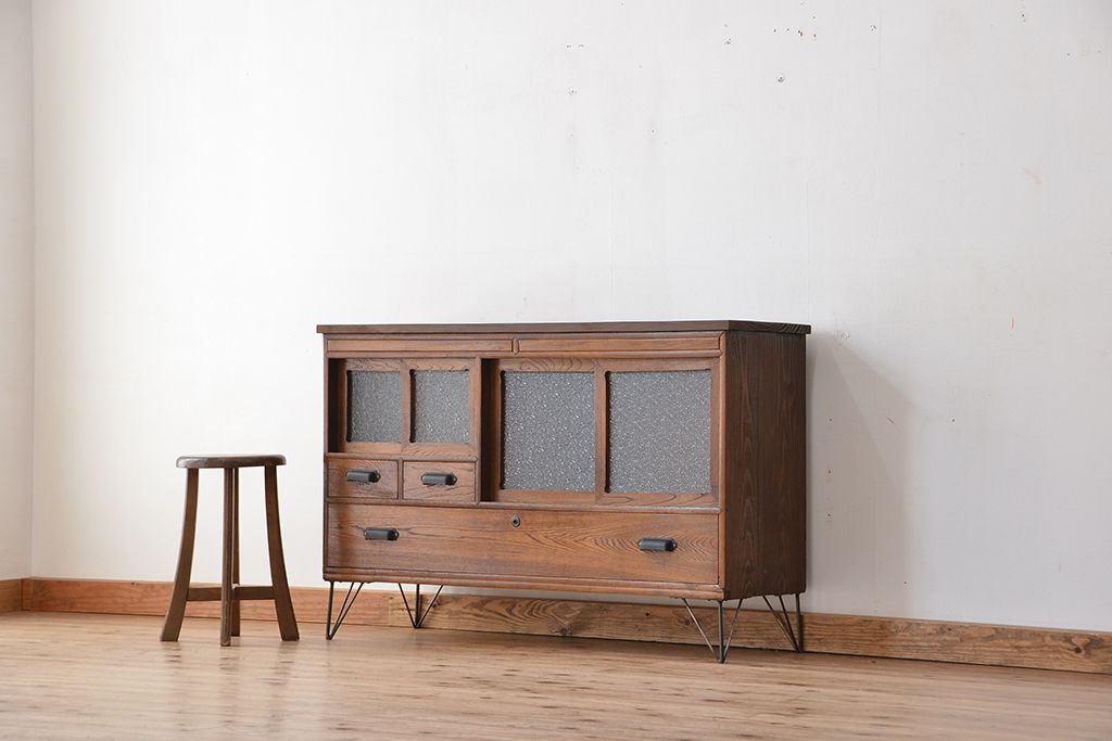 アンティーク ダイヤガラスの鉄脚付きローボード(収納棚)です。