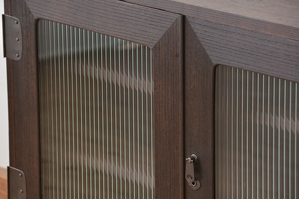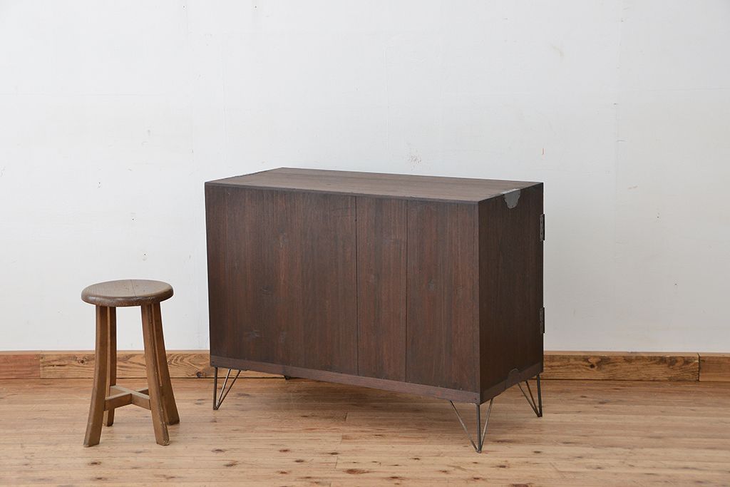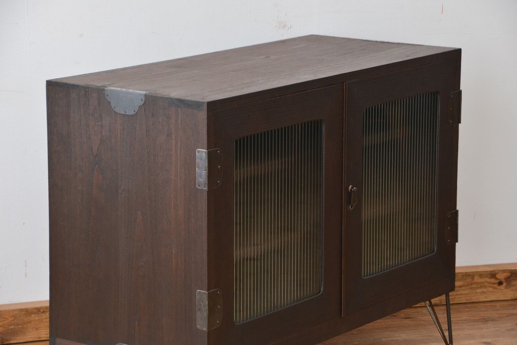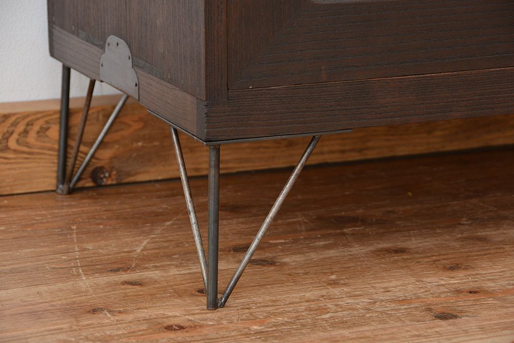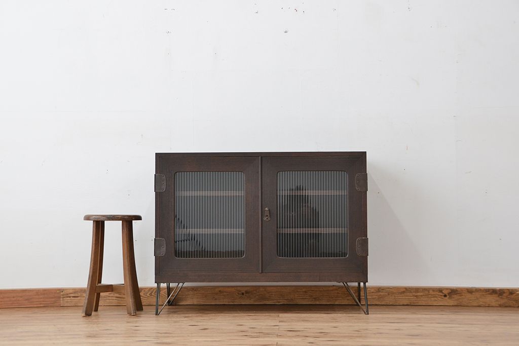 アンティーク 古い木の鉄脚付きモールガラス観音開き収納棚(ローボード)です。