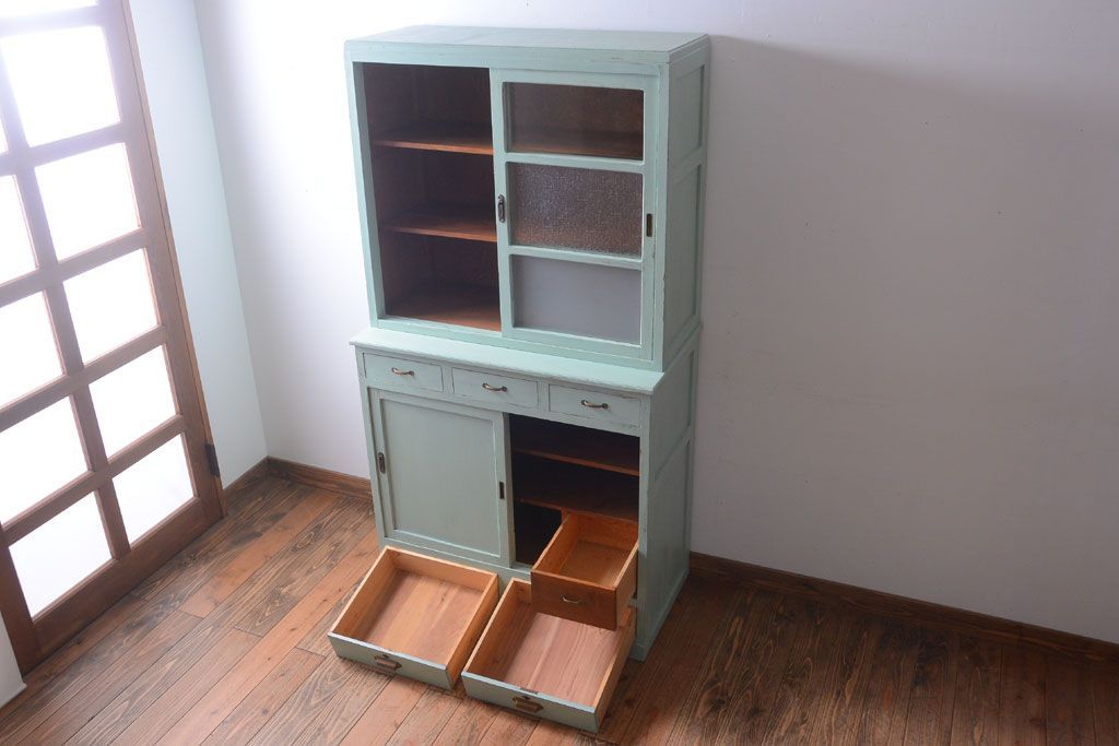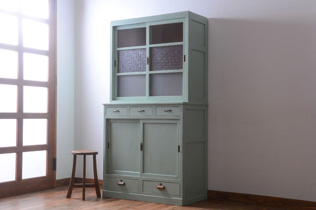 レトロ家具 アンティークペイント かわいいミントグリーンのレトロな食器棚(カップボード)