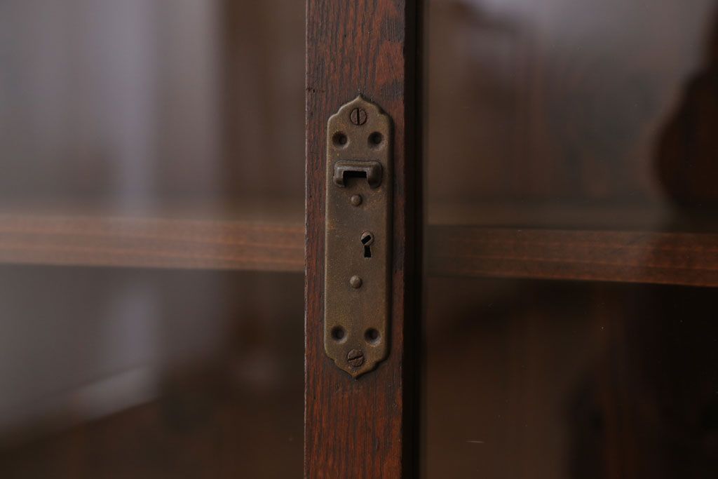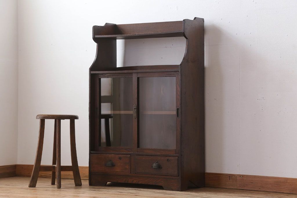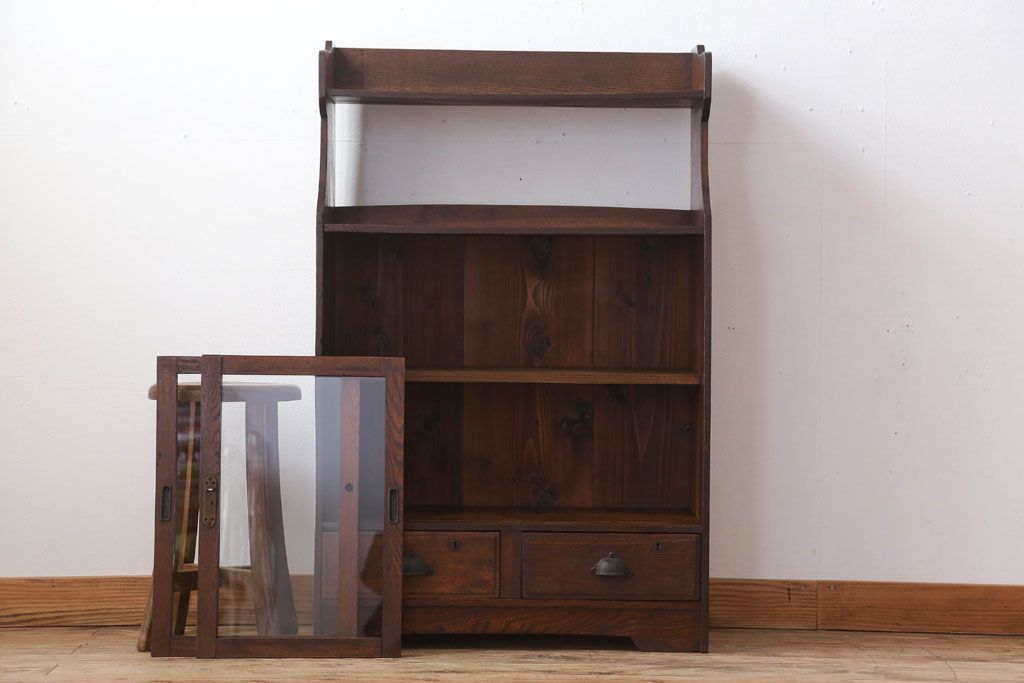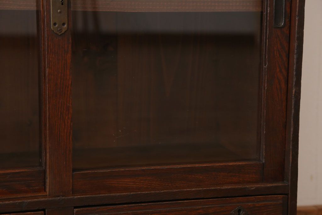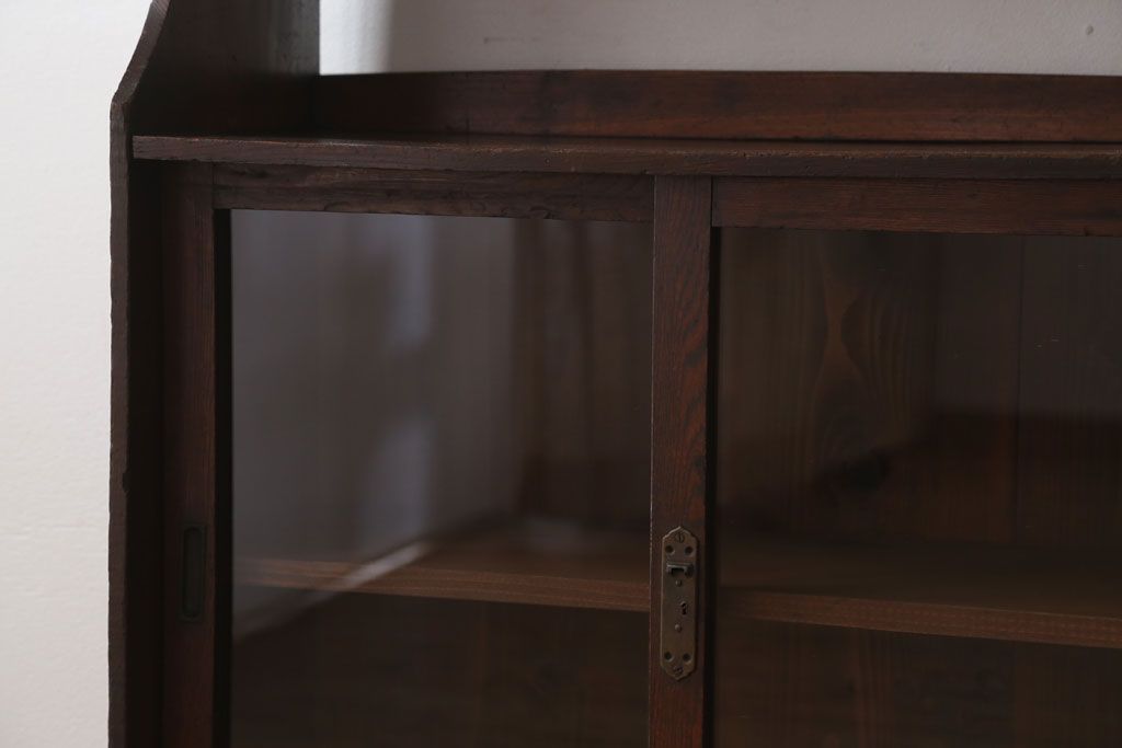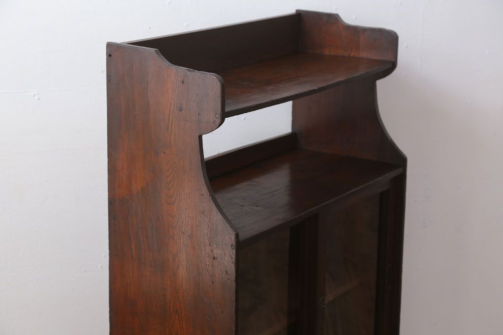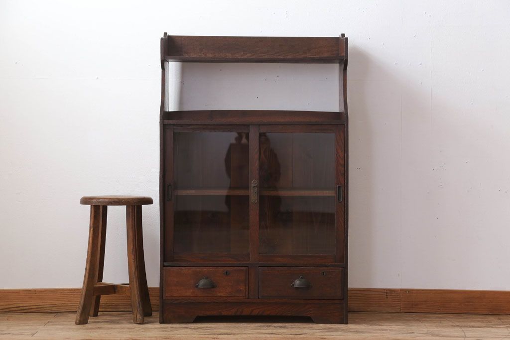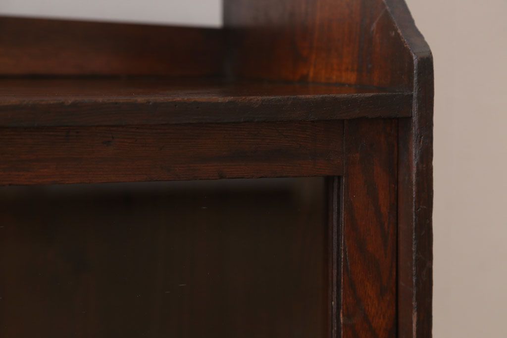 アンティーク家具 アンティーク 飾り棚付き!古い栓材のシンプルな引き戸本箱