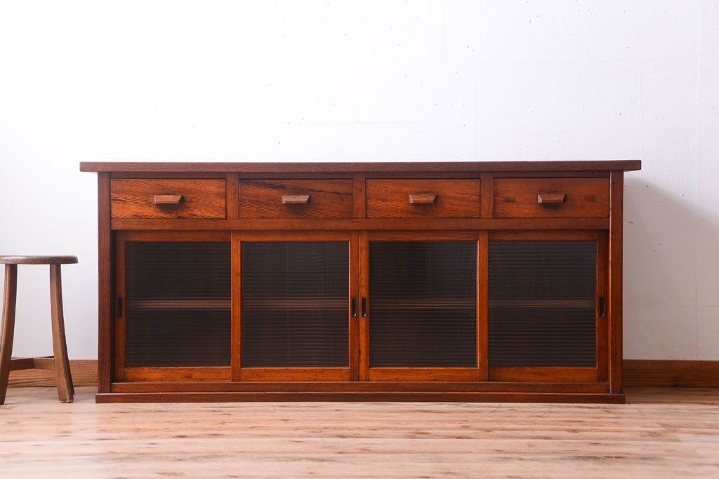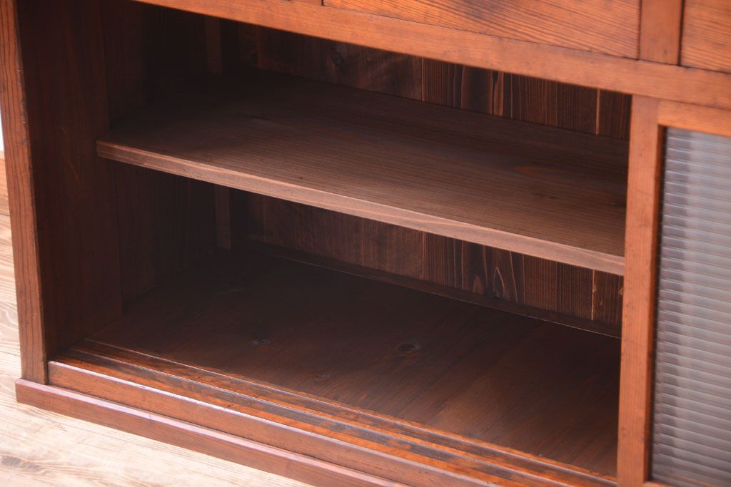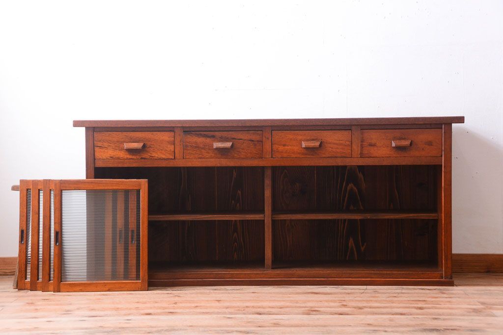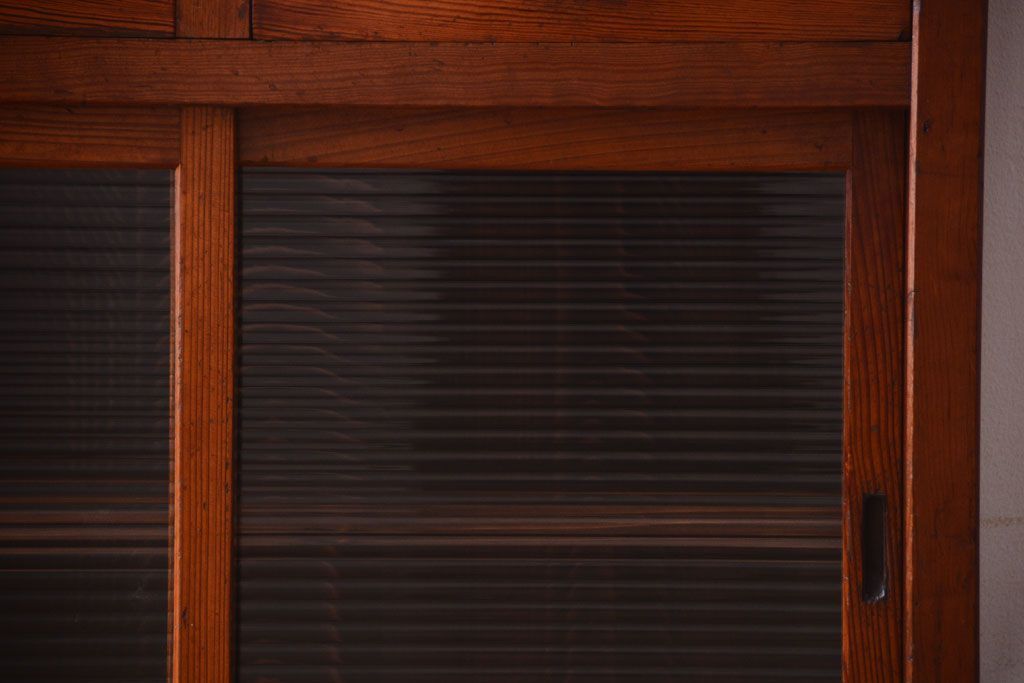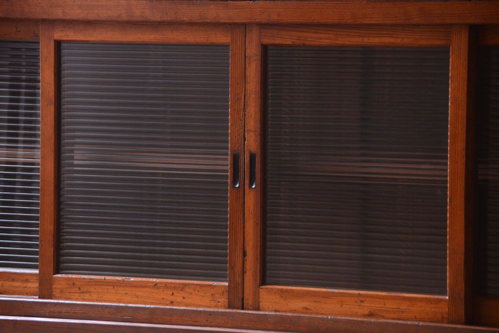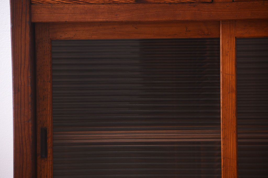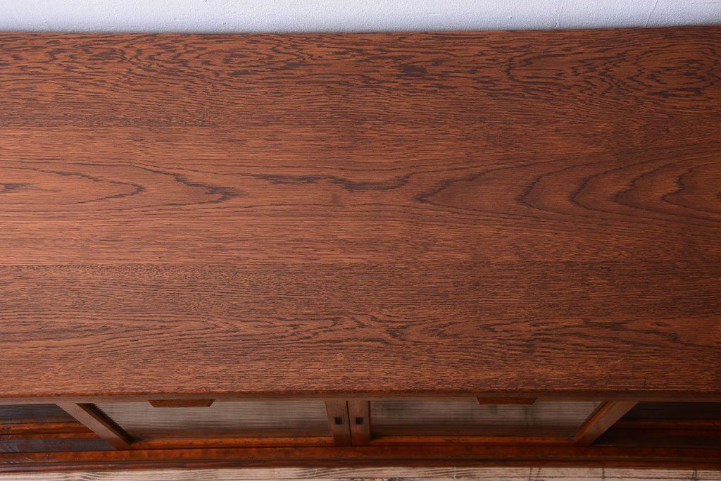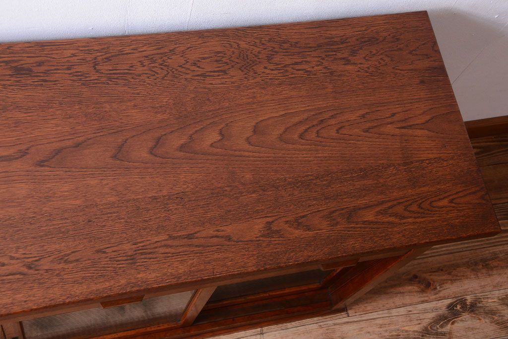 キャビネット・戸棚 > アンティーク家具 ナラ材天板のリメイク品!和製アンティークのモールガラス入り収納棚(戸棚・カウンターテーブル)