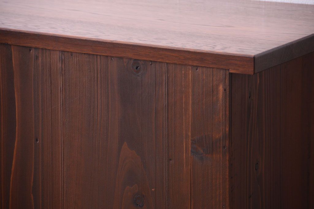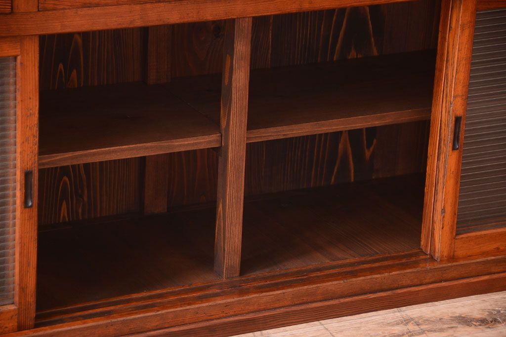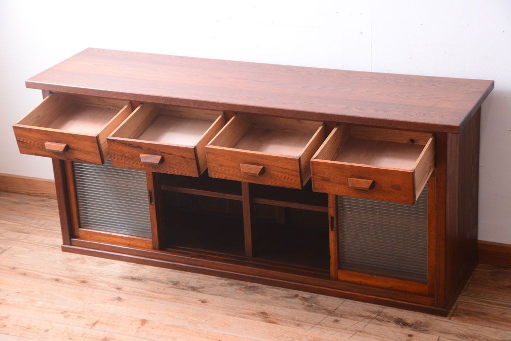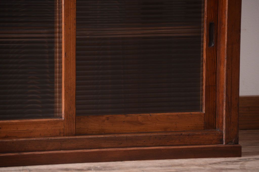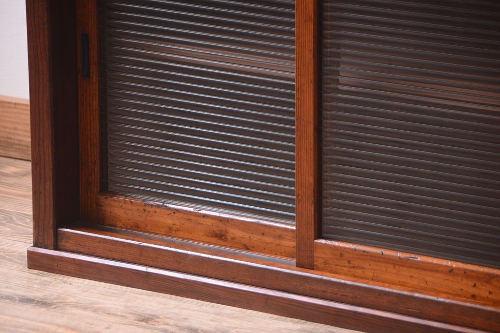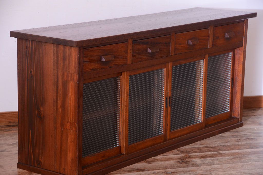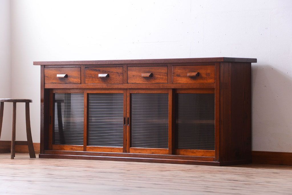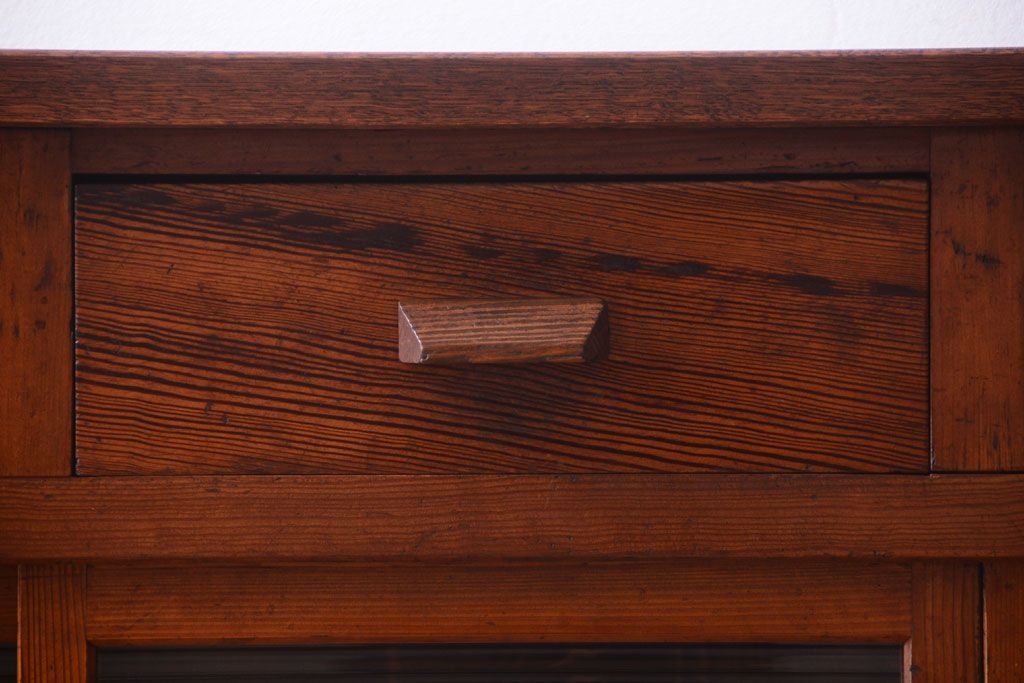 キャビネット・戸棚 > アンティーク家具 ナラ材天板のリメイク品!和製アンティークのモールガラス入り収納棚(戸棚・カウンターテーブル)