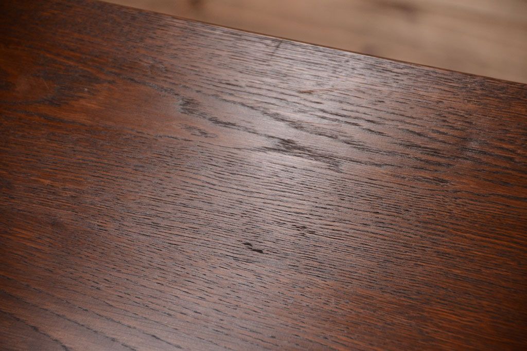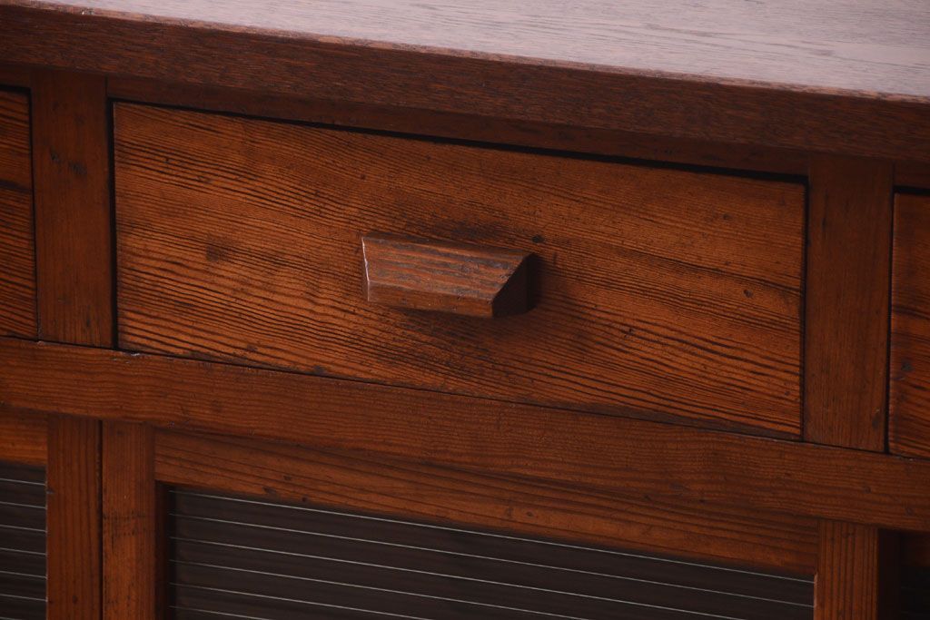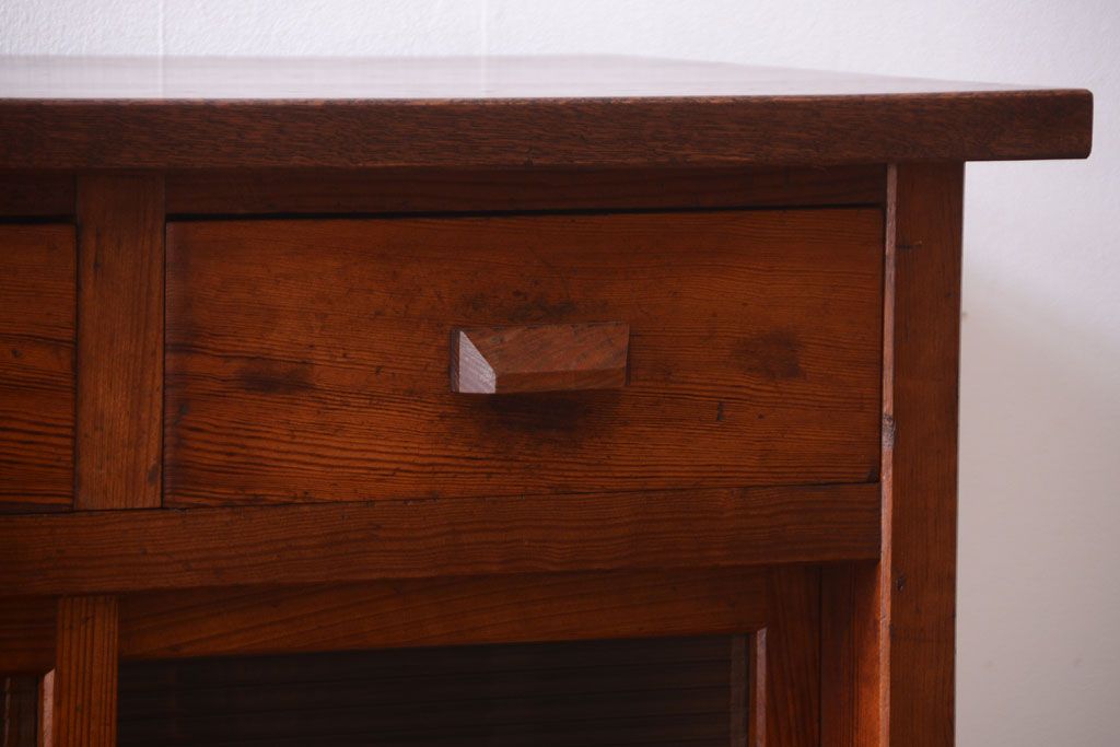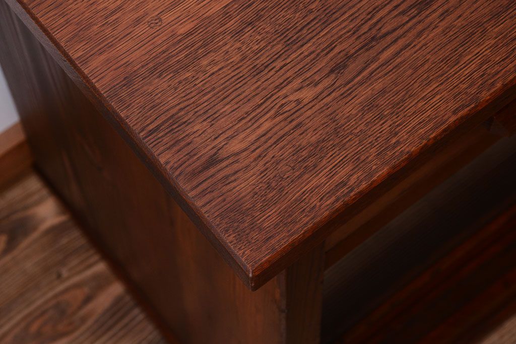 アンティーク家具 ナラ材天板のリメイク品!和製アンティークのモールガラス入り収納棚(戸棚・カウンターテーブル)
