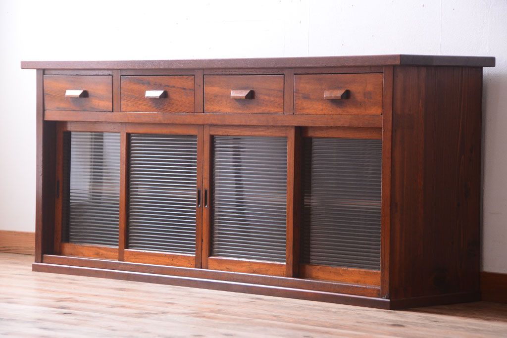 ナラ材天板のリメイク品!和製アンティークのモールガラス入り収納棚(戸棚・カウンターテーブル)です。