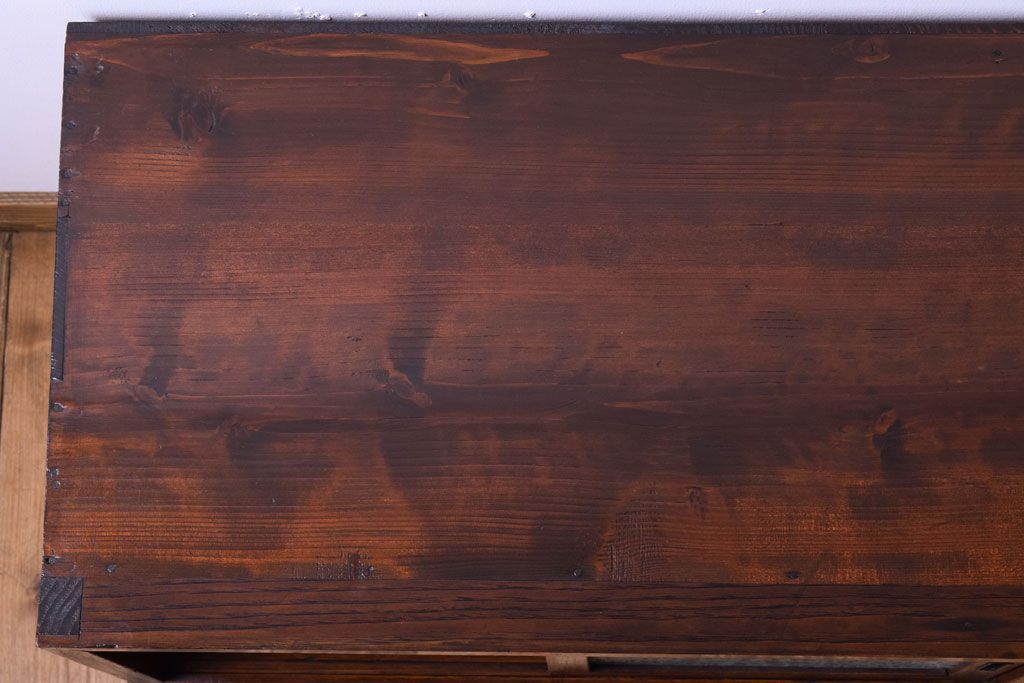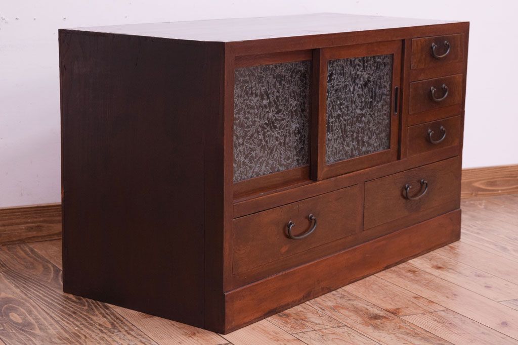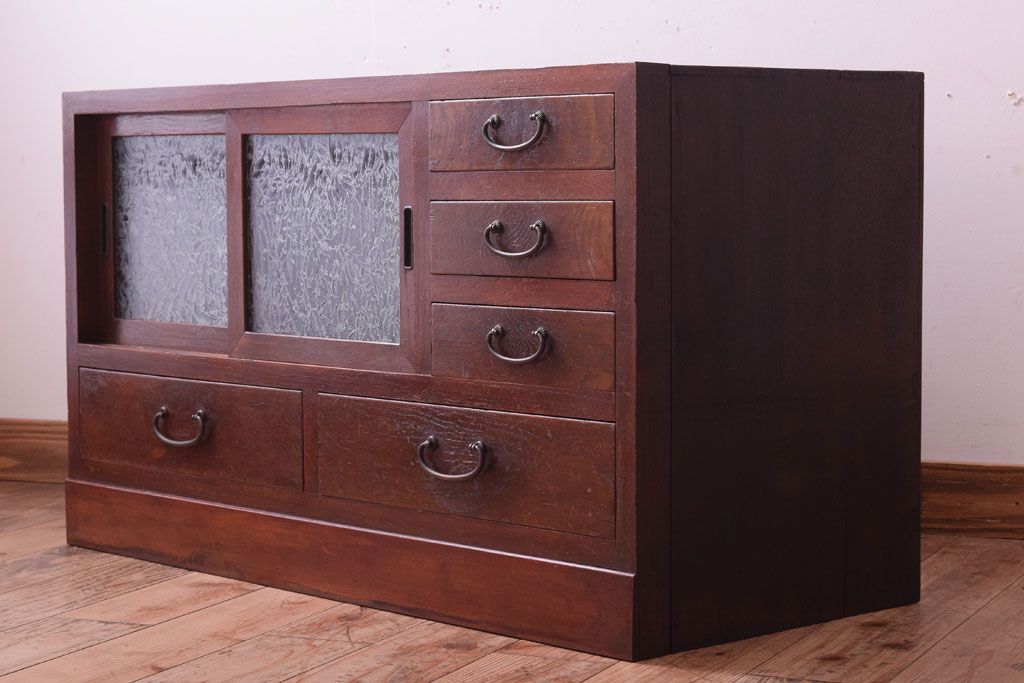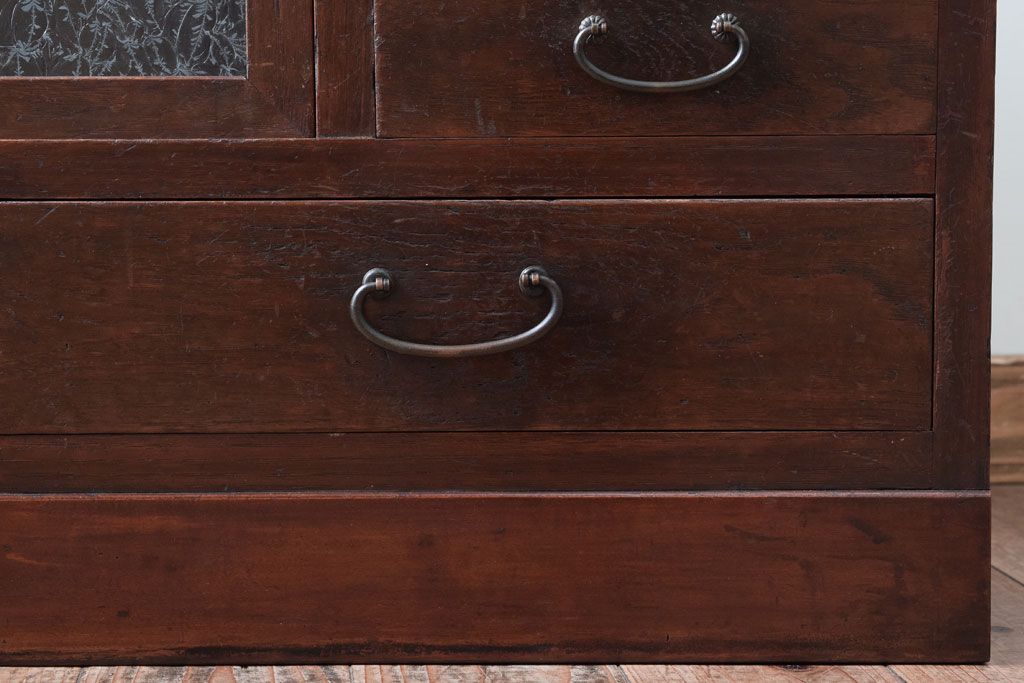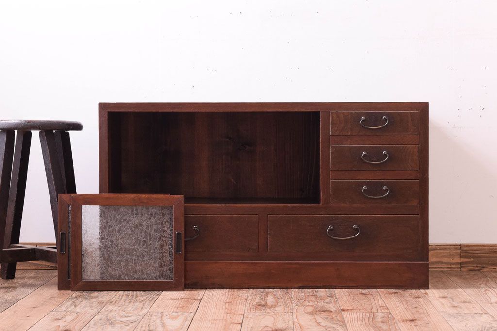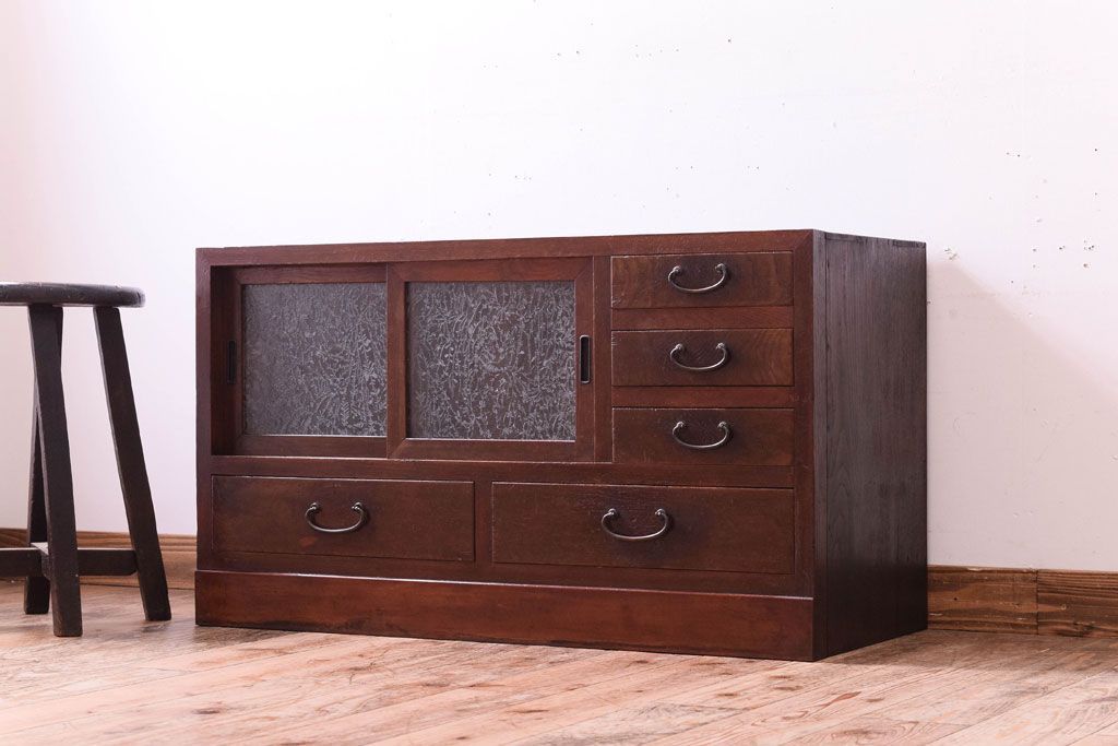 ラフジュ工房> キャビネット・戸棚> テレビ台・ローボード > アンティーク家具 結霜ガラス入り!古い木のアンティークローボード