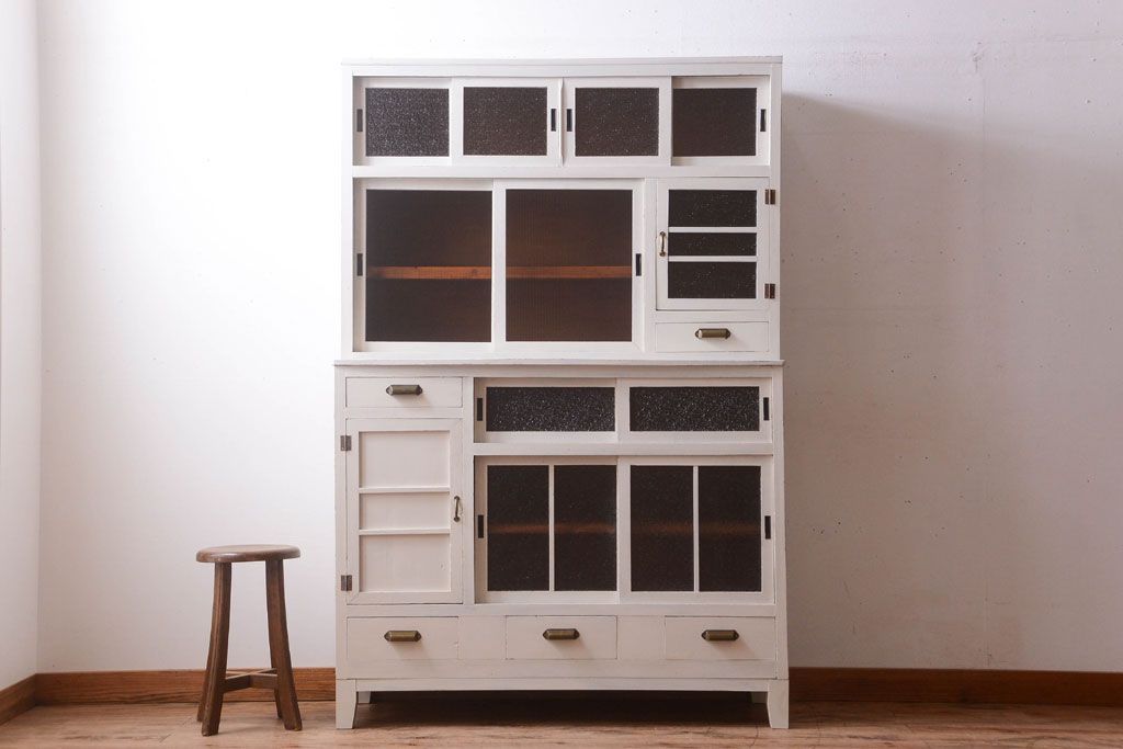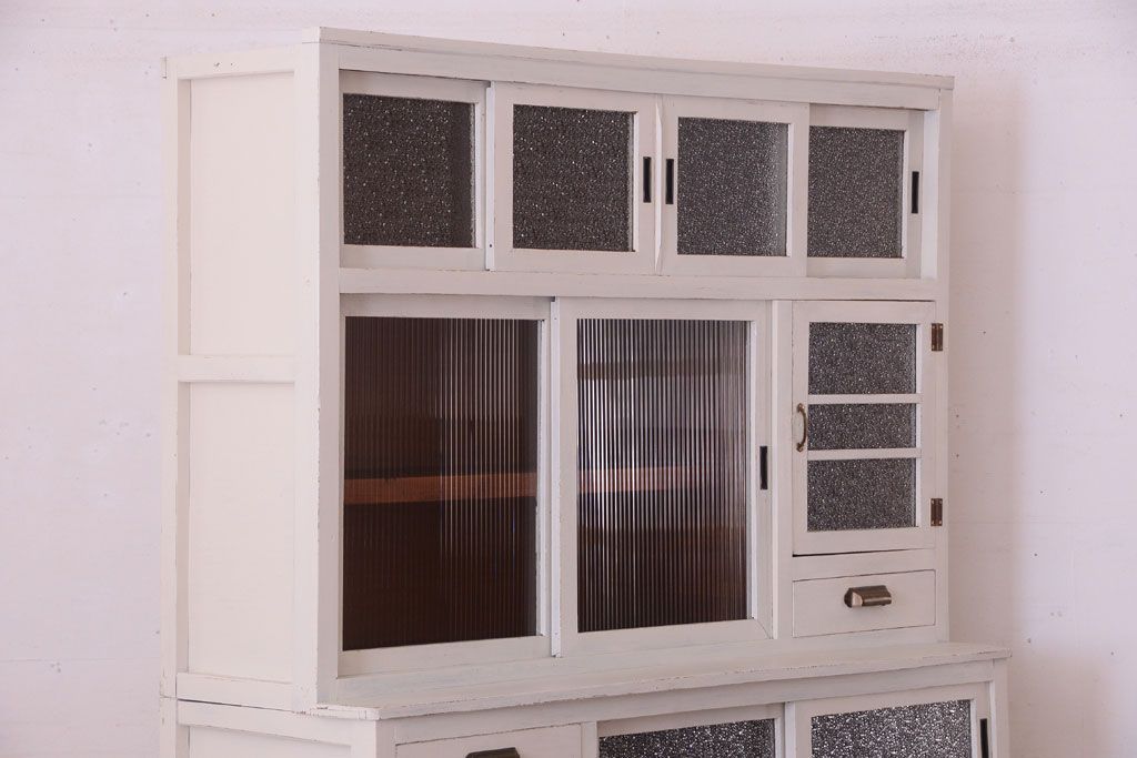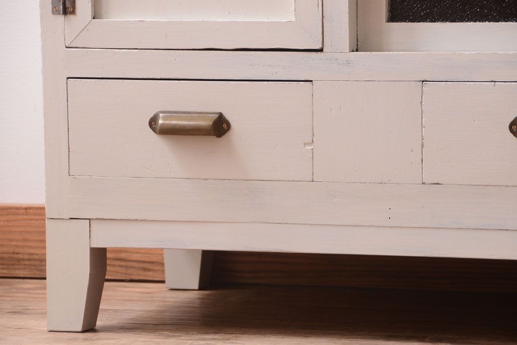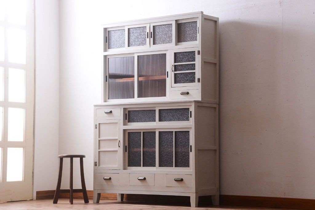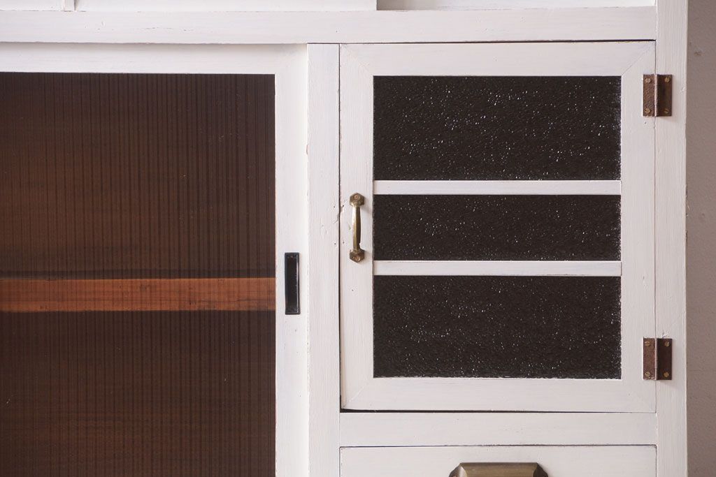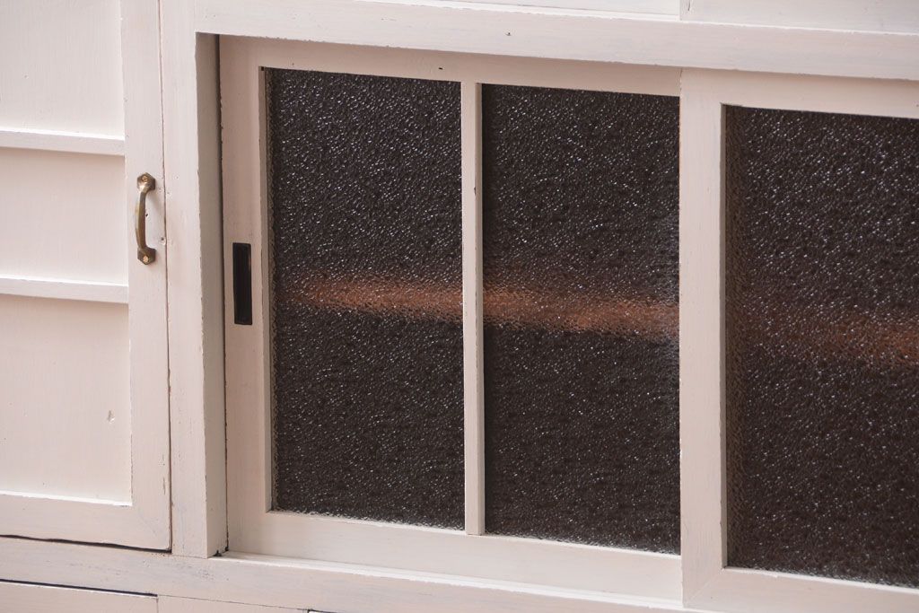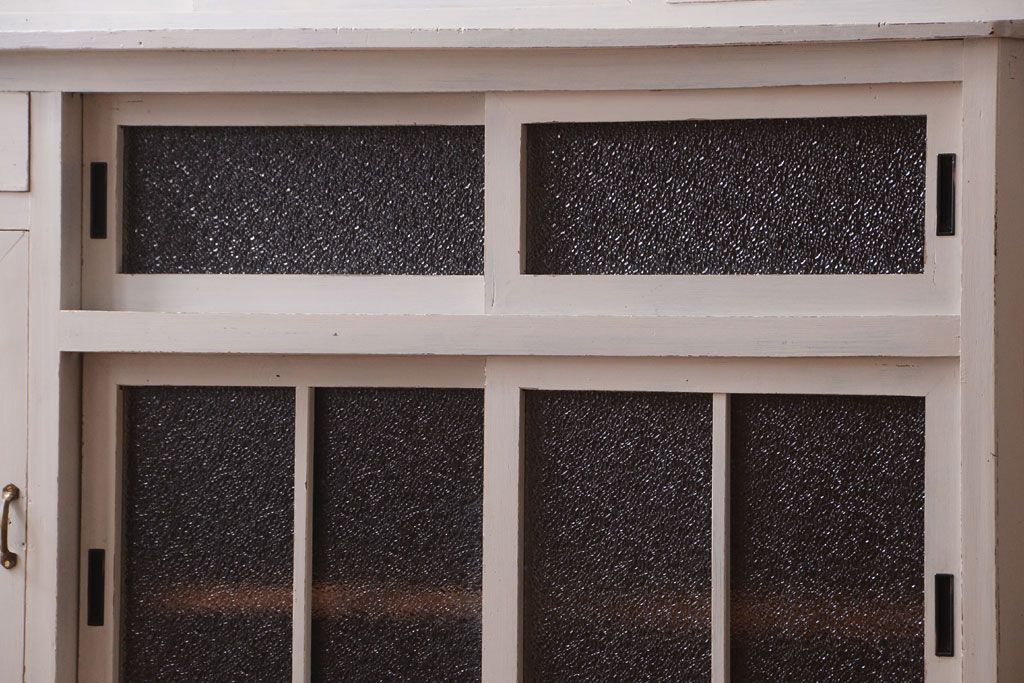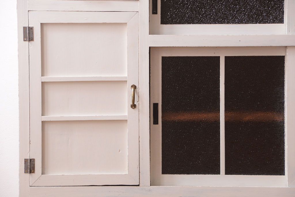 レトロ家具 アンティークペイント ダイヤガラス・モールガラス入り!レトロな食器棚
