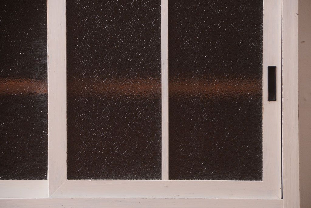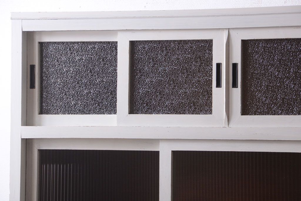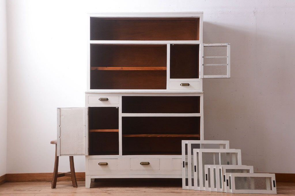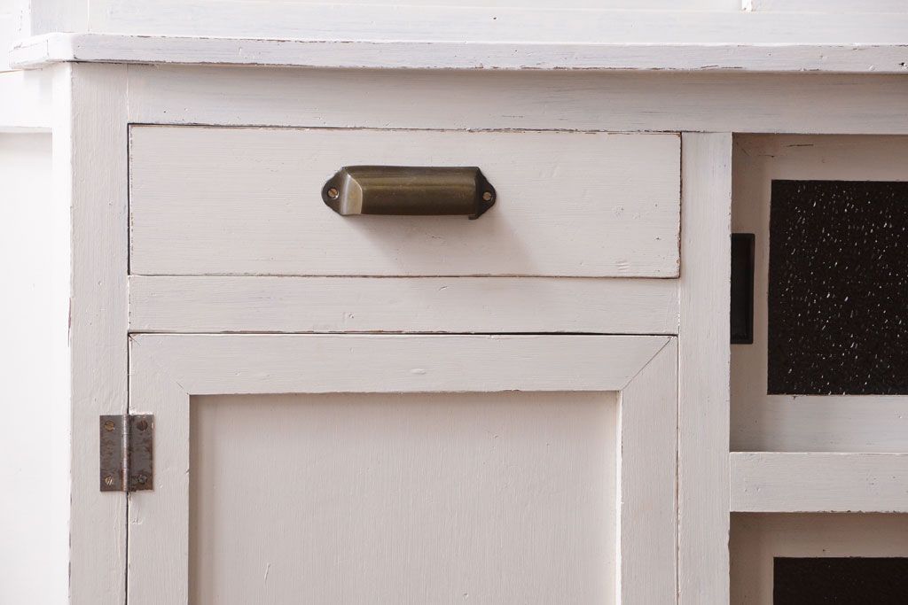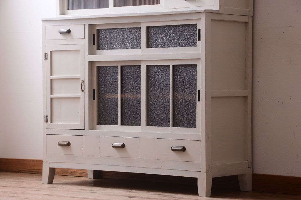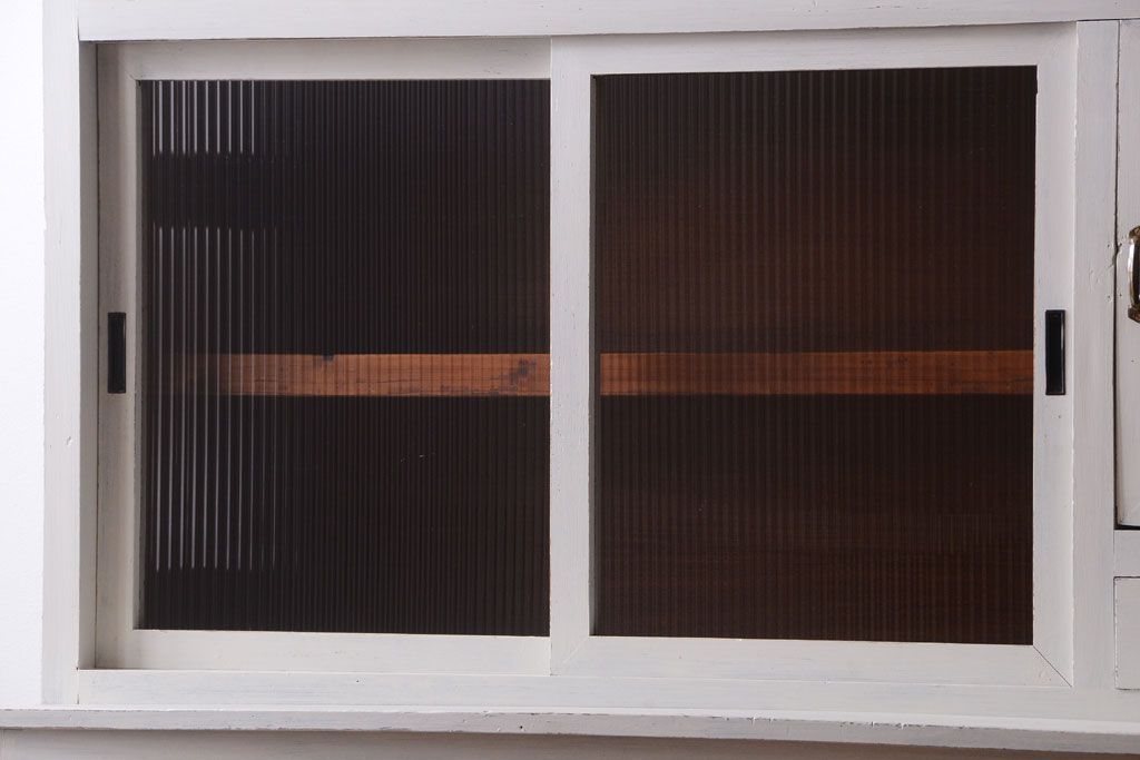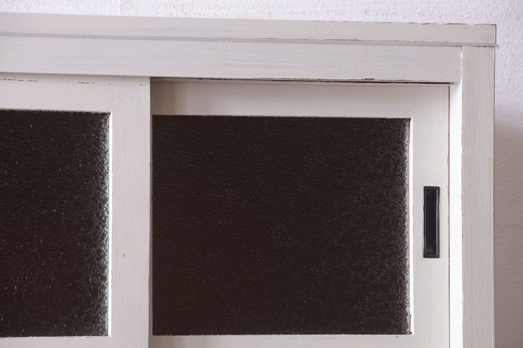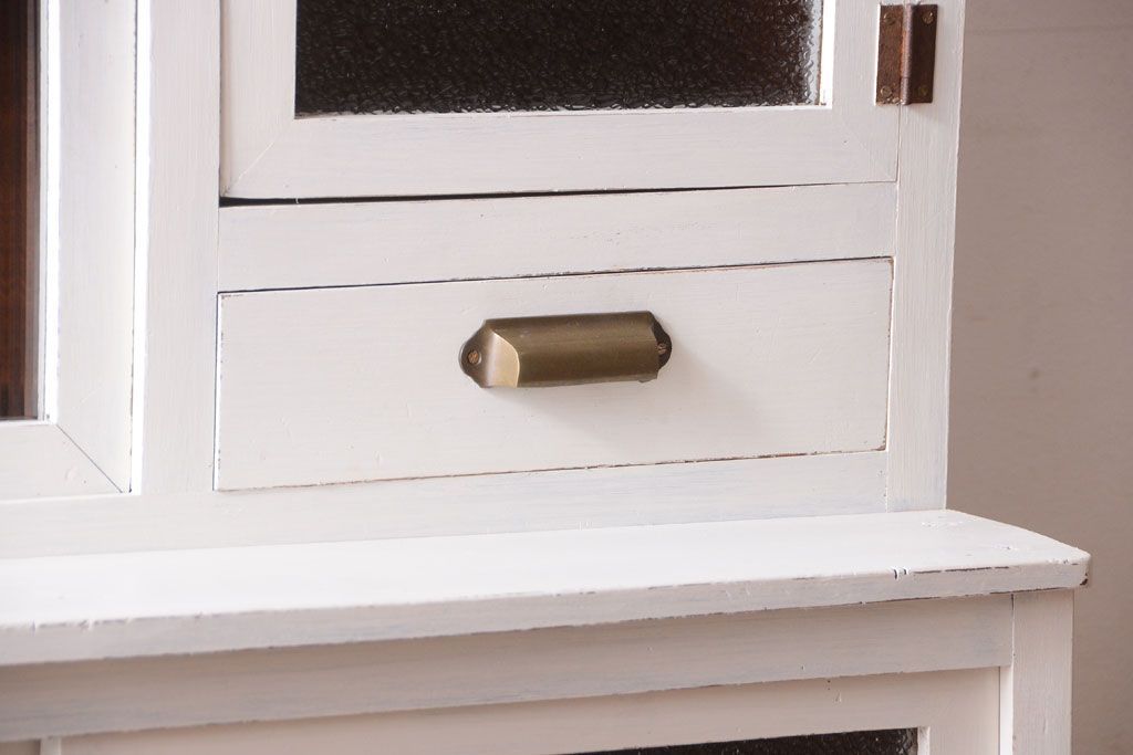 レトロ家具 アンティークペイント ダイヤガラス・モールガラス入り!レトロな食器棚