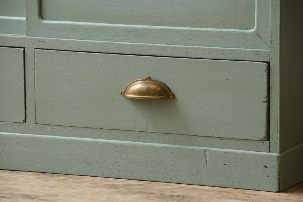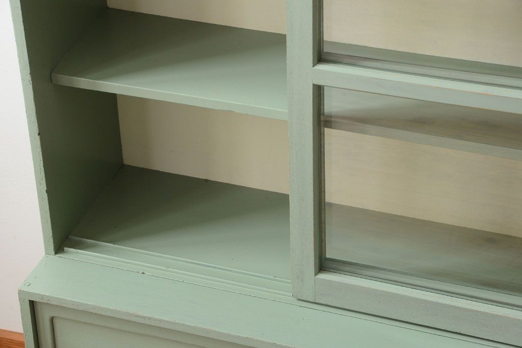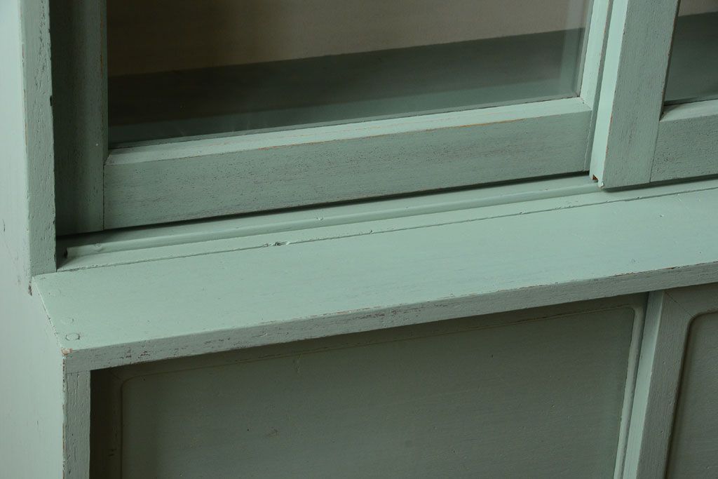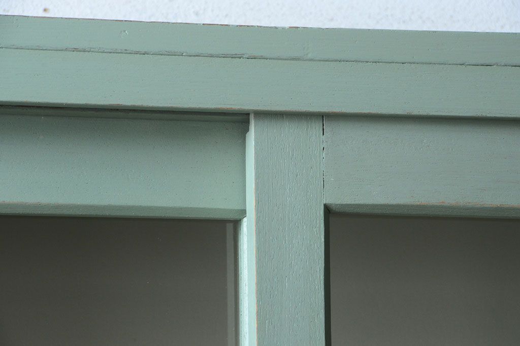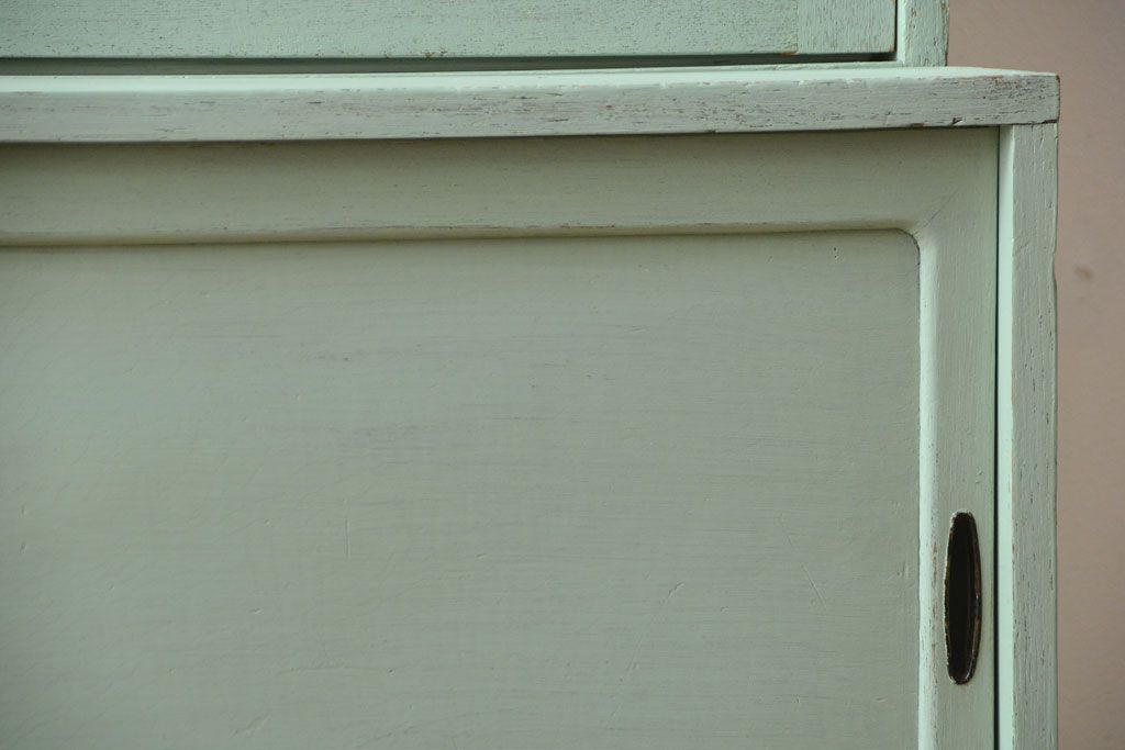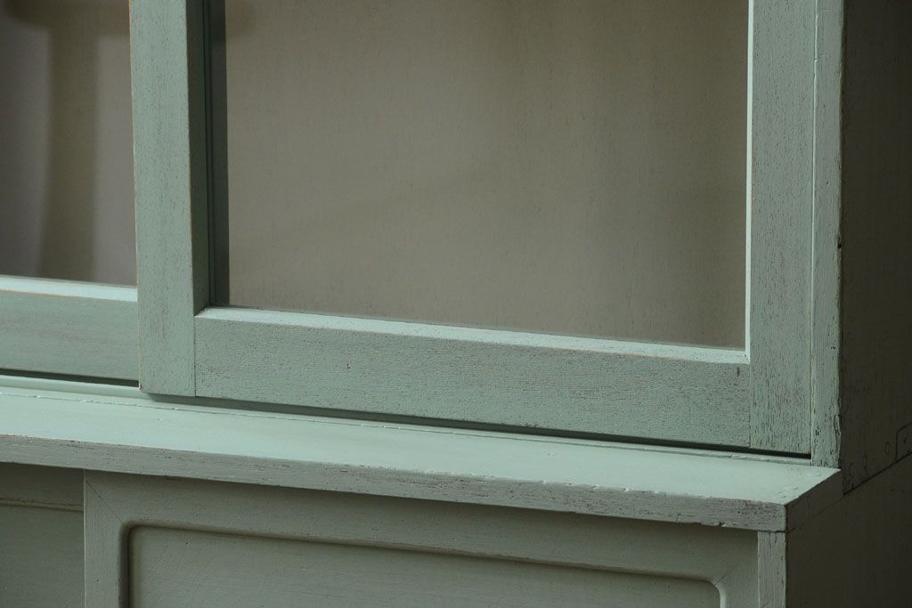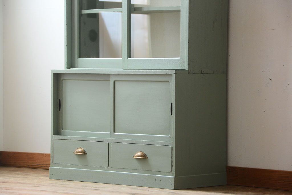 アンティーク家具 くすんだグリーンペイントの重ね収納棚(食器棚)