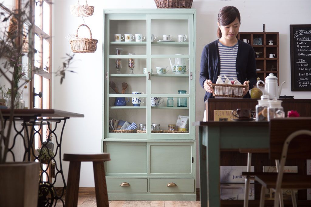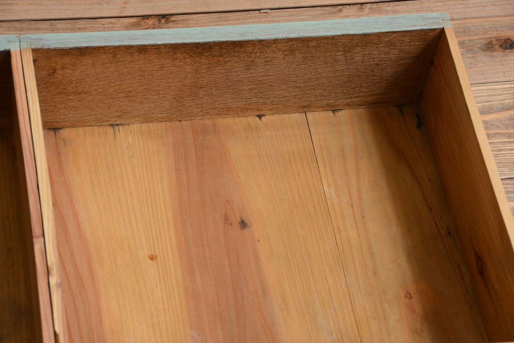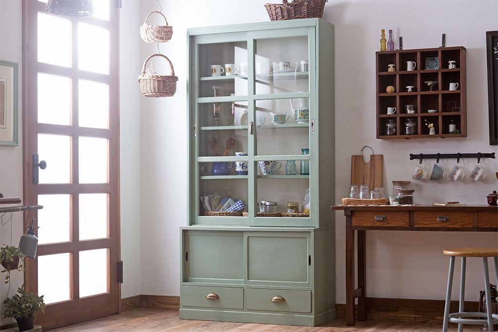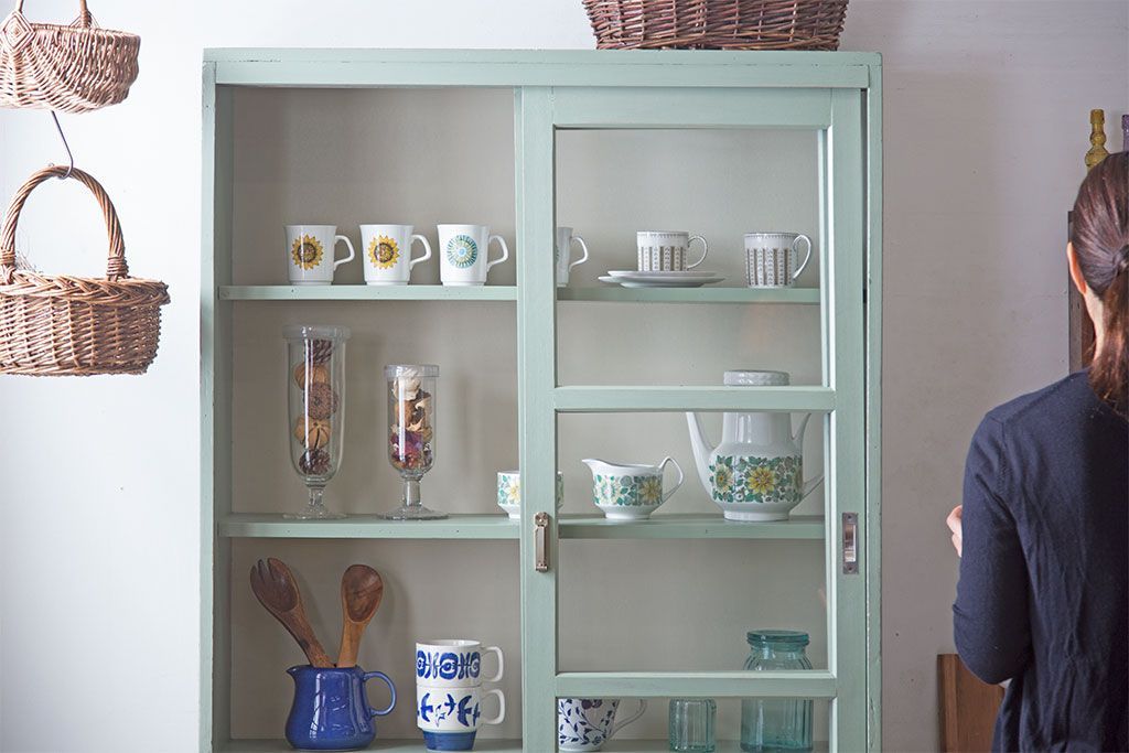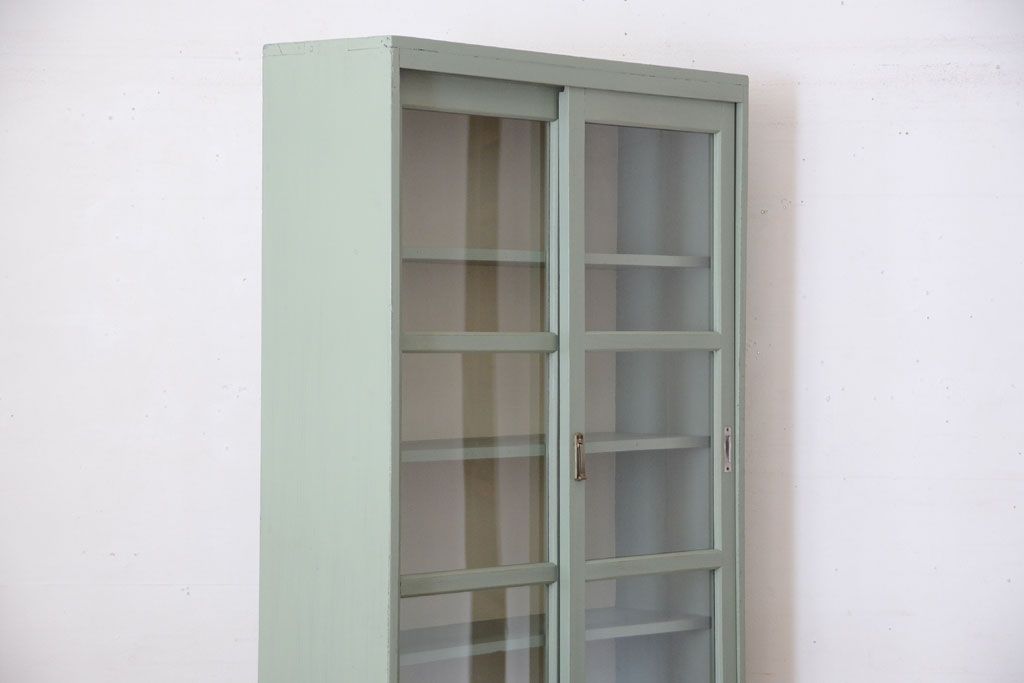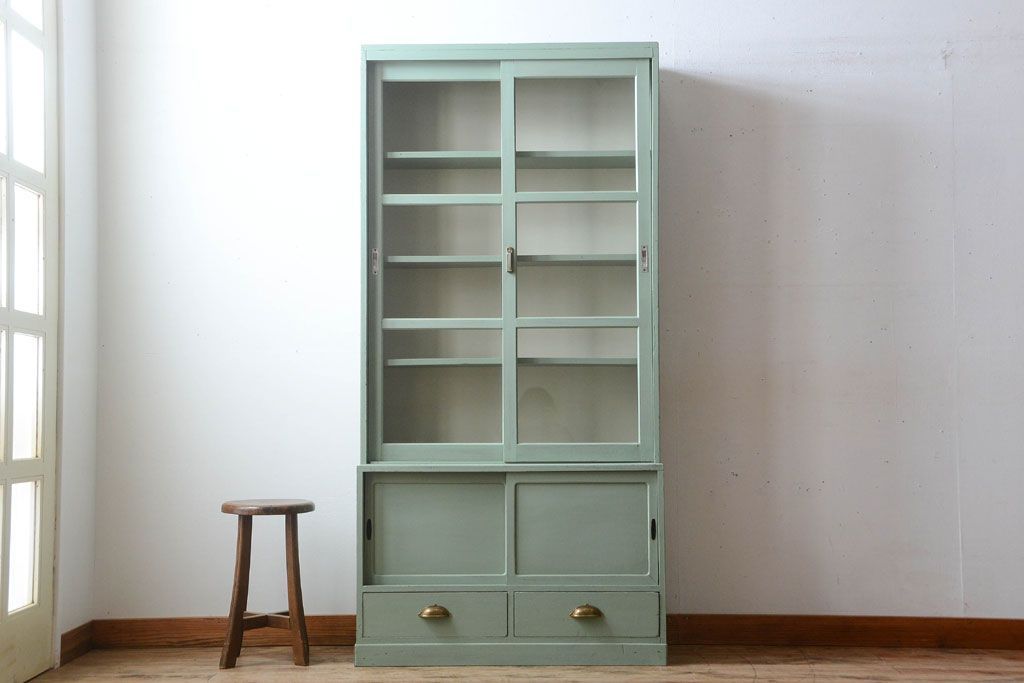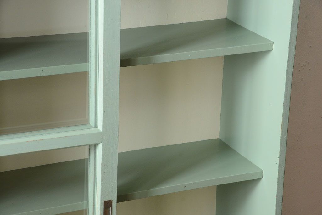 アンティーク家具 くすんだグリーンペイントの重ね収納棚(食器棚)