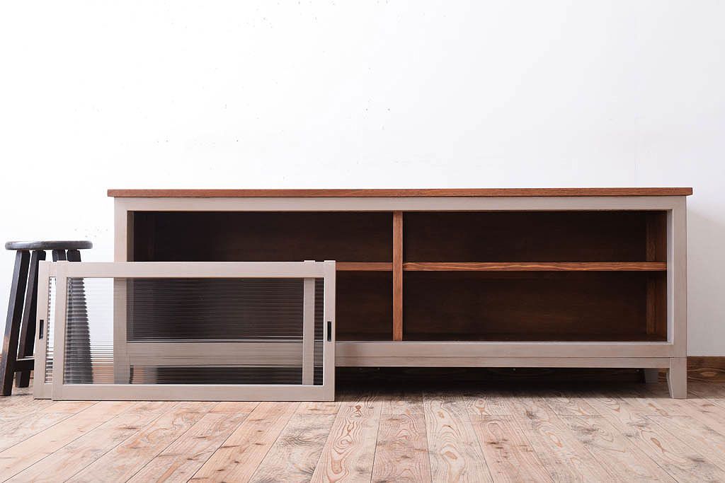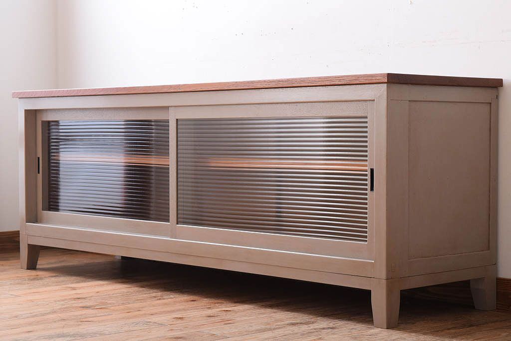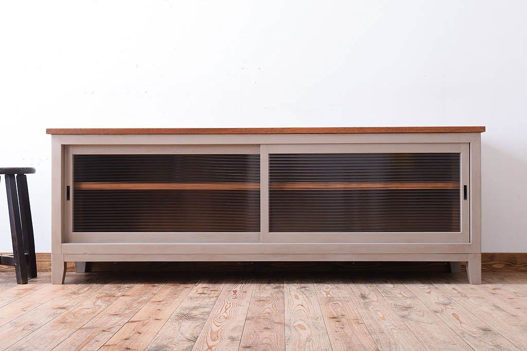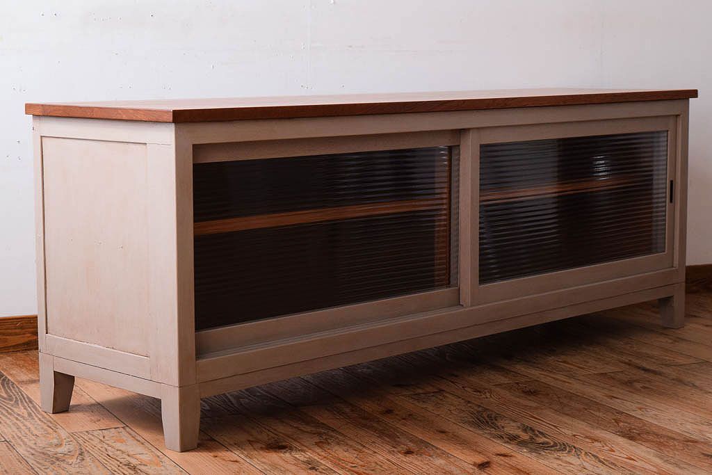 天板オーク材 モールガラス入り!アンティークペイントのローボードです。