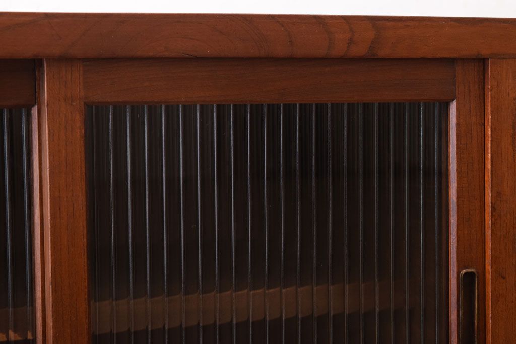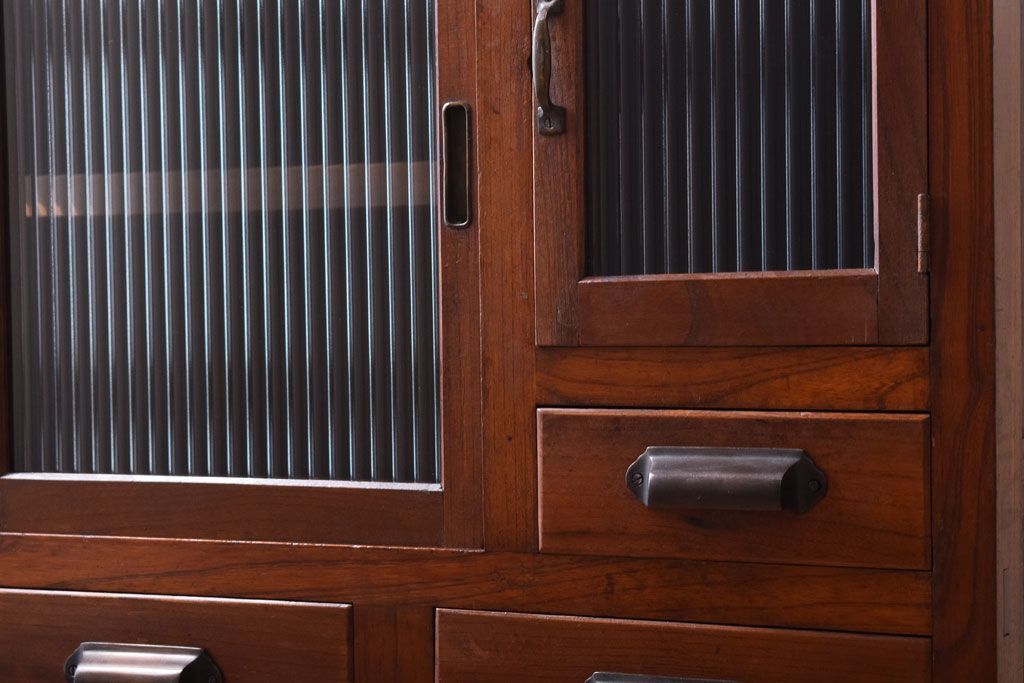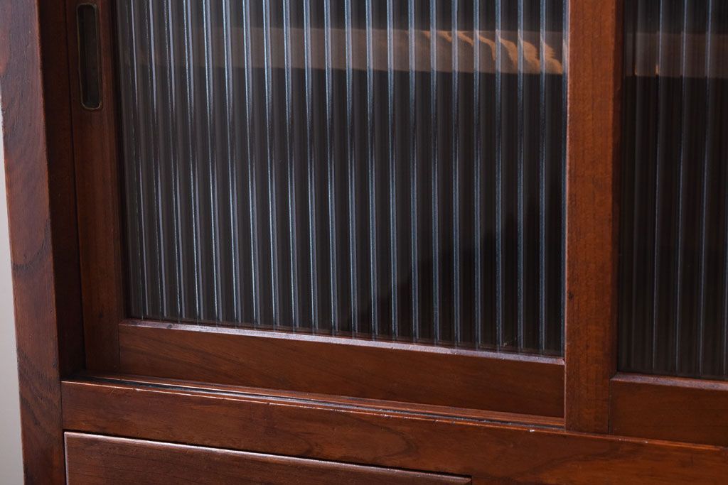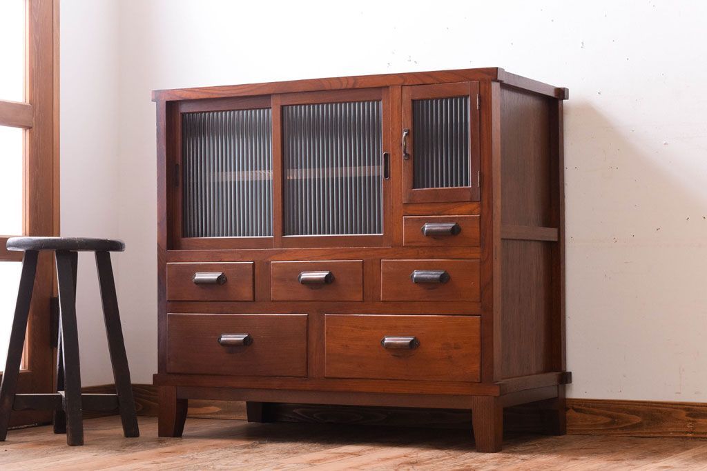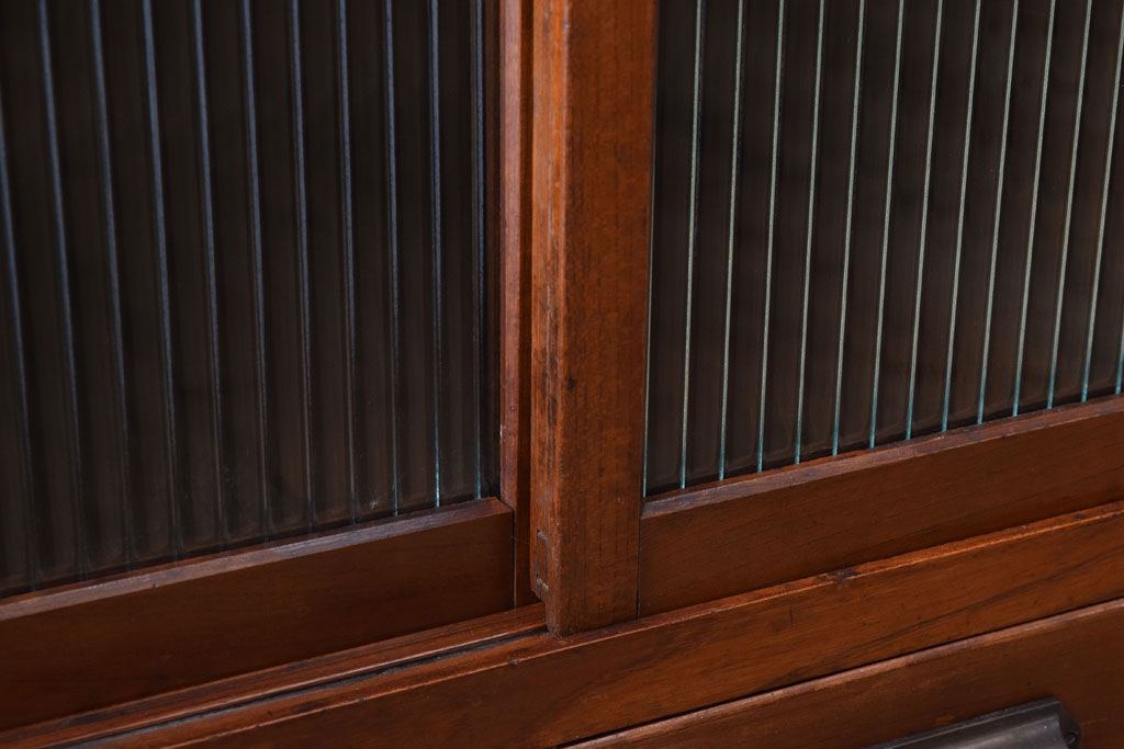 古い木製のレトロな収納棚(モールガラス入り)です。