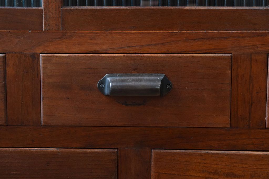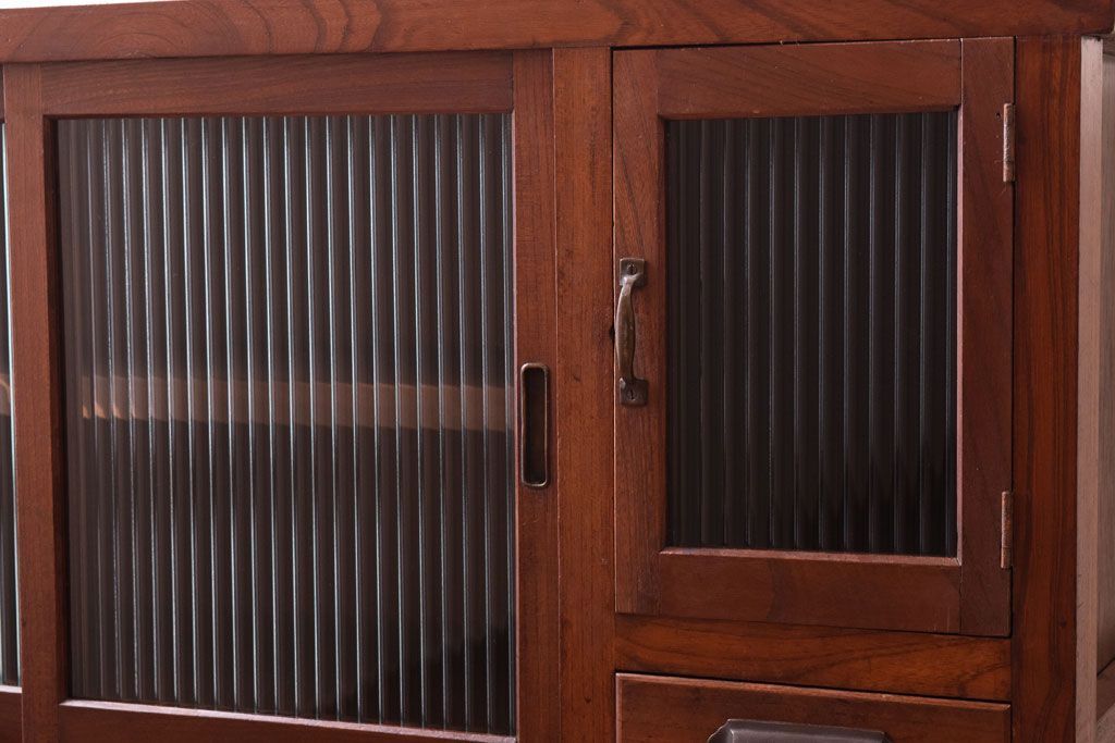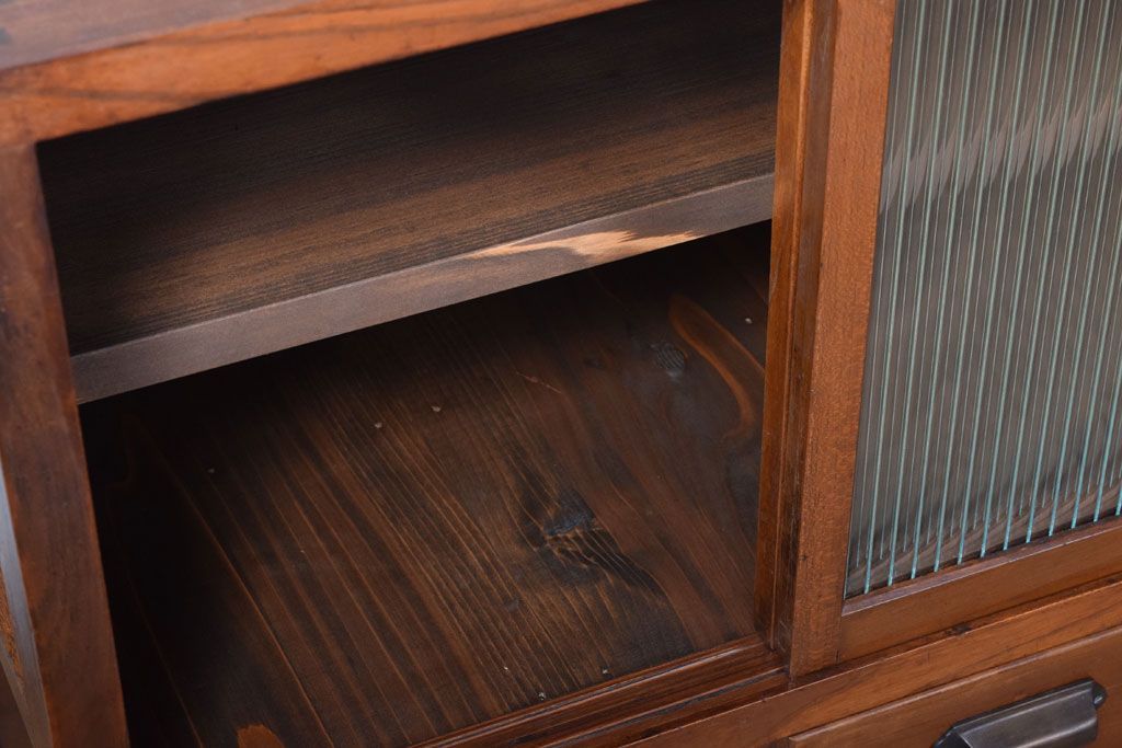 レトロ家具 古い木製のレトロな収納棚(モールガラス入り)
