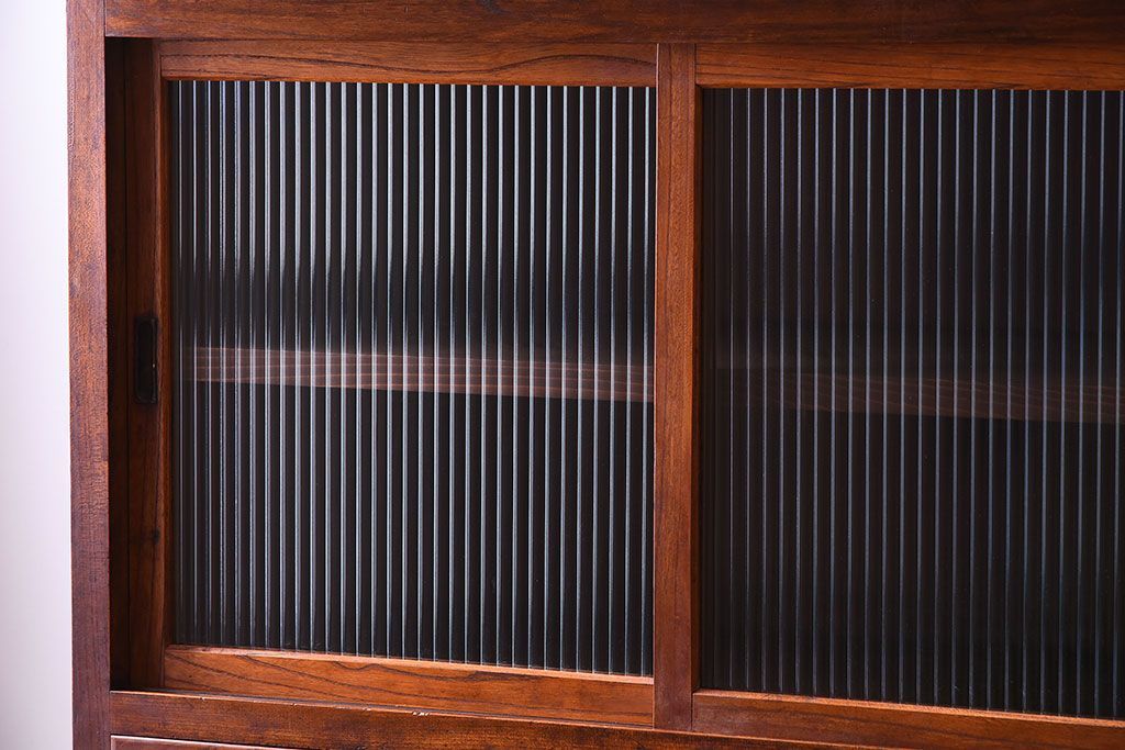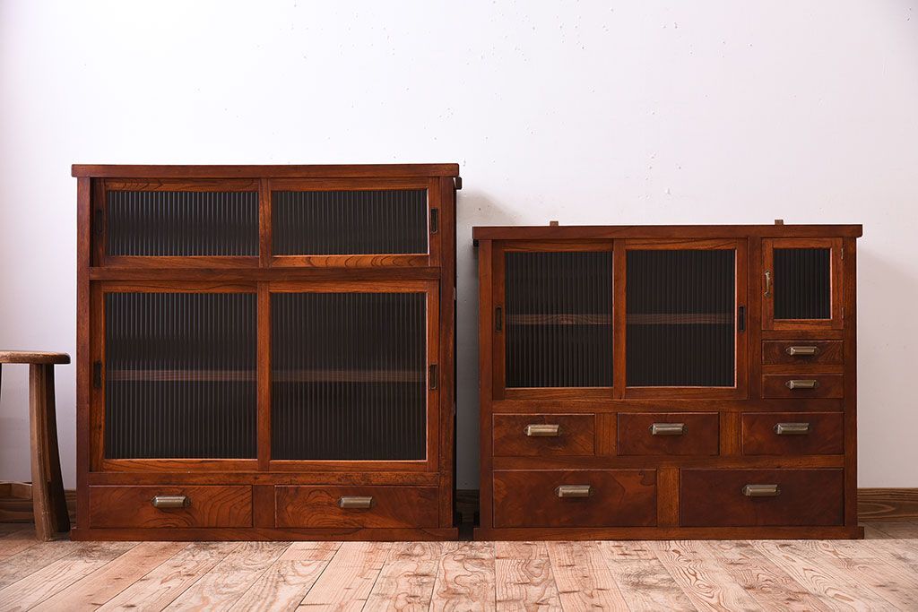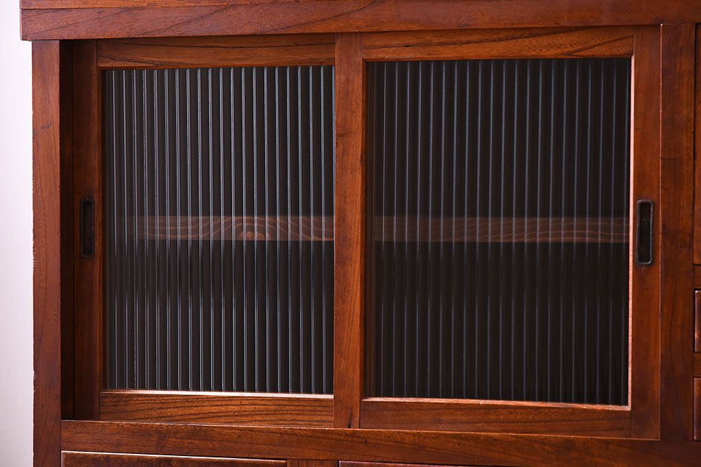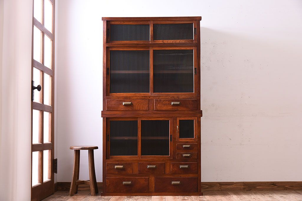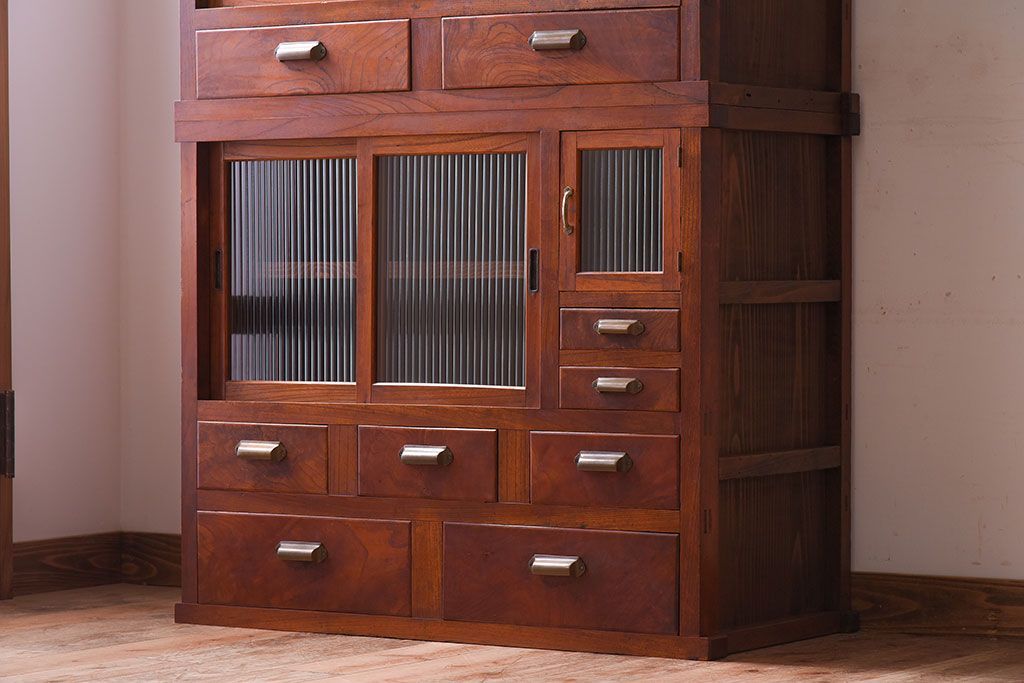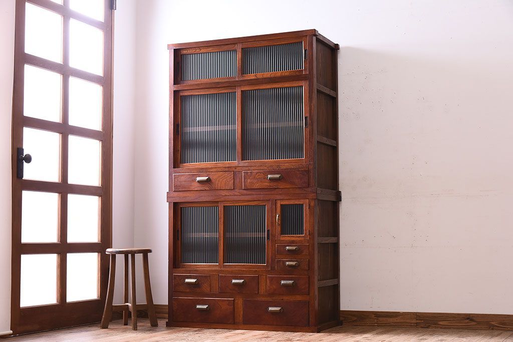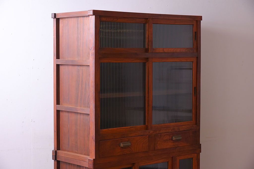 アンティーク家具 和製アンティーク 前面欅材!モールガラス引き戸の重ね食器棚(収納棚)