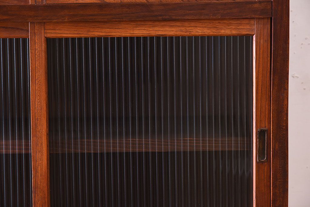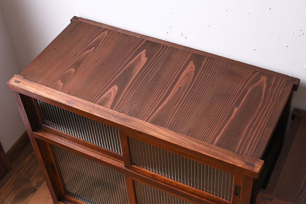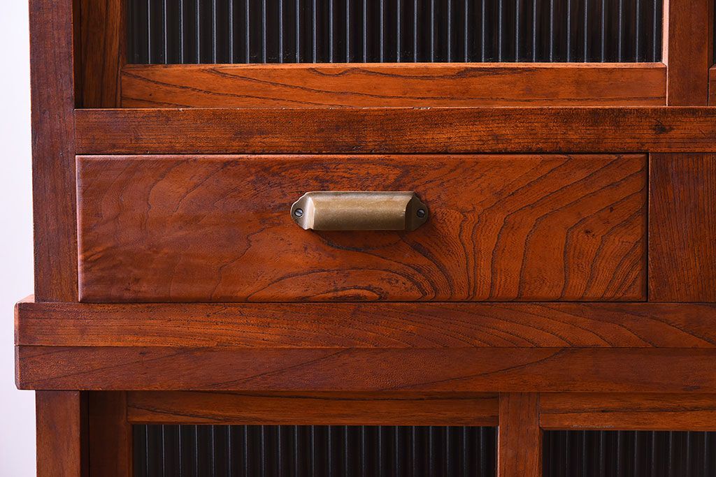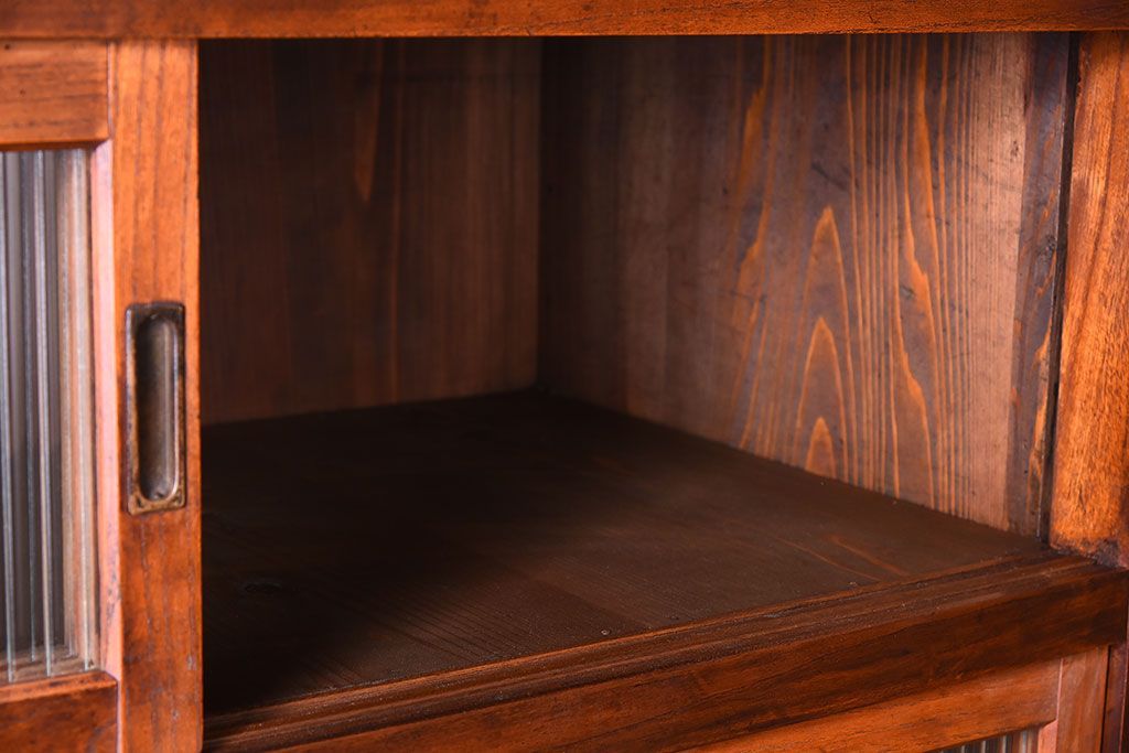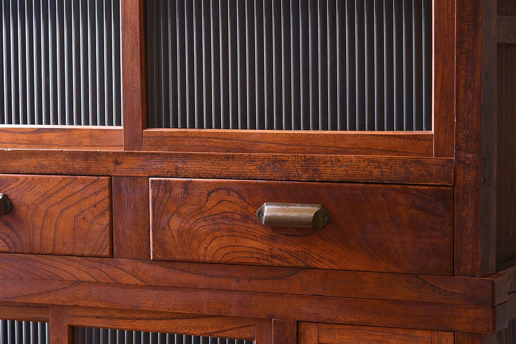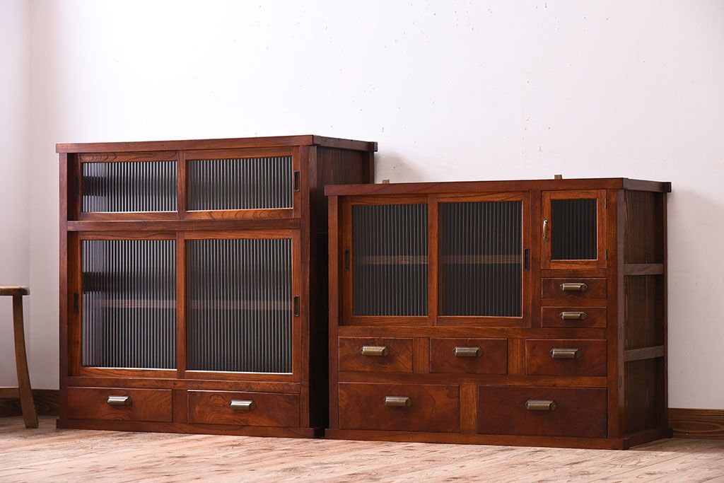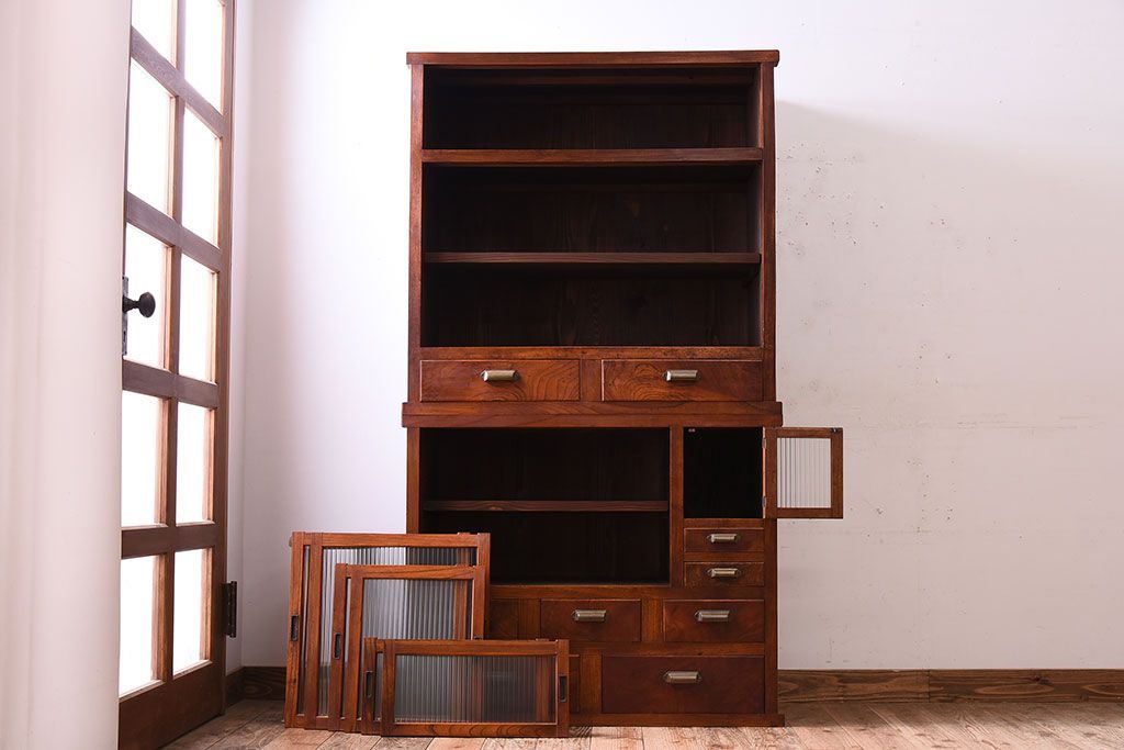 アンティーク家具 和製アンティーク 前面欅材!モールガラス引き戸の重ね食器棚(収納棚)